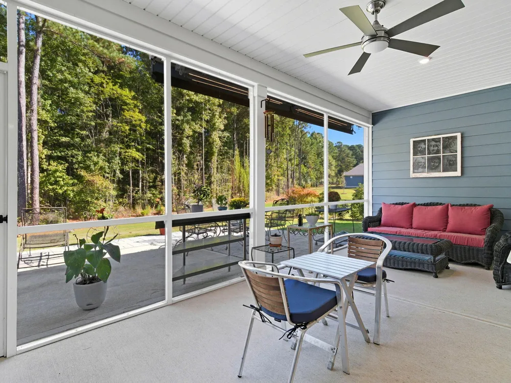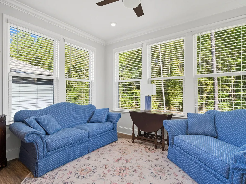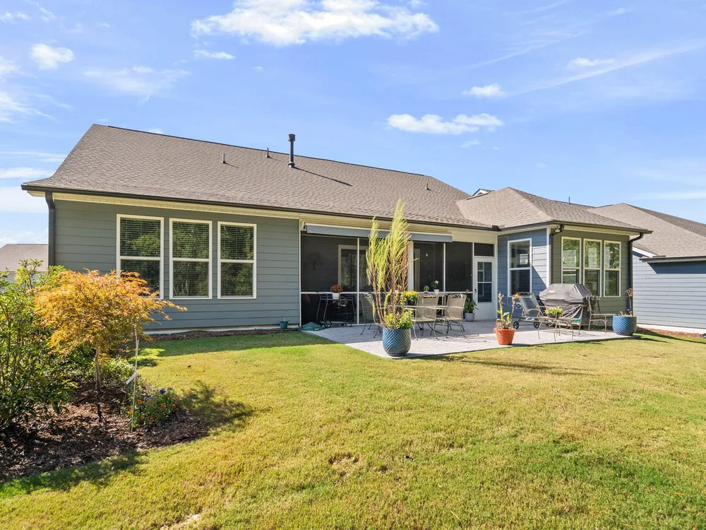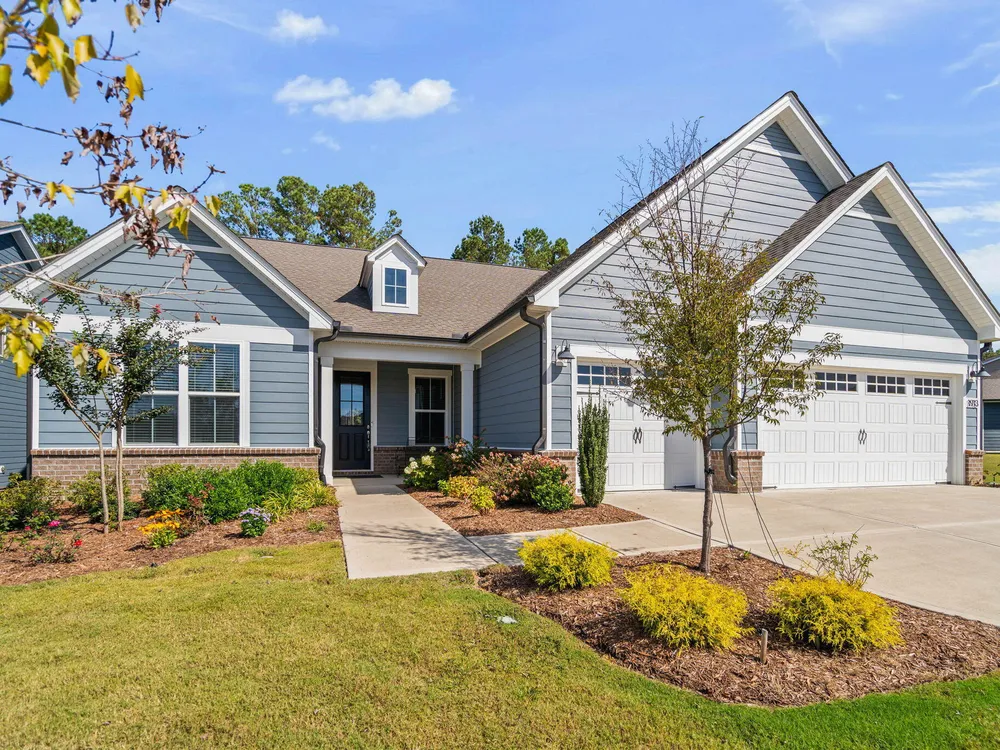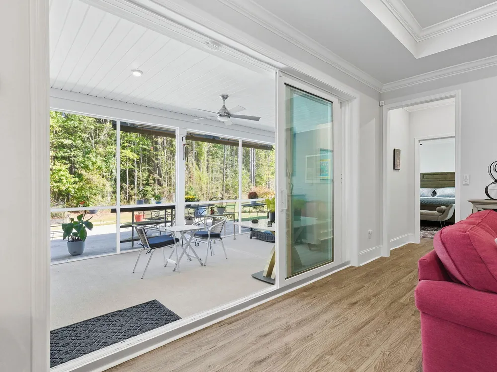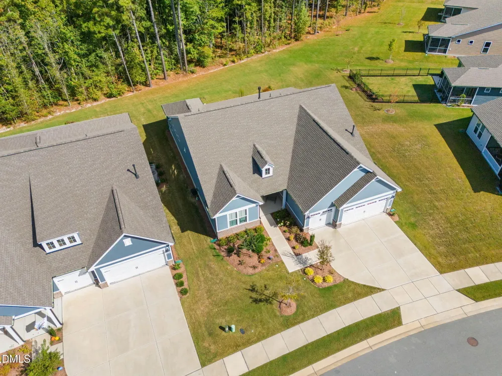 Located in the desirable 55+ community of Carolina Gardens by Del Webb, this beautifully appointed Stellar plan offers a refined blend of comfort and style. The gourmet kitchen features quartz countertops, soft-close cabinetry, double ovens, a gas cooktop, and a spacious pantry. The open design includes wider walkways, a bright sunroom that provides excellent flex space, and a great room ideal for everyday living. The primary suite offers natural light, wooded views, a zero-entry shower with seat and grab bars, and a large custom walk-in closet. Two additional bedrooms, each with access to a full bath, plus a dedicated office, allow for privacy and flexibility. Enjoy outdoor living on the screened porch or extended patio, featuring a remote-controlled Marygrove retractable awning with integrated lighting. Thoughtful landscaping enhances privacy along the back patio, creating a peaceful setting for relaxation or entertaining. The 3-car garage provides additional space for a golf cart, workshop, or storage, and a 17-zone underground sprinkler system helps maintain the lush landscaping year-round. Conveniently situated near both downtown Fuquay and Varina, with easy access to local shops, dining, Raleigh, and RDU. Carolina Gardens amenities support an active, resort-style 55+ lifestyle: a stunning 20,500 sq. ft. clubhouse with multi-purpose rooms, community kitchen/café and ample gathering spaces; a fitness center with aerobics studio; indoor and outdoor pools plus a hot tub; four pickleball courts and a tennis court; community gardens, lush parks and a dog park; and an on-site lifestyle director who organizes events, classes and activities. Age rule: at least one resident must be 55 or older; children aged 19+ may be permanent residents provided the community's 55+ requirement is met.