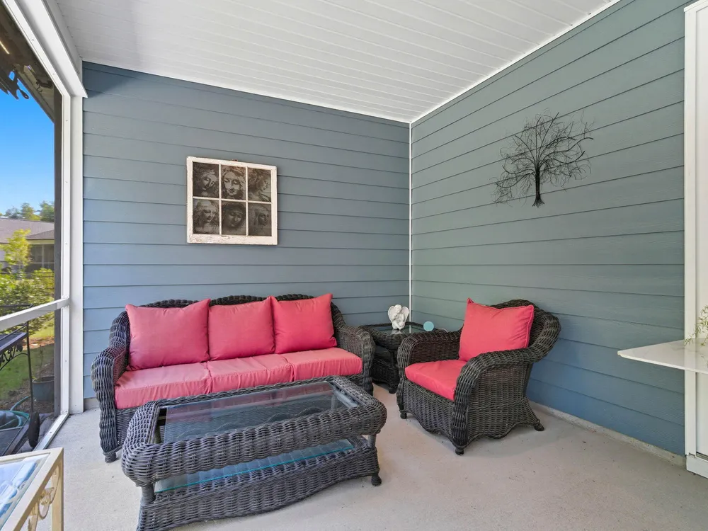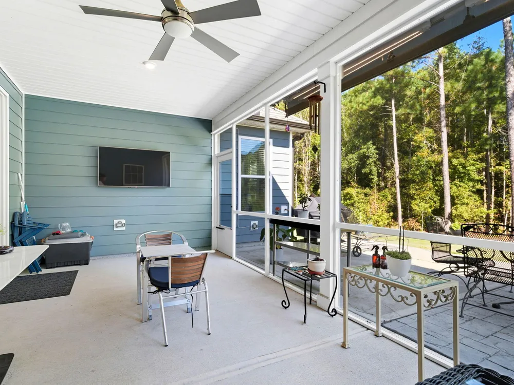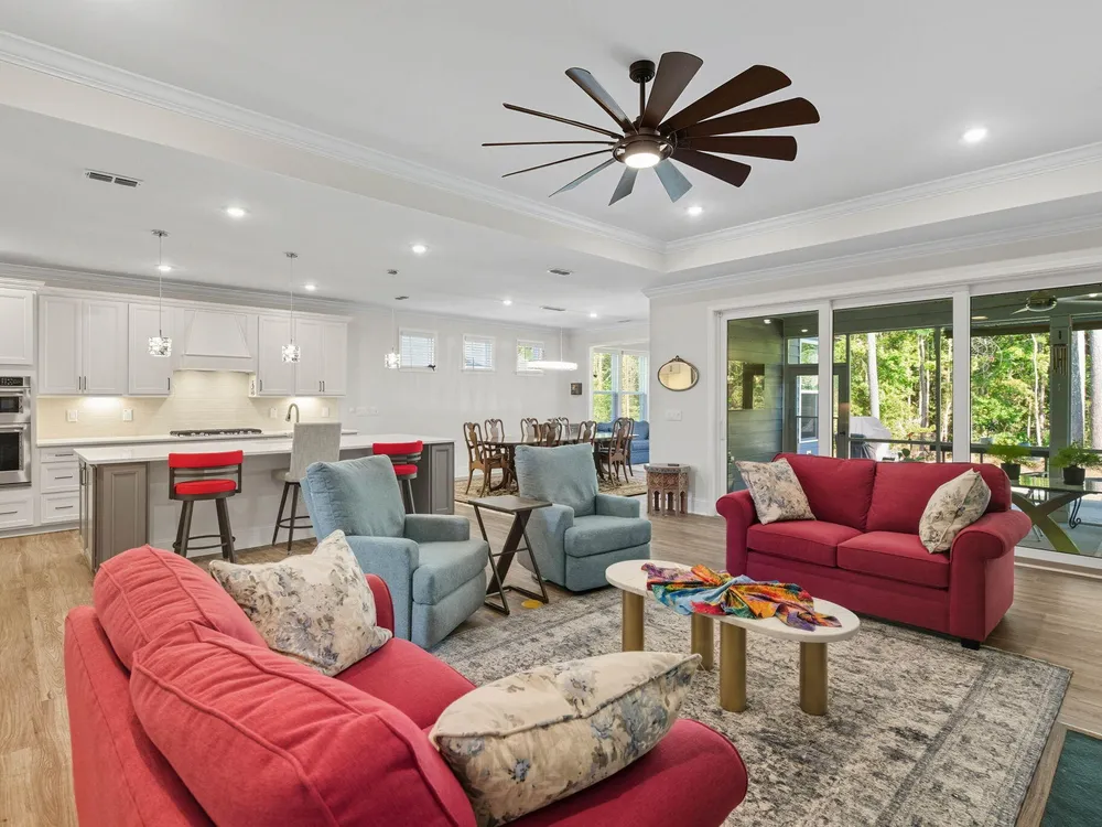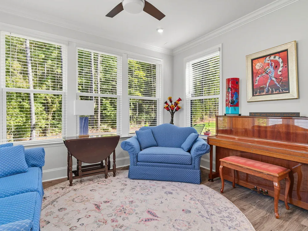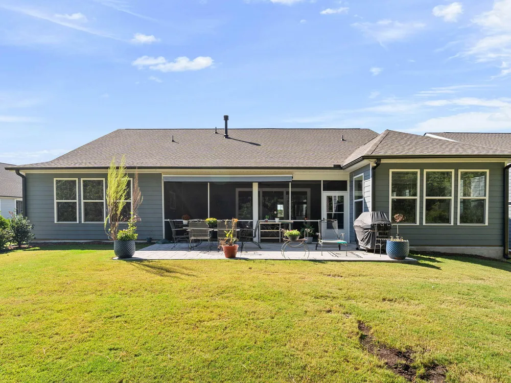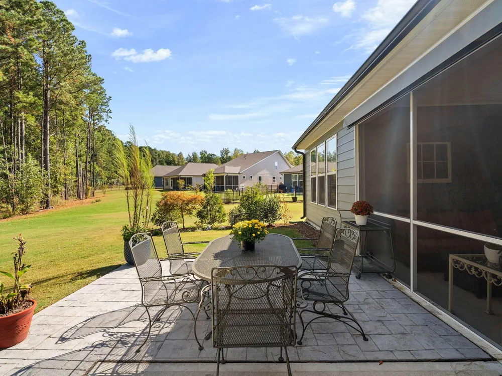 Located in the desirable 55+ community of Carolina Gardens by Del Webb, this beautifully appointed Stellar plan offers a refined blend of comfort and style. The gourmet kitchen features quartz countertops, soft-close cabinetry, double ovens, a gas cooktop, and a spacious pantry. The open design includes wider walkways, a bright sunroom that provides excellent flex space, and a great room ideal for everyday living. The primary suite offers natural light, wooded views, a zero-entry shower with seat and grab bars, and a large custom walk-in closet. Two additional bedrooms, each with access to a full bath, plus a dedicated office, allow for privacy and flexibility. Enjoy outdoor living on the screened porch or extended patio, featuring a remote-controlled Marygrove retractable awning with integrated lighting. Thoughtful landscaping enhances privacy along the back patio, creating a peaceful setting for relaxation or entertaining. The 3-car garage provides additional space for a golf cart, workshop, or storage, and a 17-zone underground sprinkler system helps maintain the lush landscaping year-round. Conveniently situated near both downtown Fuquay and Varina, with easy access to local shops, dining, Raleigh, and RDU. Carolina Gardens amenities support an active, resort-style 55+ lifestyle: a stunning 20,500 sq. ft. clubhouse with multi-purpose rooms, community kitchen/café and ample gathering spaces; a fitness center with aerobics studio; indoor and outdoor pools plus a hot tub; four pickleball courts and a tennis court; community gardens, lush parks and a dog park; and an on-site lifestyle director who organizes events, classes and activities. Age rule: at least one resident must be 55 or older; children aged 19+ may be permanent residents provided the community's 55+ requirement is met.
