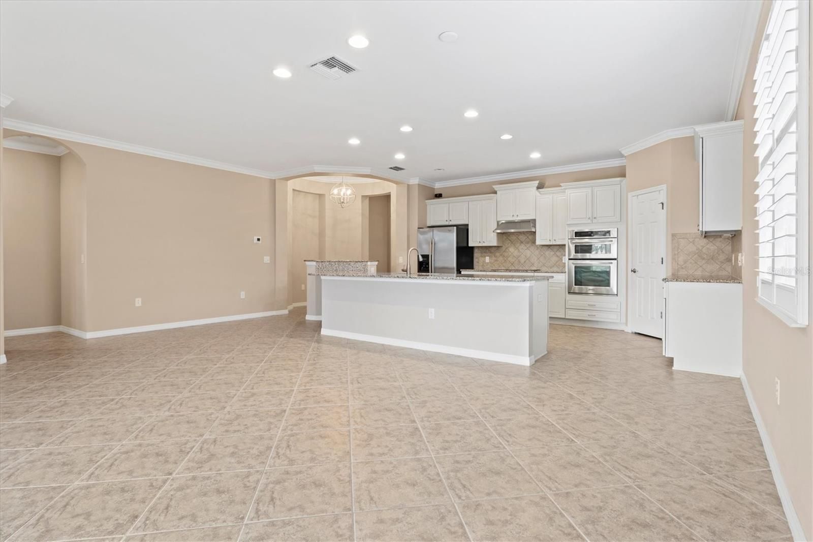 - Built-in Features, Cathedral Ceiling(s), Ceiling Fan(s), Crown Molding, Eat-in Kitchen, High Ceilings, In-Wall Pest Control, Kitchen/Family Room Combo, Living/Dining Room, Open Floorplan, Solid Surface Counters, Solid-Wood Cabinets, Split Bedrooms, Tray Ceiling(s), Walk-In Closet(s), Window Treatments