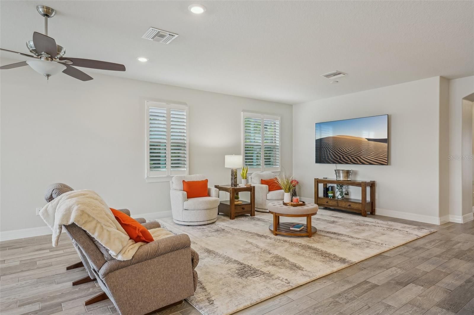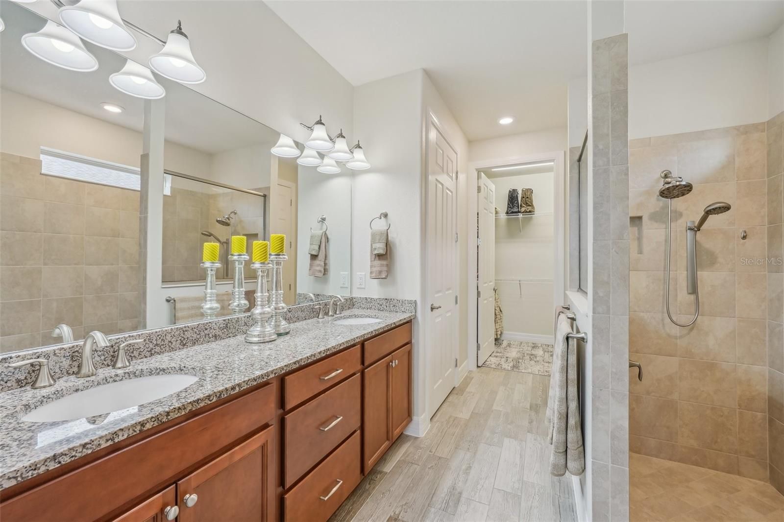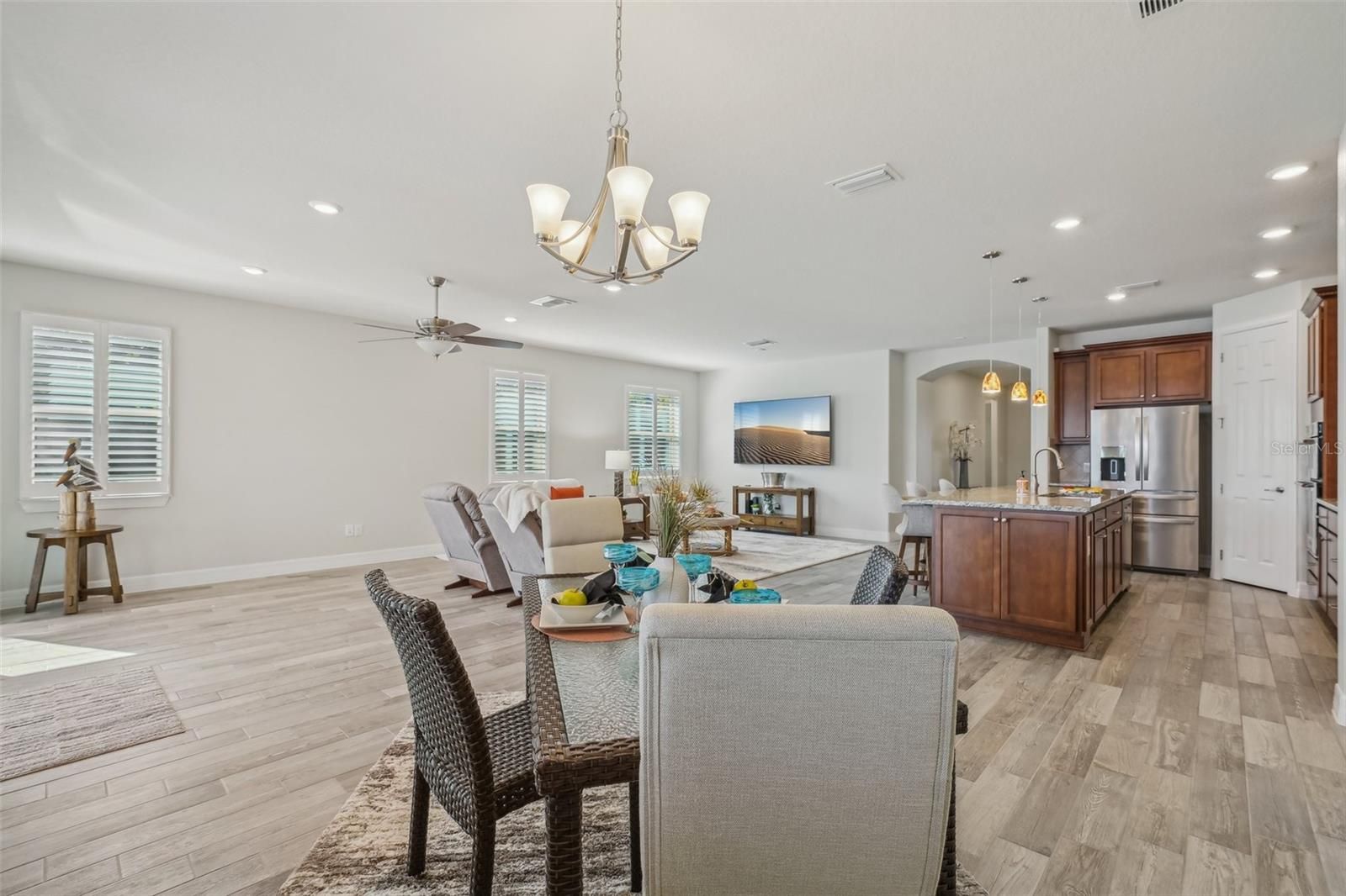 Step into elevated Florida living in this meticulously maintained, model-perfect 2019 home—located in the newly built subdivision of Del Webb Bexley, a premier 55+ active community known for its vibrant lifestyle and high-end amenities. This single-story, standalone home showcases a Mediterranean transitional design with architectural details that include curved archways, rounded corners, and ceramic clay tile flooring throughout. It’s as well-built as it is beautiful. Stately rectangular columns and real stone accents enhance the façade, while a covered front porch and smooth brick pavers create a warm, welcoming first impression. The interior and exterior were freshly painted just over a year ago. A coordinating slate blue garage and front door add a sophisticated pop of color that complement the neutral palette and ties into the surrounding stonework. Beneath the beauty, insulated concrete block construction provides enhanced thermal efficiency—reducing energy use and maintaining year-round comfort. With over 3,100 SF of total space, this home is designed to blend indoor and outdoor living. From the moment you enter, your eye is drawn through the open-concept layout—where the kitchen, living, and dining areas flow together—toward the lanai and vast pond view. At the heart of the home is the entertainer’s kitchen, designed to impress and built to perform. It features granite countertops, a sprawling center island with sink and breakfast bar seating, soft-close wood cabinetry with pull-out shelves and deep drawers, a professionally designed walk-in pantry with pull-out baskets and wine storage, and a KitchenAid natural gas griddle stove with exhaust hood. The primary suite is located at the back of the home, offering serene pond views. The en-suite bath is filled with natural light and includes dual vanities, a walk-in linear shower with bench and dual shower heads, a large linen closet, a private water closet, and a walk-in closet with built-in organizational shelving. Two guest bedrooms are thoughtfully positioned for guest privacy. Step outside to your oversized 24’ x 19’ lanai, with cement-tile flooring and a durable tension-cable screen that preserves wide-open water views—perfect for evening gatherings around the firepit table. The extended garage offers space for 2 cars + a golf cart and is outfitted with epoxy flooring, ceiling storage, and an insulated, impact-rated door with a raised threshold to help keep out debris. A full-sized laundry room provides upper and lower cabinetry, a washtub sink, and LG washer and dryer. Additional upgrades include: 8' interior doors, modern wide baseboards, gas-powered tankless water heater, whole-house water softener and RO system, and an in-wall pest control system with exterior access. Del Webb Bexley’s gated entrance leads to an exceptional amenity center featuring a 19,000-square-foot clubhouse, resort-style pools with lap and resistance lanes, hot tub, a fitness center, amphitheater, walking trails, pickleball and tennis courts, dog parks, a community garden, and a full calendar of social events. This home offers the perfect blend of style, comfort, and active living in one of Land O’ Lakes’ most desirable communities. Come experience the resort lifestyle every day.