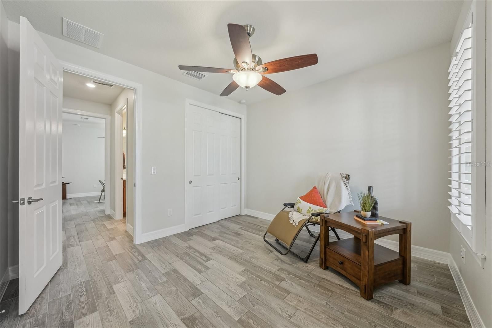 - Built-in Features, Ceiling Fan(s), Eat-in Kitchen, High Ceilings, In-Wall Pest Control, Kitchen/Family Room Combo, Living/Dining Room, Open Floorplan, Main Level Primary, Solid-Wood Cabinets, Split Bedrooms, Stone Counters, Thermostat, Walk-In Closet(s), Window Treatments
