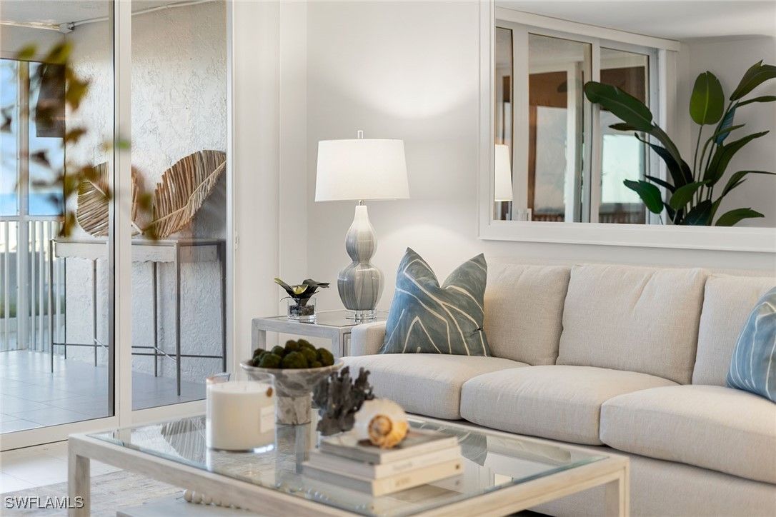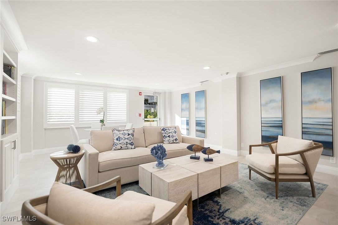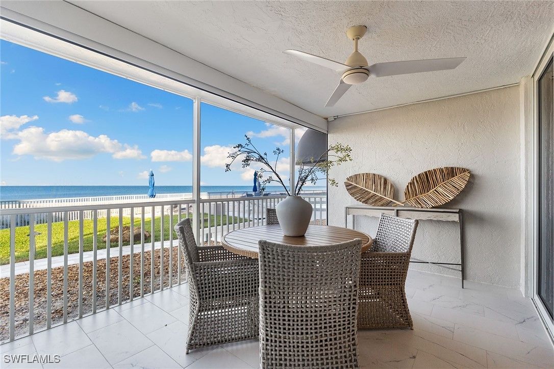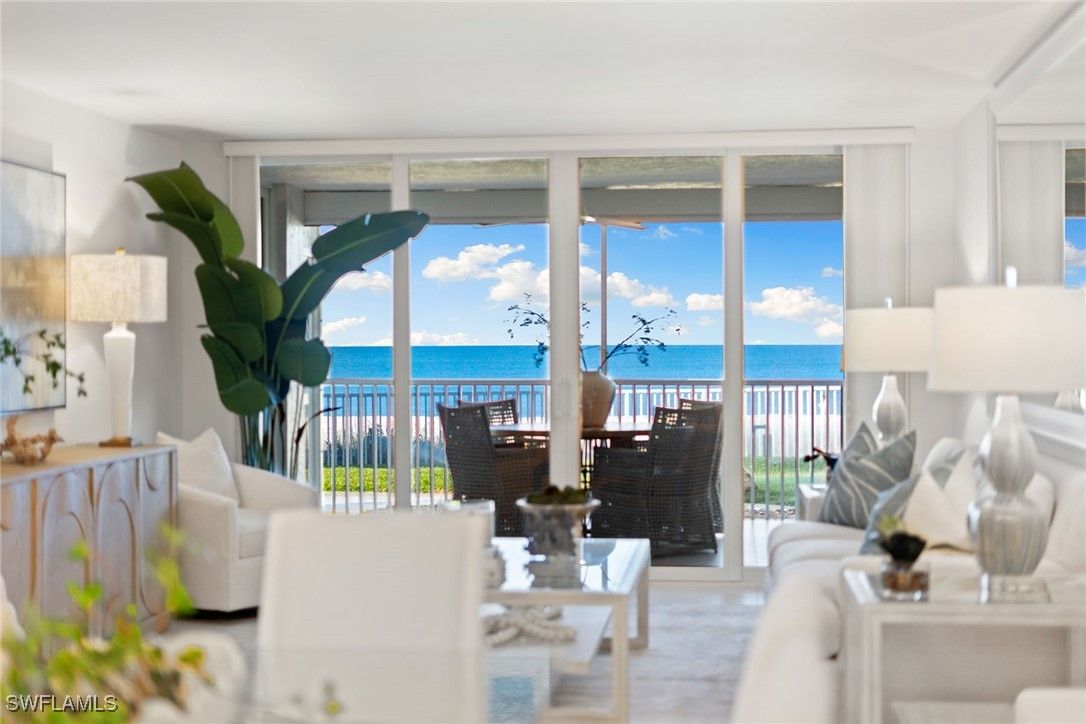Experience a true beach cottage feel with this walk-out-directly-to-the-sand condominium. Exquisitely redesigned and renovated two-bedroom, two-bath condominium in the sought-after Diplomat Club, ideally situated directly on the beach in the charming Moorings neighborhood in downtown Naples. This beautiful corner condominium showcases the most amazing, uninterrupted panoramic Gulf and beach views from the moment you enter. The open-concept design seamlessly blends style and function, the kitchen features a generous center island, stainless steel appliances, and custom cabinetry, while the expansive living and dining areas provide an ideal space for both relaxation and entertaining. A serene, neutral palette, paired with tile flooring throughout and custom built-in closets, enhances the home’s tranquil atmosphere. Step outside to your private screened lanai, where hurricane-rated doors, windows, and shutters ensure peace of mind while you take in stunning western sunsets over the Gulf. With direct access to both the pool and beach just steps away, this home offers an unmatched lifestyle of leisure and convenience. Additional luxury touches include assigned covered parking, extra storage, community room and an on-site manager. This prime location is just a stroll to the new Four Seasons Beach Resort and minutes to fine dining, boutique shopping, galleries and vibrant nightlife of 5th Avenue South. A rare and exceptional opportunity, this meticulously crafted beachfront residence is the ultimate Naples retreat.