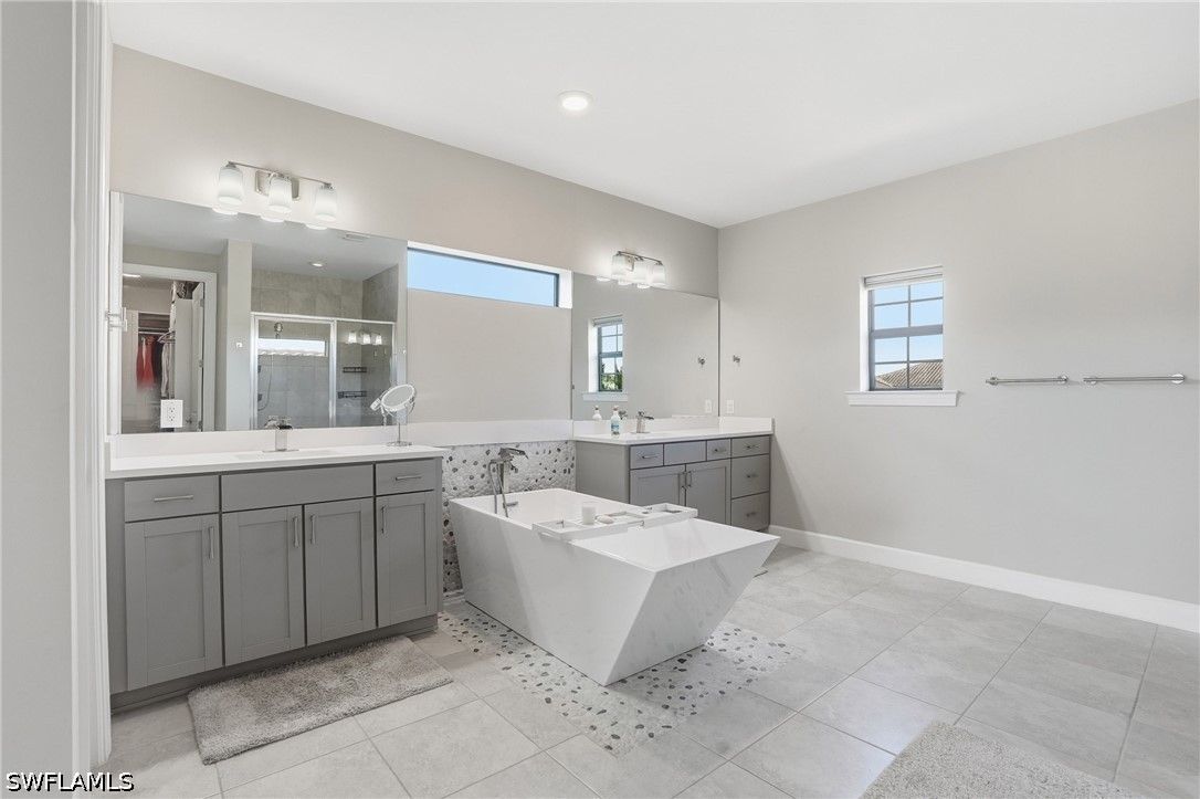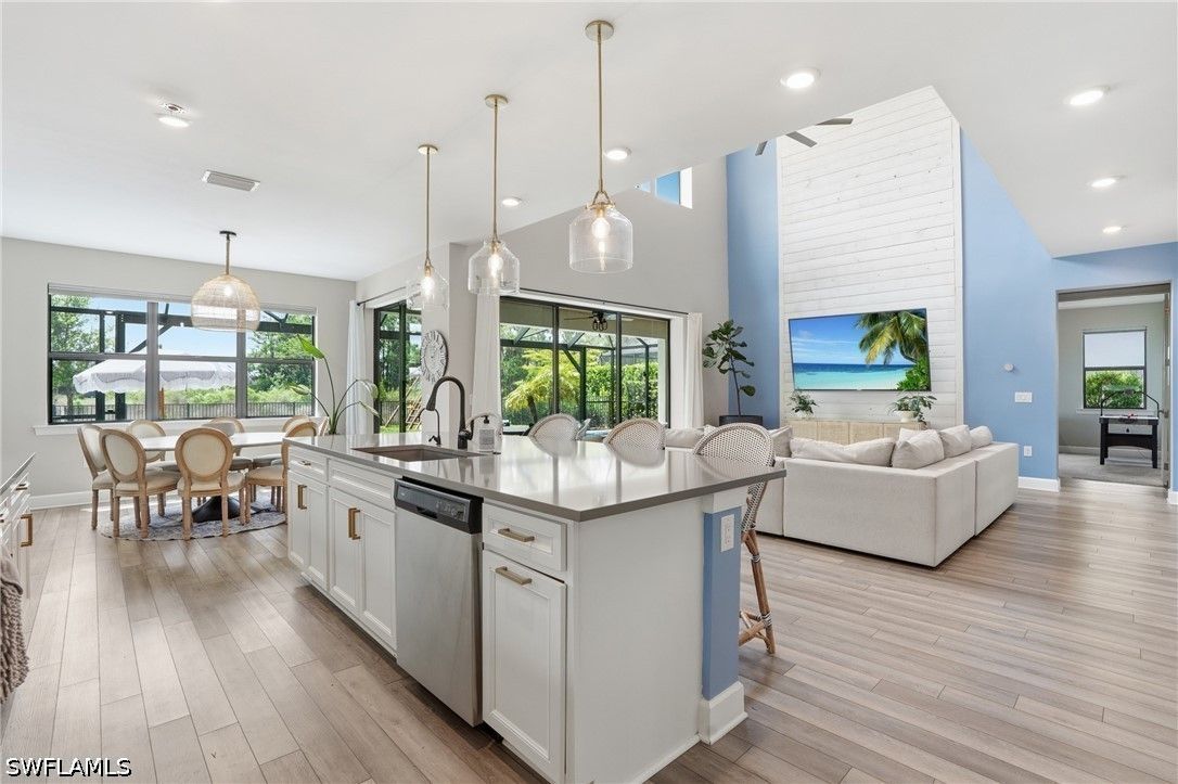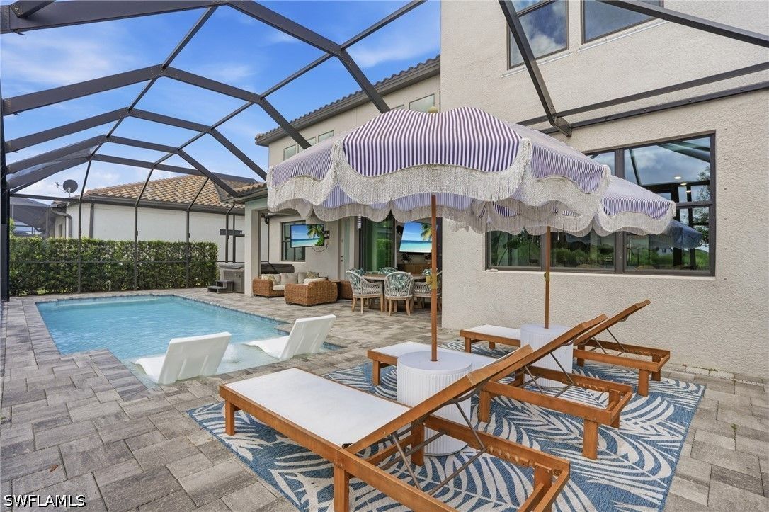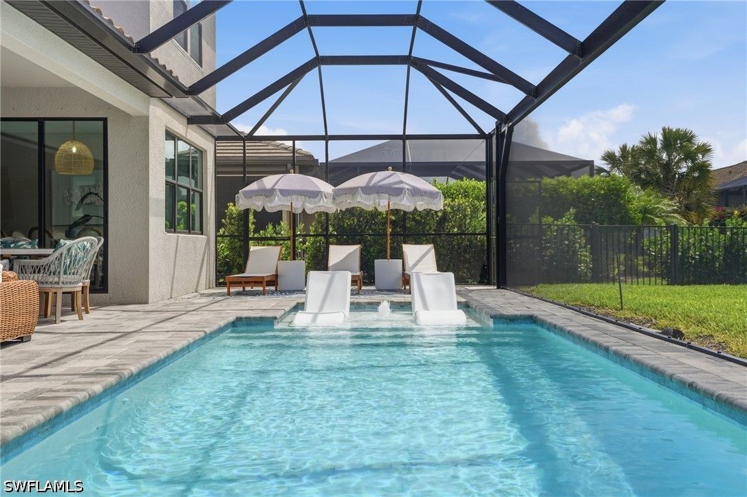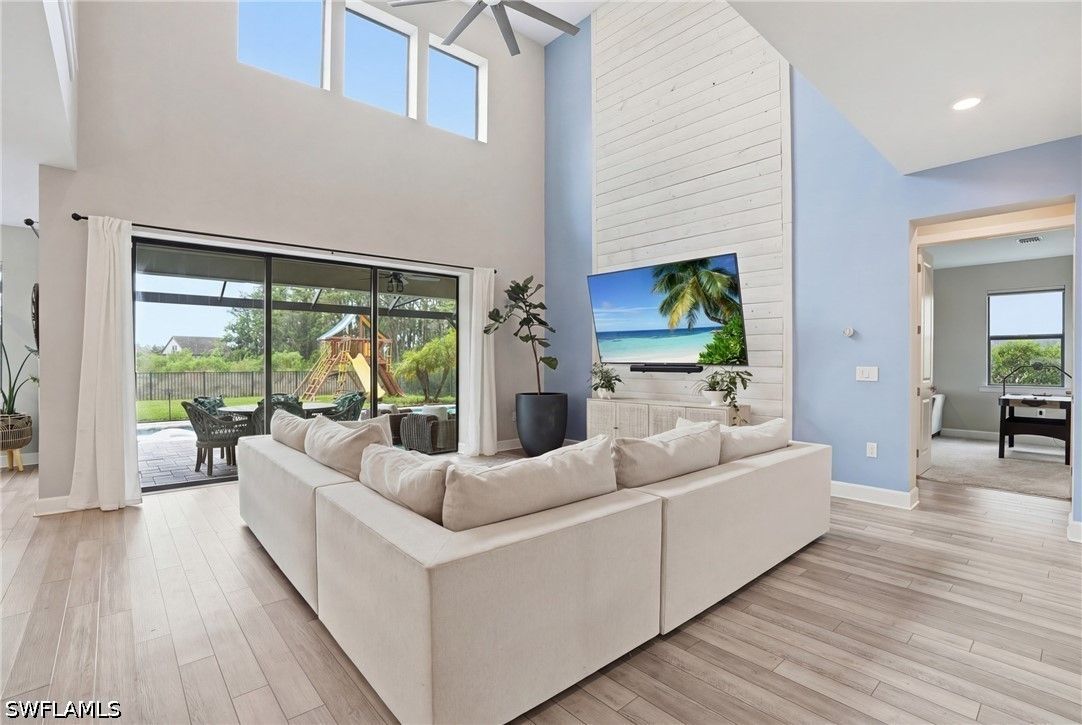 Welcome to an extraordinary lifestyle opportunity where every day feels like a year-round luxury resort escape. This expansive residence is more than just a home—it is an elevated living experience defined by elegance, comfort, and a rare sense of retreat. From the moment you enter this exclusive gated community, you are immersed in a setting that immediately feels different—where lush surroundings, thoughtful design, and resort-caliber amenities come together to create a lifestyle that feels effortlessly indulgent. Whether you are spending the afternoon poolside, staying active with world-class recreation, or simply enjoying the sunshine and warm Florida breezes, life here is designed to feel like a permanent vacation. Every detail of the community has been curated to enhance both relaxation and connection, offering a place where residents don’t just live—they truly unwind, recharge, and thrive all year long. The community is truly world class, featuring an incredible resort-style pool with dual zero entry access points, cascading waterfalls and an expansive sun-soaked lounging areas, enjoy it all with poolside service from the bar and restaurant. Residents also enjoy 8 pickleball courts, 6 clay tennis courts, a sand volleyball court and a fully equipped two-story fitness center. A vibrant social scene awaits at the open-air poolside restaurant and bar, and a separate bourbon bar for evening gatherings. Additional amenities include a 40 person hot tub, a coffee cafe and ice cream shop, a beautifully designed playground, full basketball court and a dedicated dog park - creating a lifestyle that blends relaxation, recreation and community connection. The home itself is a standout masterpiece of coastal-modern design, offering 4 spacious bedrooms, all with walk in closets, along with two versatile bonus spaces of the main floor ideal for additional bedrooms, a private office or a media room. Every detail of this home has been thoughtfully curated with high-end upgrades throughout, including a dramatic two story custom wood plank feature wall, designer lighting and a bright open layout perfect for entertaining. Custom cabinetry and quartz makes the laundry enjoyable. The primary suite is spa-like with a beautiful soaking tub, separate sink spaces and custom built his and her closets. The great room fully opens to the covered patio and pool, giving the ultimate indoor-outdoor feel. Come experience an elevated lifestyle you have been waiting for.