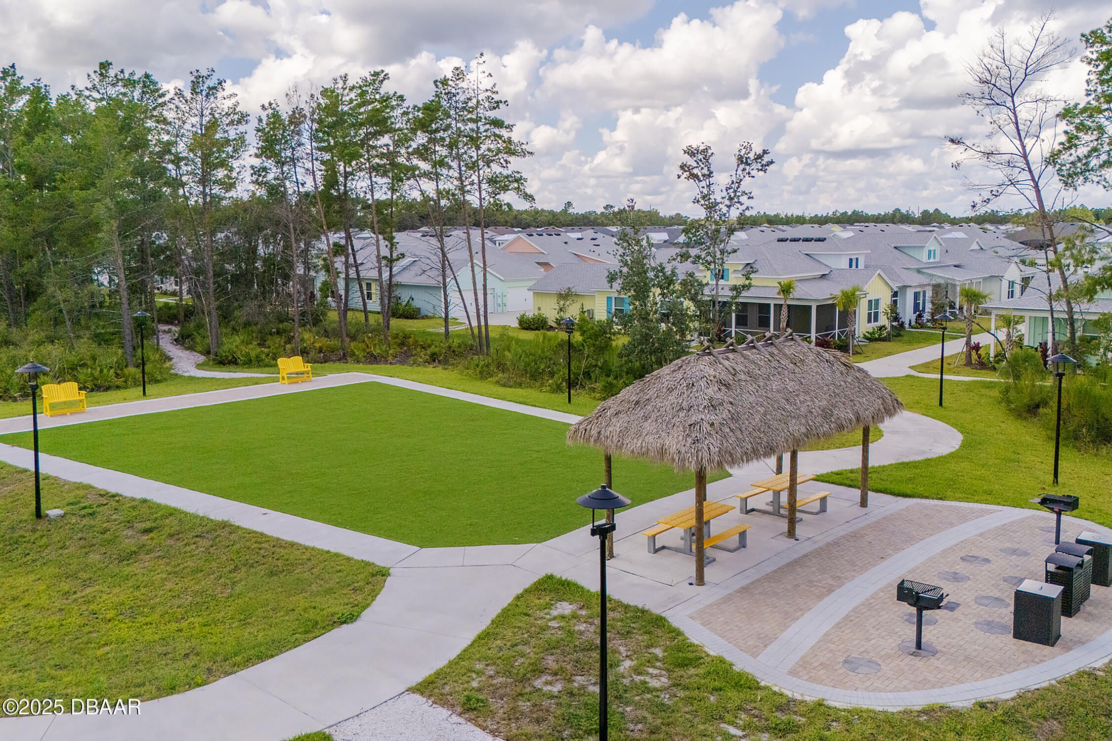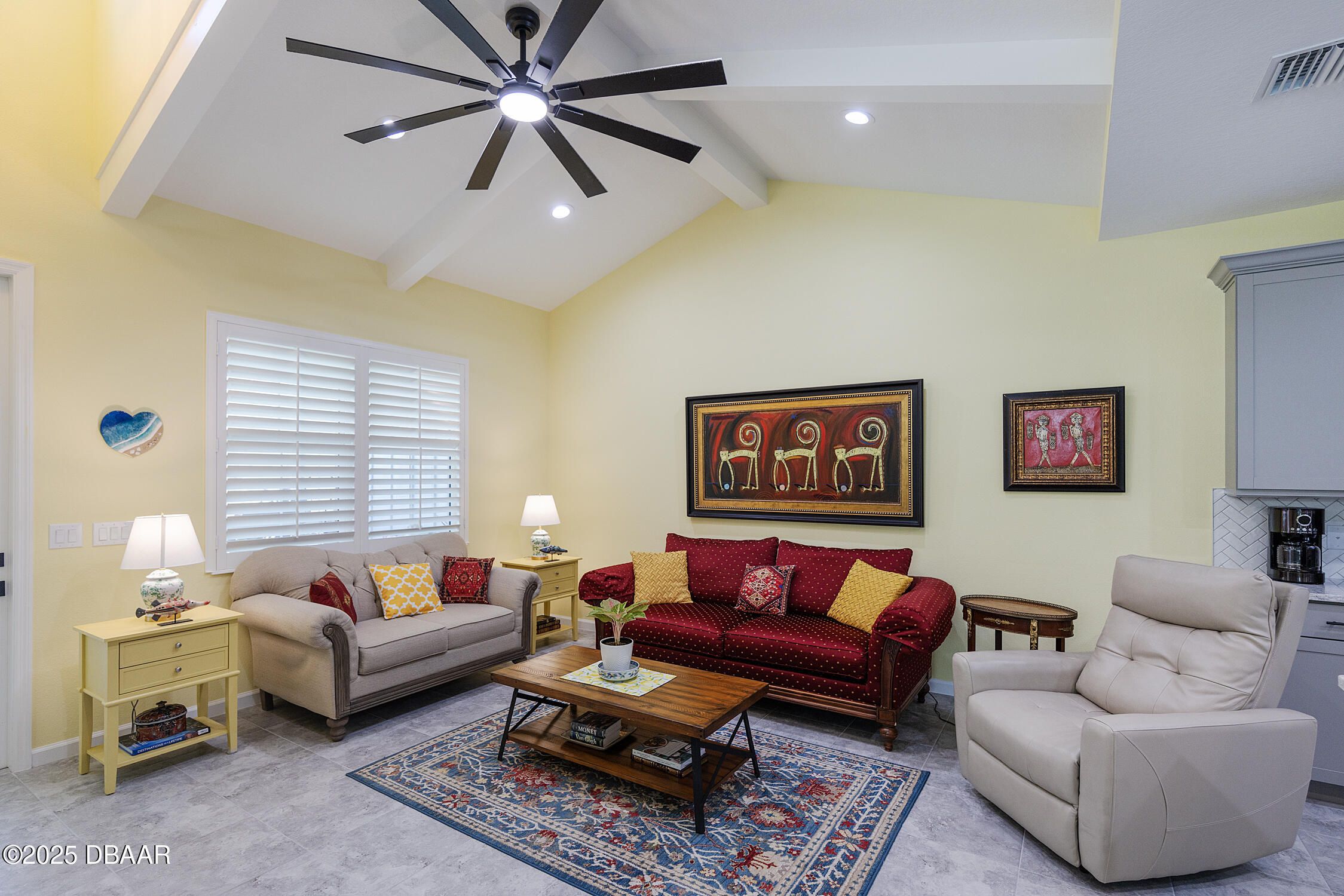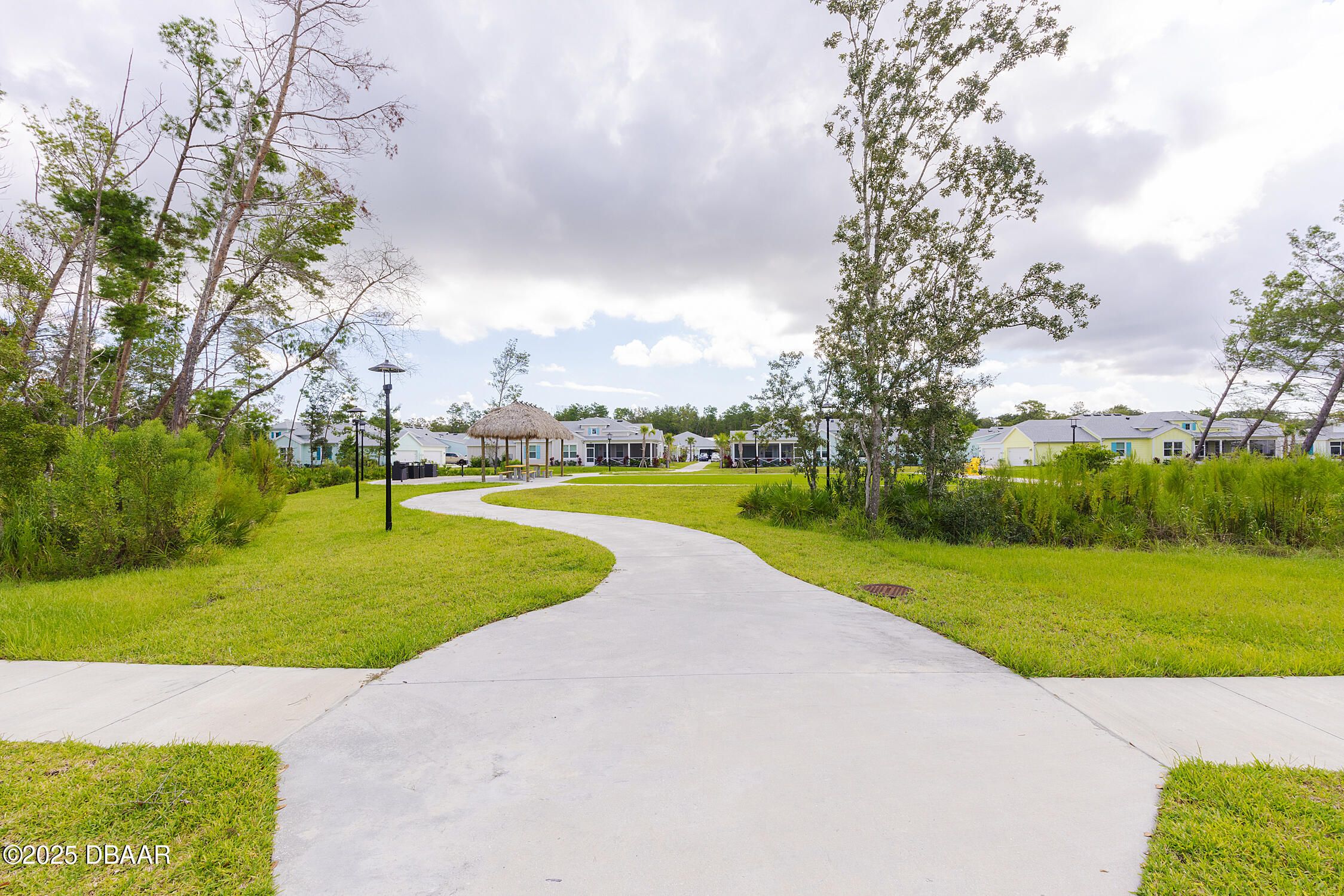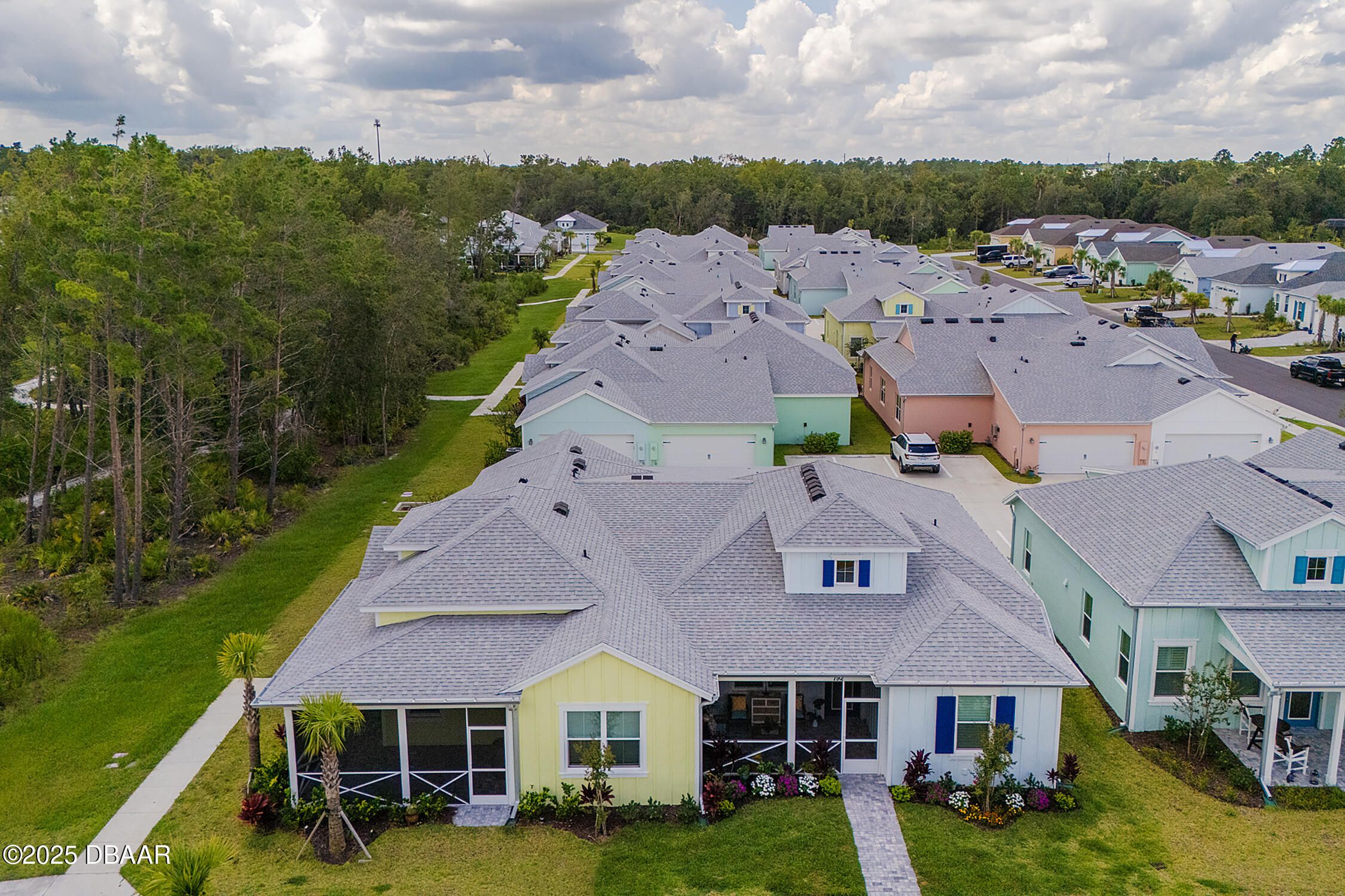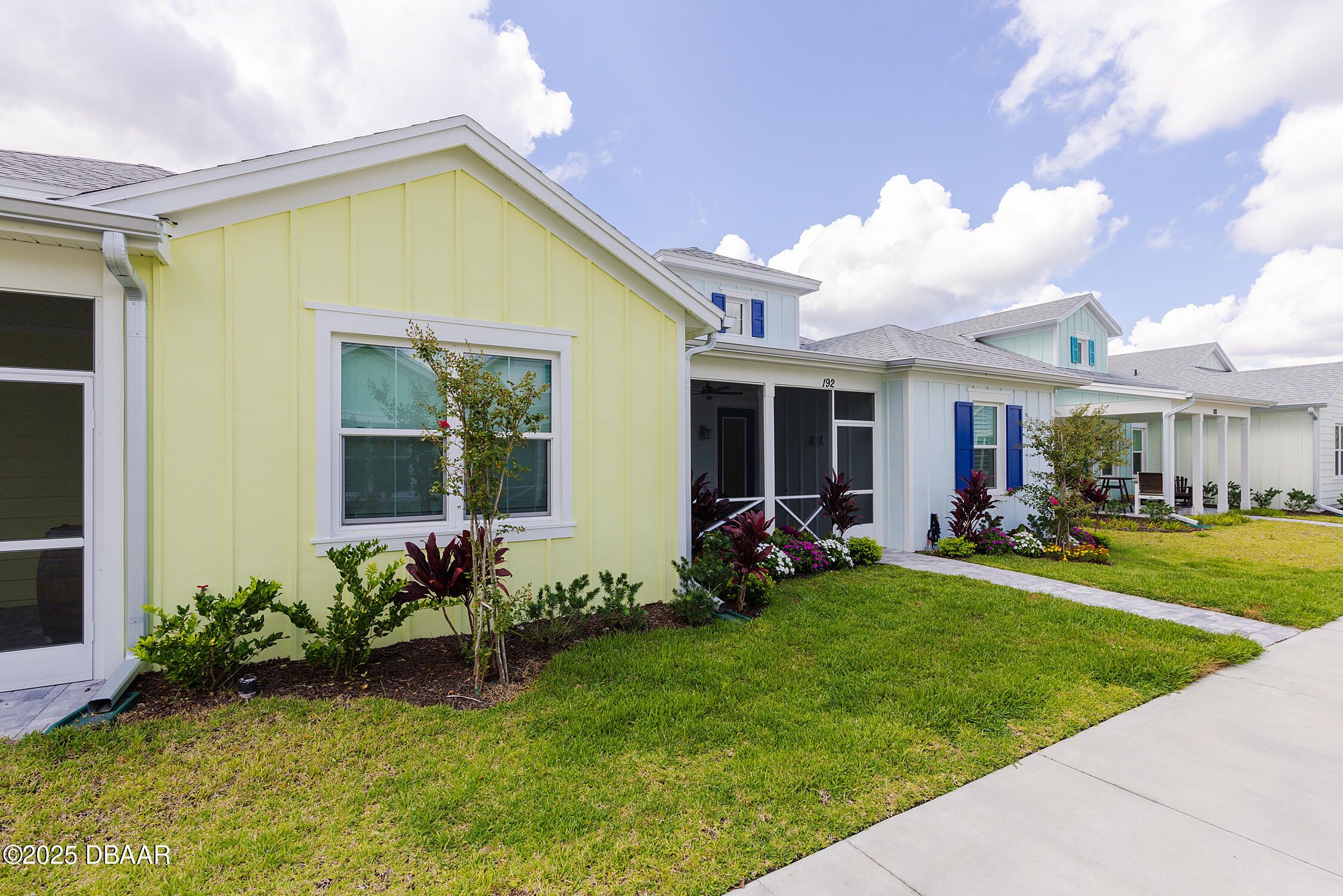 This stunning 2024-built Camellia Conch model offers the perfect blend of island-inspired living and modern comfort. Featuring 2 split bedrooms, 2 bathrooms, and a 2-car garage, this home was thoughtfully designed for both relaxation and entertaining. Step inside to an open-concept layout with bright, airy living spaces and elegant finishes throughout. Upgrades abound with vaulted beams in the living room and neutral colored tile throughout the entire home. Modern looking Plantation blinds and newly painted soft yellow walls in the living area adds a tropical feel. The gourmet kitchen boasts stainless steel appliances, quartz countertops, upgraded 42'' soft close cabinets and a spacious island — ideal for gathering with friends. Additional flex room near the kitchen is so convenient and can accommodate a large dining room table, or could be used as an office. Upgraded lighting and fans. Extra large capacity, front loading GE washer and dryer are included. The owner's suite provides a private retreat with a walk-in closet and spa-style bathroom featuring a glass walk-in shower, double vanity and custom-built storage. A versatile guest bedroom and bath ensure plenty of space for visitors. Enjoy indoor-outdoor living with a spacious screened in lanai with pavers, perfect for morning coffee or evening cocktails. The home is ideally situated near a large green space and park, complete with covered picnic tables and a grill. HOA maintenance of the outside painting and grounds means more time to soak in the Margaritaville lifestyle. Living in the gated community of Latitude Margaritaville means access to world-class amenities: resort-style pools, fitness center, restaurants, live entertainment, private beach club with daily shuttle, tennis, pickleball, bocce, a pet spa and park, and endless activities designed for active adults 55+. Located just minutes from shopping, dining, medical facilities, and the beautiful beaches of Daytona. Whether you're seeking a full-time residence or a tropical getaway, this home is move-in ready and waiting for you! The golf cart (valued at $10,000) may be purchased for $6,000.
