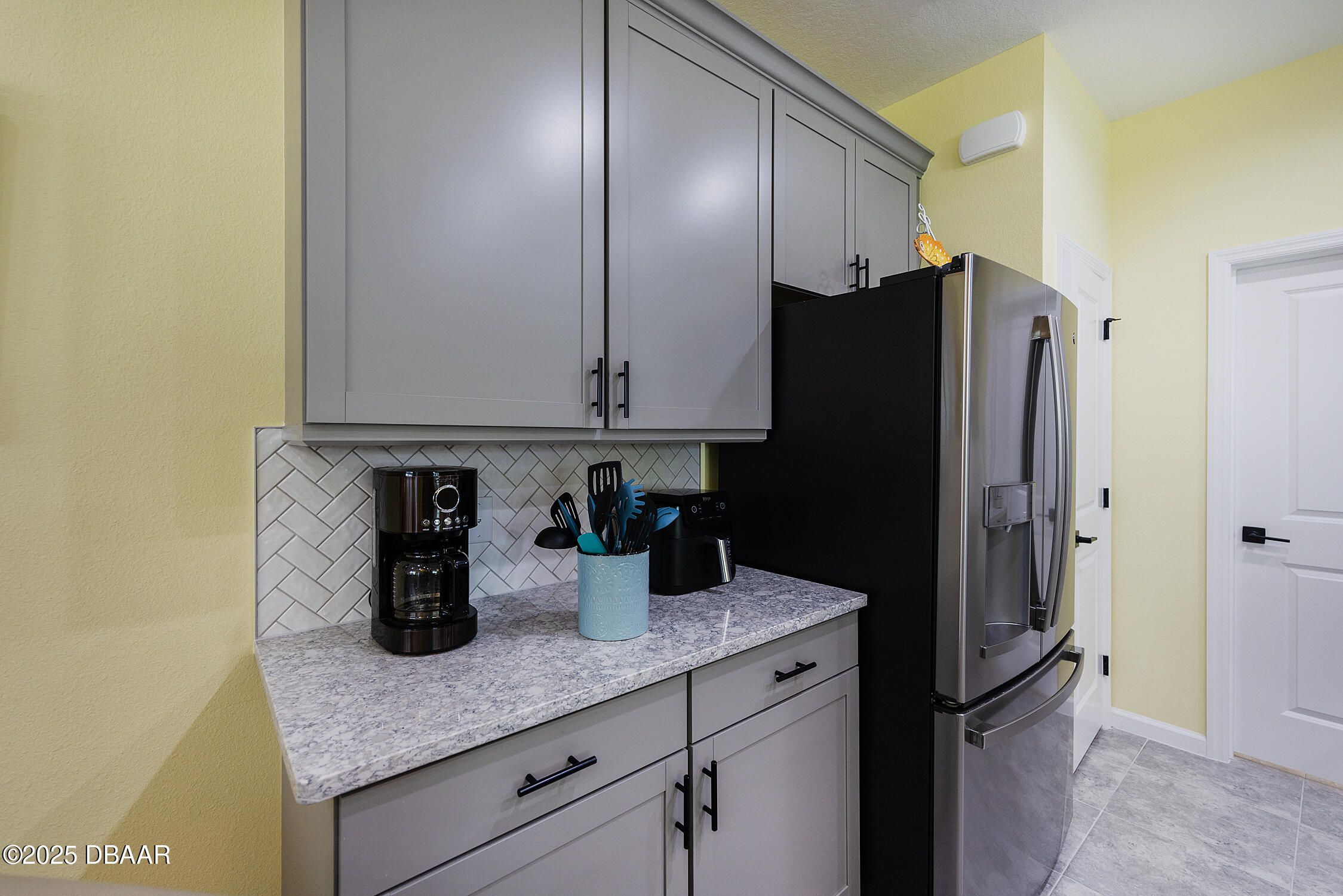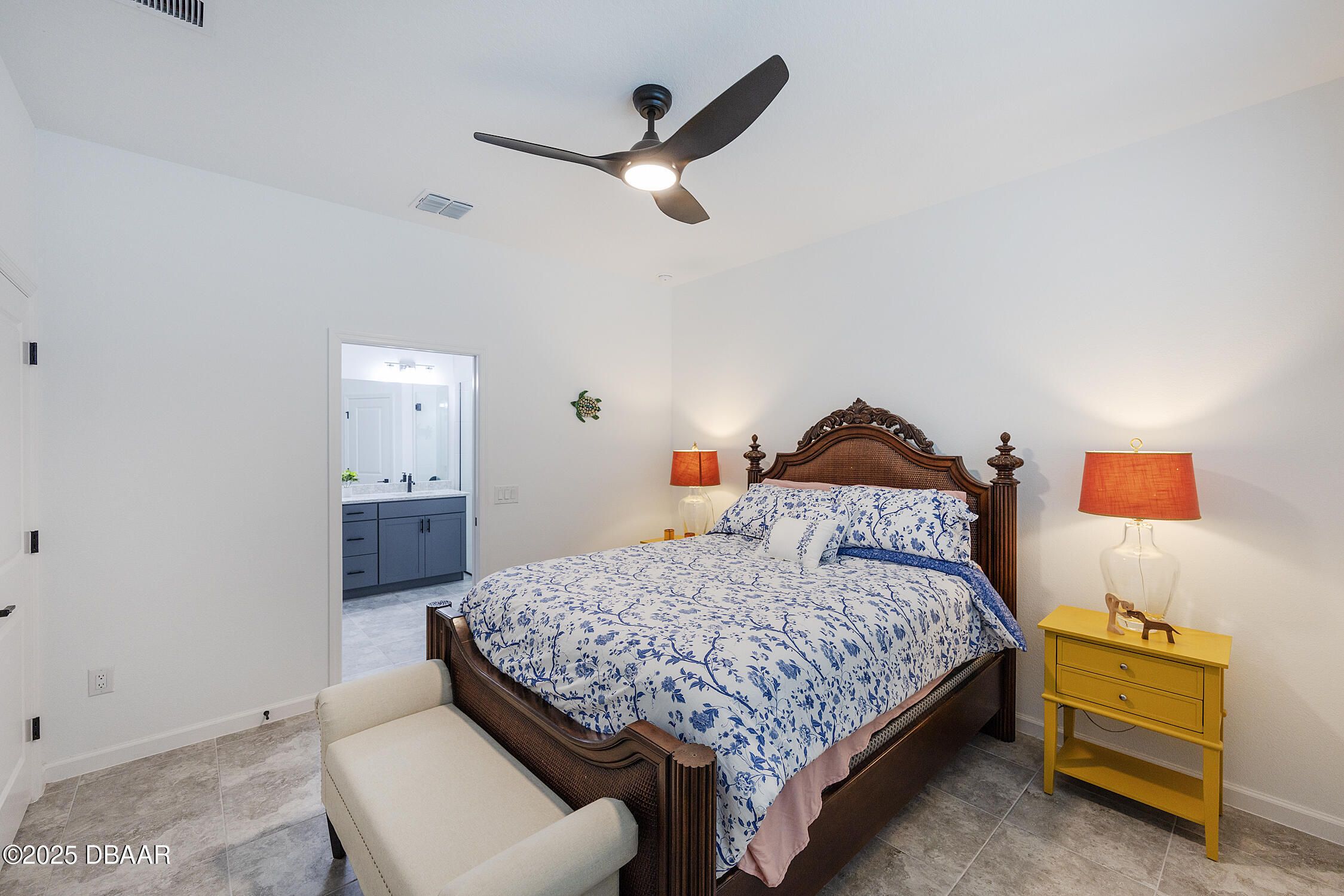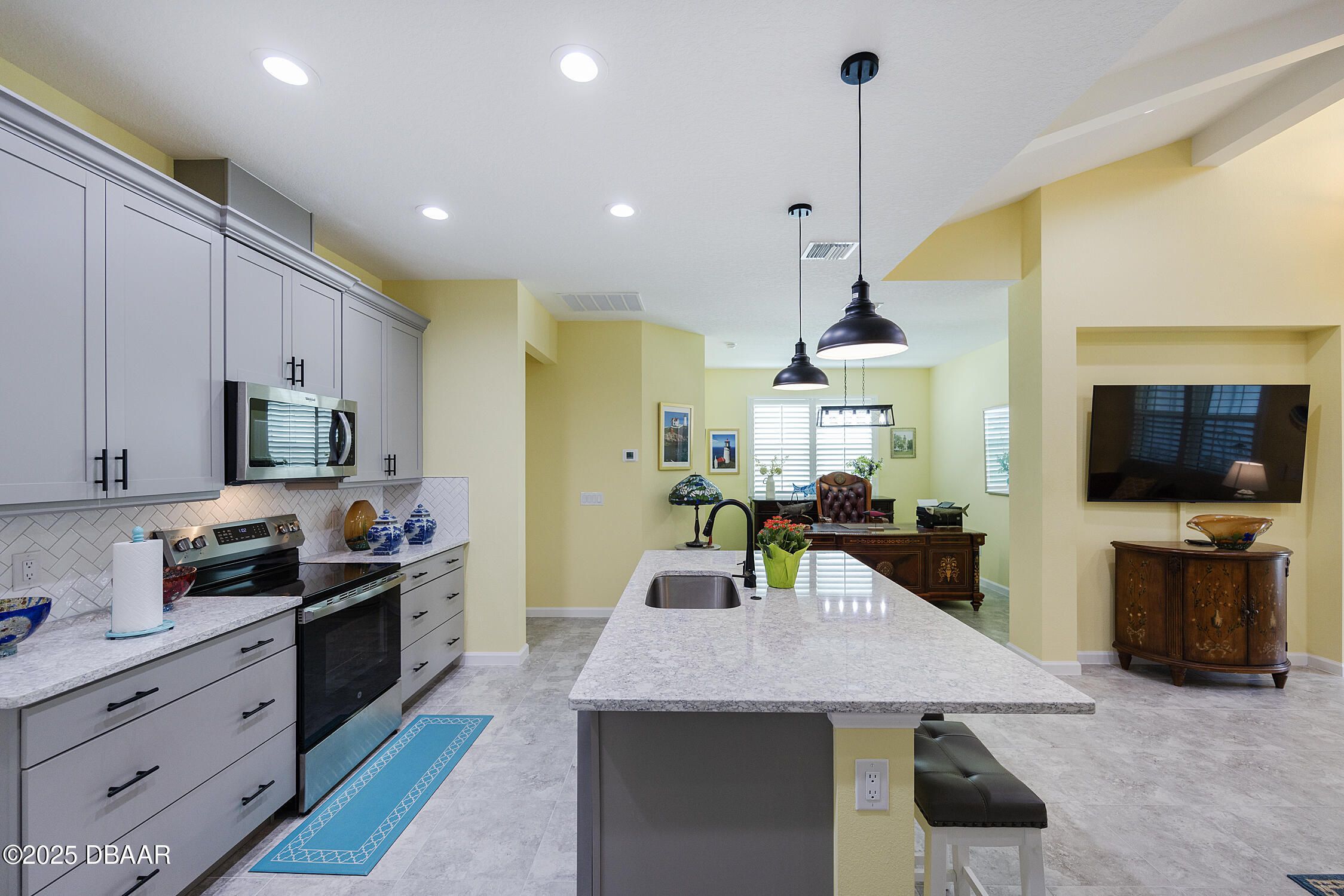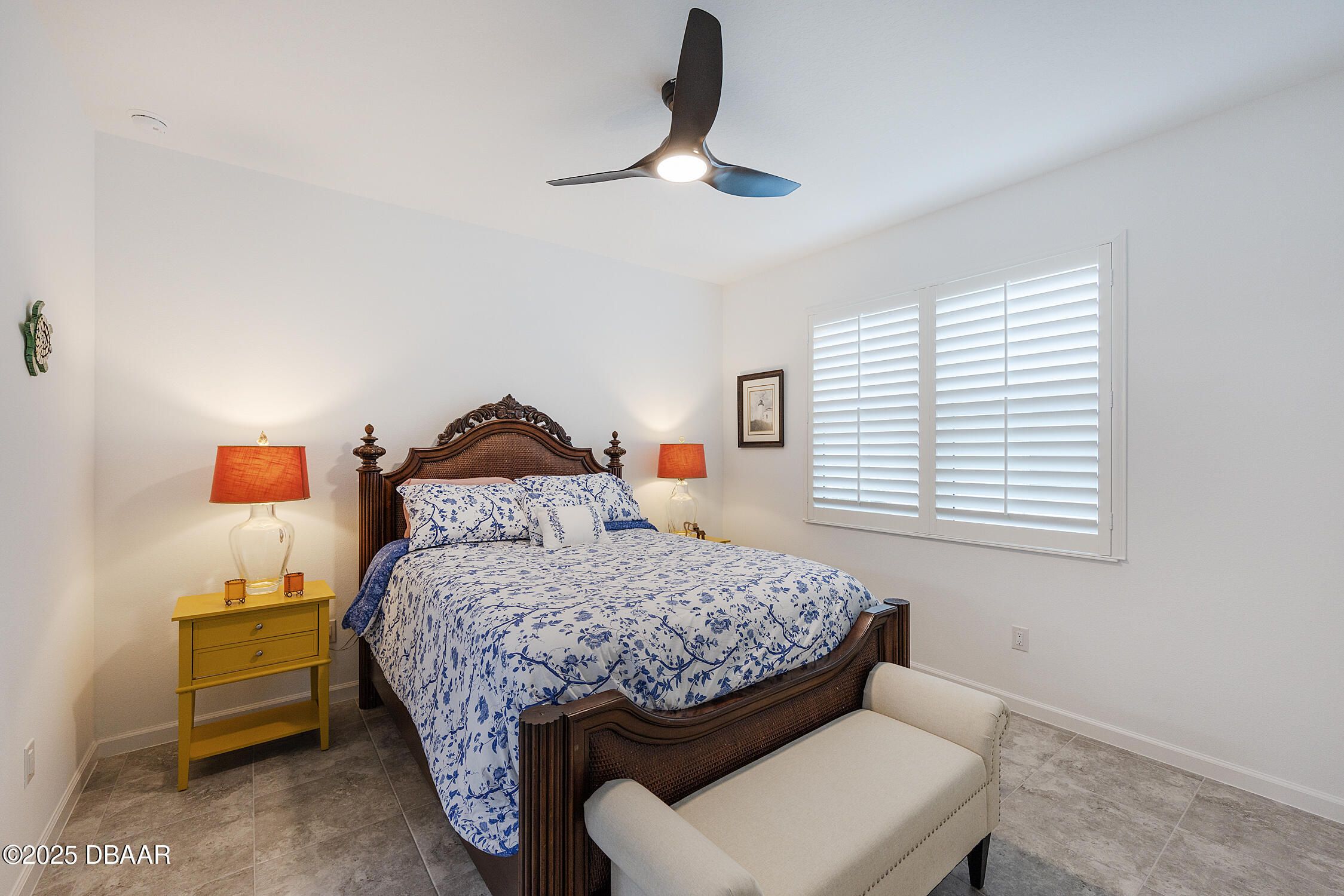 This stunning 2024-built Camellia Conch model offers the perfect blend of island-inspired living and modern comfort. Featuring 2 split bedrooms, 2 bathrooms, and a 2-car garage, this home was thoughtfully designed for both relaxation and entertaining. Step inside to an open-concept layout with bright, airy living spaces and elegant finishes throughout. Upgrades abound with vaulted beams in the living room and neutral colored tile throughout the entire home. Modern looking Plantation blinds and newly painted soft yellow walls in the living area adds a tropical feel. The gourmet kitchen boasts stainless steel appliances, quartz countertops, upgraded 42'' soft close cabinets and a spacious island — ideal for gathering with friends. Additional flex room near the kitchen is so convenient and can accommodate a large dining room table, or could be used as an office. Upgraded lighting and fans. Extra large capacity, front loading GE washer and dryer are included. The owner's suite provides a private retreat with a walk-in closet and spa-style bathroom featuring a glass walk-in shower, double vanity and custom-built storage. A versatile guest bedroom and bath ensure plenty of space for visitors. Enjoy indoor-outdoor living with a spacious screened in lanai with pavers, perfect for morning coffee or evening cocktails. The home is ideally situated near a large green space and park, complete with covered picnic tables and a grill. HOA maintenance of the outside painting and grounds means more time to soak in the Margaritaville lifestyle. Living in the gated community of Latitude Margaritaville means access to world-class amenities: resort-style pools, fitness center, restaurants, live entertainment, private beach club with daily shuttle, tennis, pickleball, bocce, a pet spa and park, and endless activities designed for active adults 55+. Located just minutes from shopping, dining, medical facilities, and the beautiful beaches of Daytona. Whether you're seeking a full-time residence or a tropical getaway, this home is move-in ready and waiting for you! The golf cart (valued at $10,000) may be purchased for $6,000.