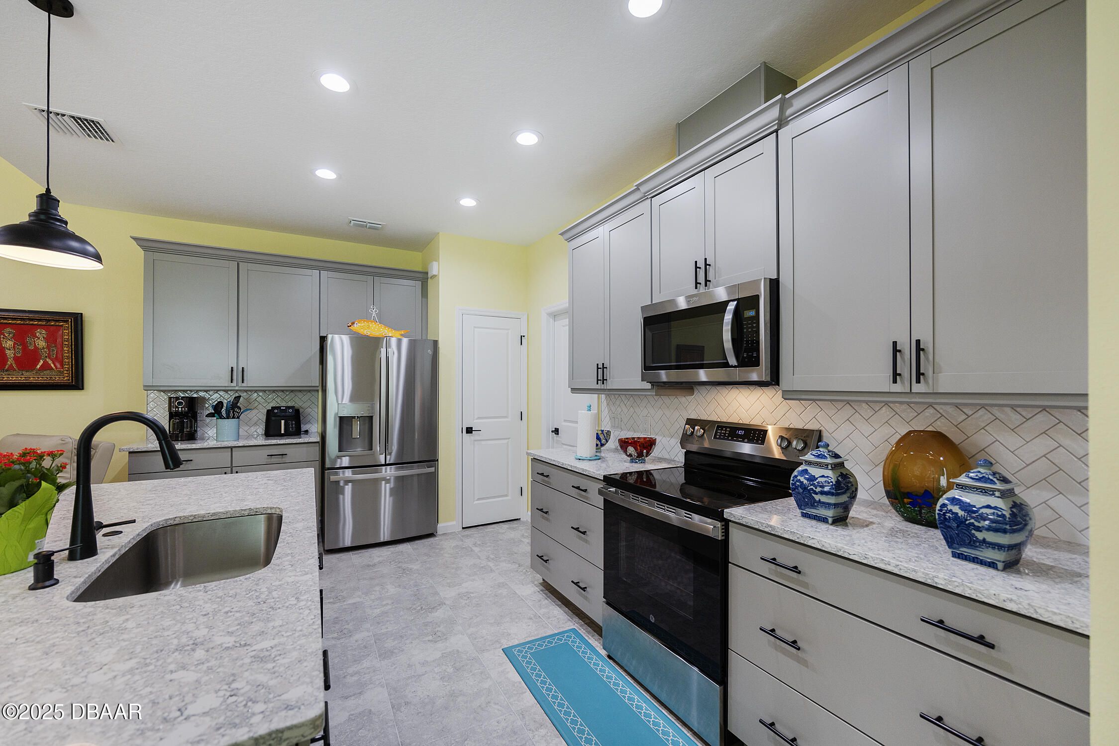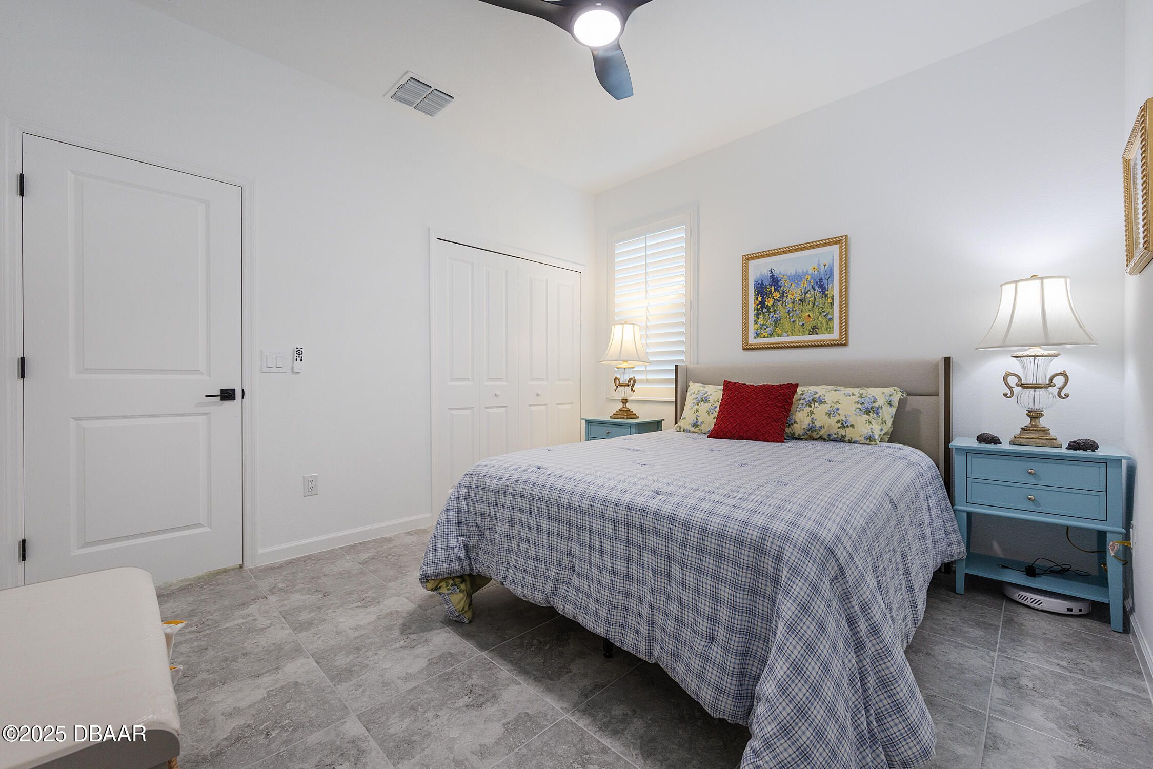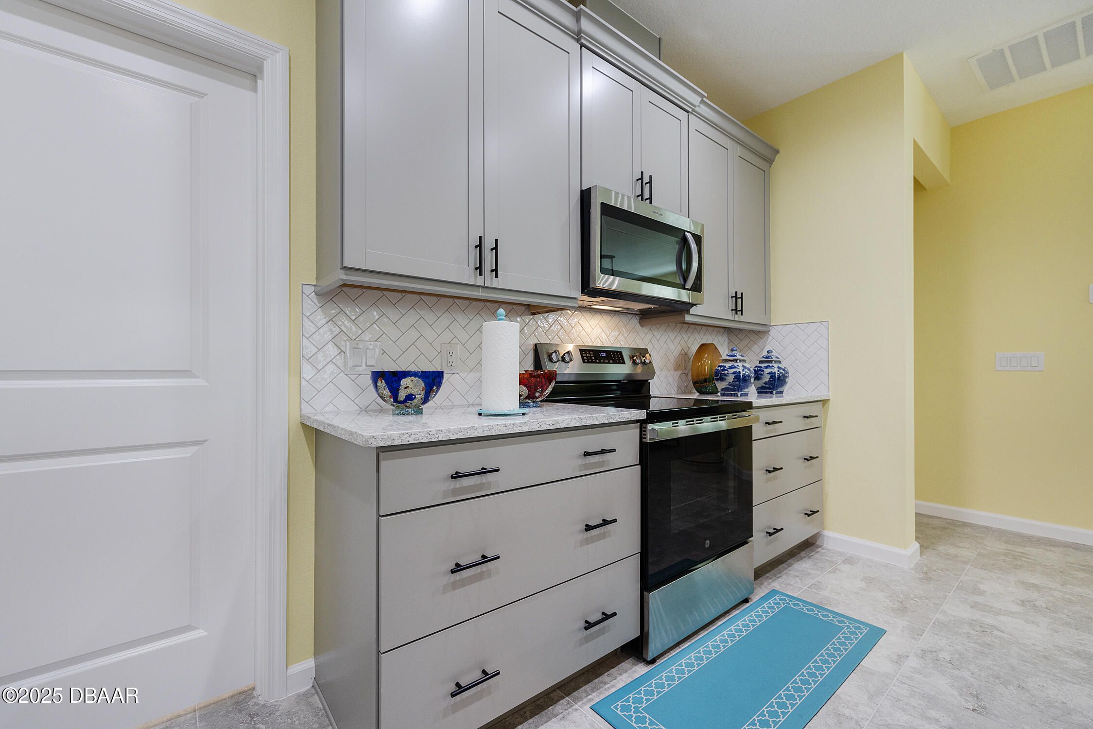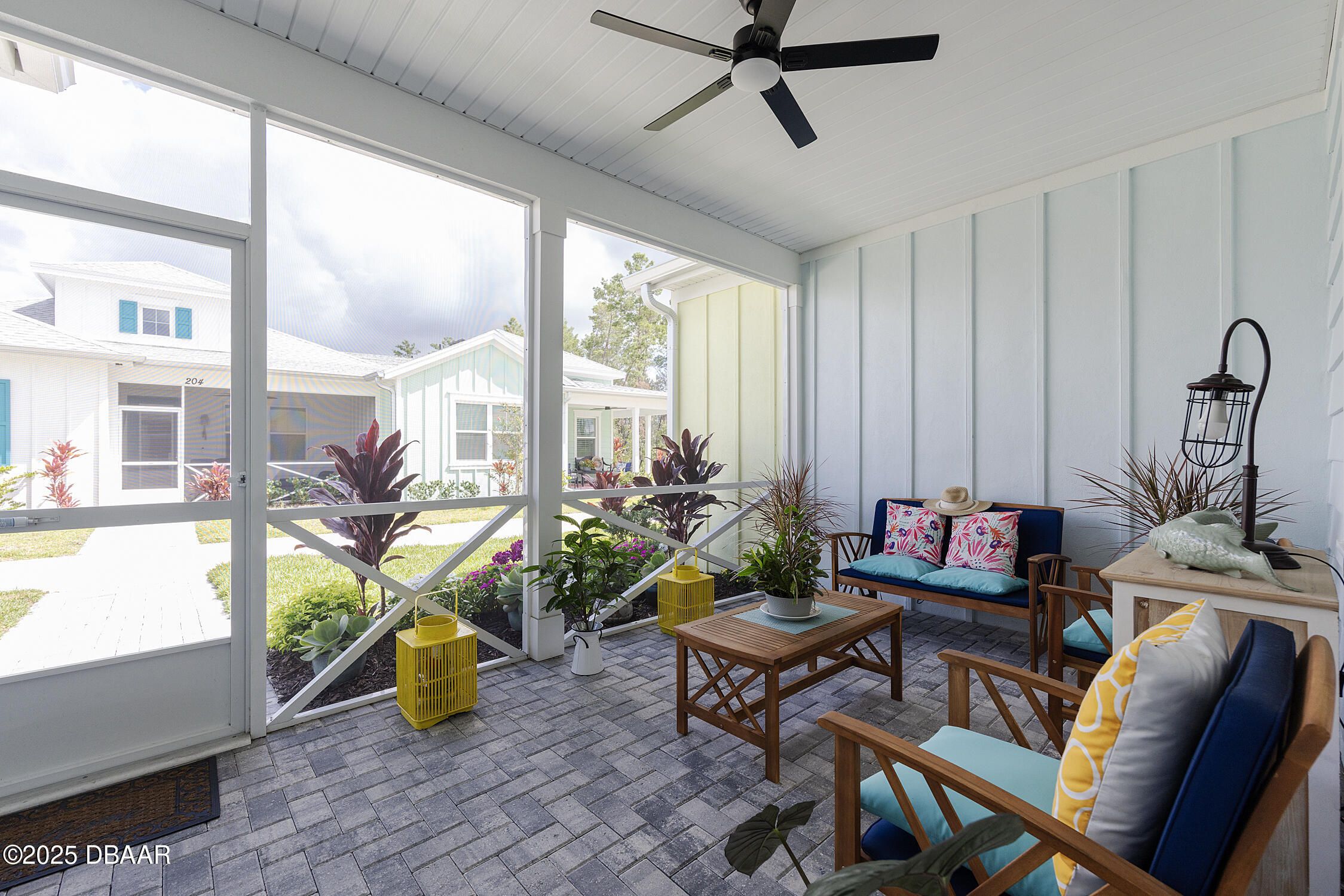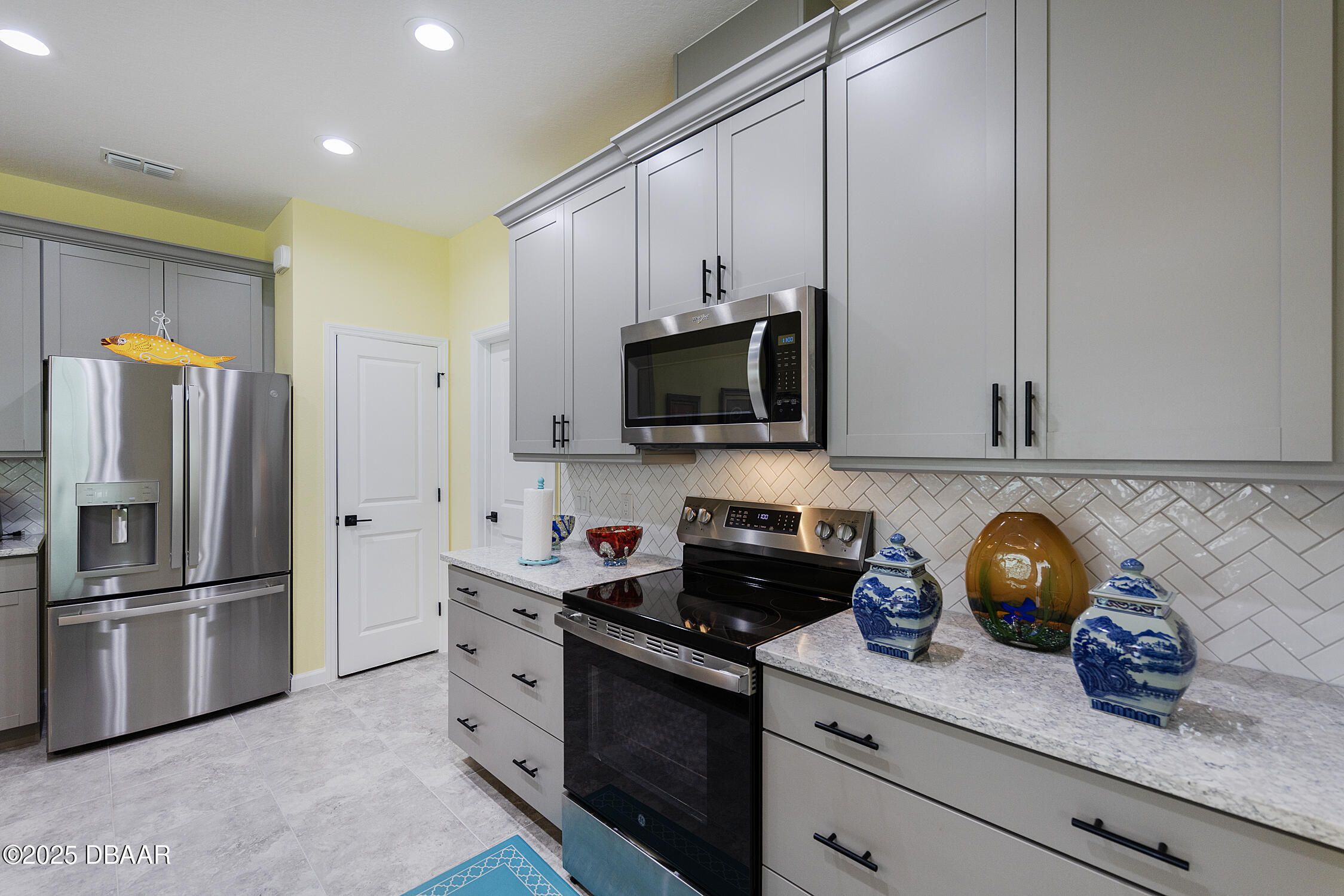 This stunning 2024-built Camellia Conch model offers the perfect blend of island-inspired living and modern comfort. Featuring 2 split bedrooms, 2 bathrooms, and a 2-car garage, this home was thoughtfully designed for both relaxation and entertaining. Step inside to an open-concept layout with bright, airy living spaces and elegant finishes throughout. Upgrades abound with vaulted beams in the living room and neutral colored tile throughout the entire home. Modern looking Plantation blinds and newly painted soft yellow walls in the living area adds a tropical feel. The gourmet kitchen boasts stainless steel appliances, quartz countertops, upgraded 42'' soft close cabinets and a spacious island — ideal for gathering with friends. Additional flex room near the kitchen is so convenient and can accommodate a large dining room table, or could be used as an office. Upgraded lighting and fans. Extra large capacity, front loading GE washer and dryer are included. The owner's suite provides a private retreat with a walk-in closet and spa-style bathroom featuring a glass walk-in shower, double vanity and custom-built storage. A versatile guest bedroom and bath ensure plenty of space for visitors. Enjoy indoor-outdoor living with a spacious screened in lanai with pavers, perfect for morning coffee or evening cocktails. The home is ideally situated near a large green space and park, complete with covered picnic tables and a grill. HOA maintenance of the outside painting and grounds means more time to soak in the Margaritaville lifestyle. Living in the gated community of Latitude Margaritaville means access to world-class amenities: resort-style pools, fitness center, restaurants, live entertainment, private beach club with daily shuttle, tennis, pickleball, bocce, a pet spa and park, and endless activities designed for active adults 55+. Located just minutes from shopping, dining, medical facilities, and the beautiful beaches of Daytona. Whether you're seeking a full-time residence or a tropical getaway, this home is move-in ready and waiting for you! The golf cart (valued at $10,000) may be purchased for $6,000.