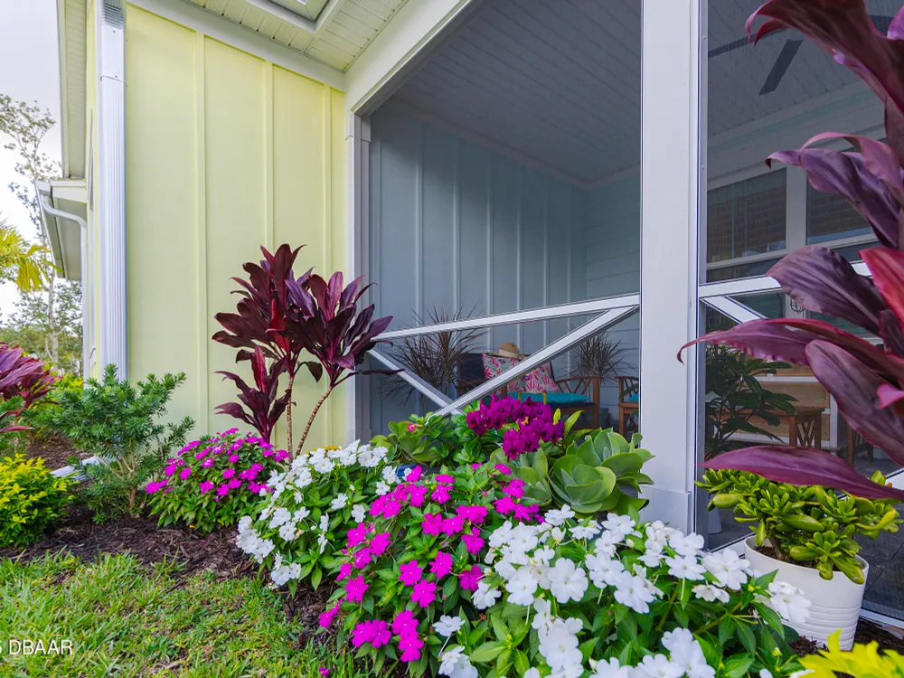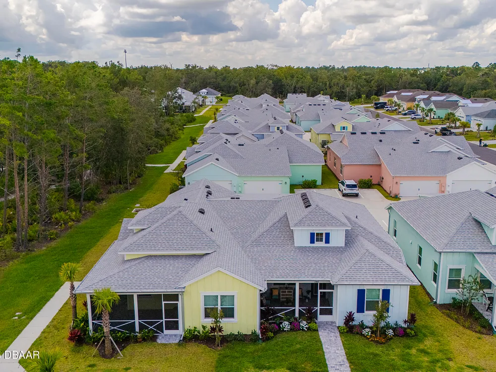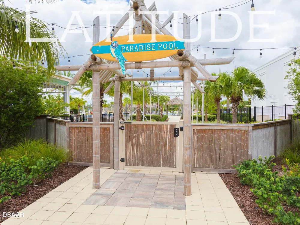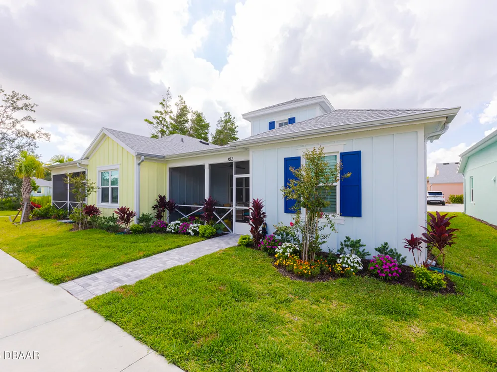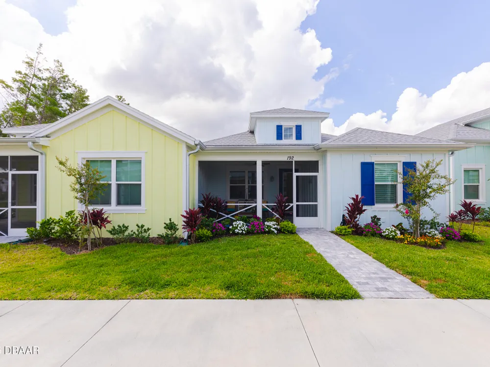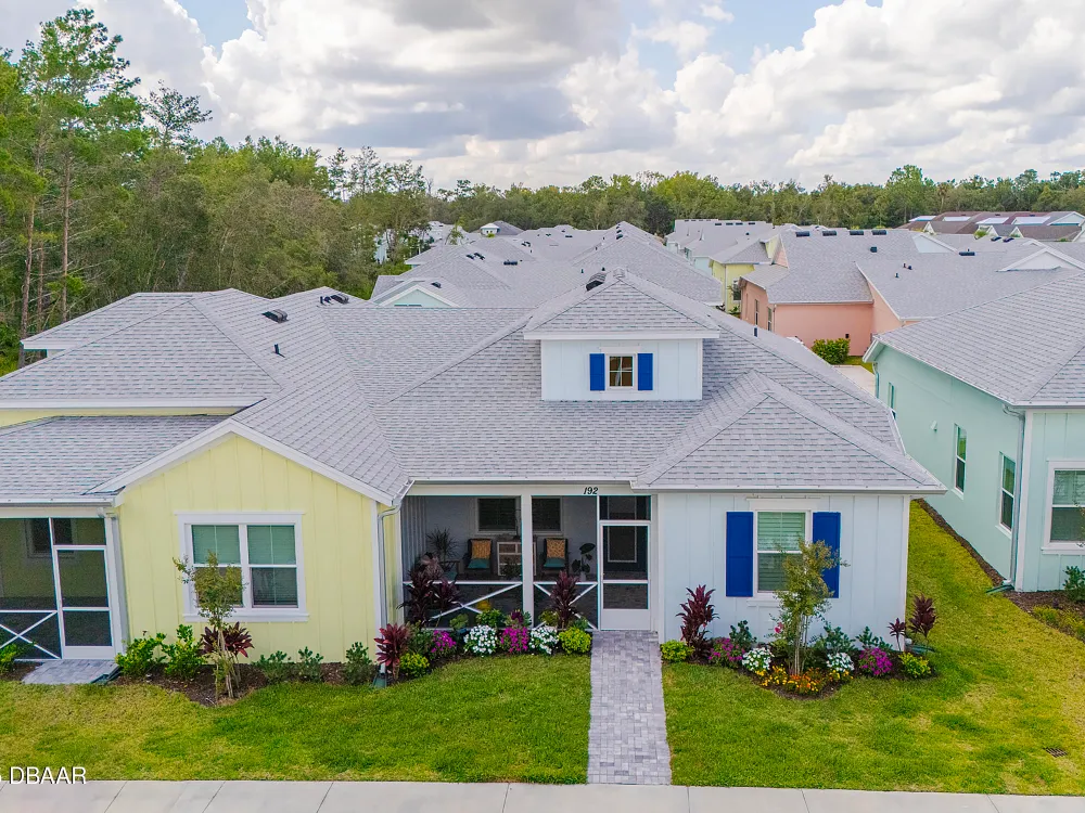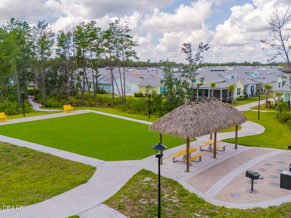 This stunning 2024-built Camellia Conch model offers the perfect blend of island-inspired living and modern comfort. Featuring 2 split bedrooms, 2 bathrooms, and a 2-car garage, this home was thoughtfully designed for both relaxation and entertaining. Step inside to an open-concept layout with bright, airy living spaces and elegant finishes throughout. Upgrades abound with vaulted beams in the living room and neutral colored tile throughout the entire home. Modern looking Plantation blinds and newly painted soft yellow walls in the living area adds a tropical feel. The gourmet kitchen boasts stainless steel appliances, quartz countertops, upgraded 42'' soft close cabinets and a spacious island — ideal for gathering with friends. Additional flex room near the kitchen is so convenient and can accommodate a large dining room table, or could be used as an office. Upgraded lighting and fans. Extra large capacity, front loading GE washer and dryer are included. The owner's suite provides a private retreat with a walk-in closet and spa-style bathroom featuring a glass walk-in shower, double vanity and custom-built storage. A versatile guest bedroom and bath ensure plenty of space for visitors. Enjoy indoor-outdoor living with a spacious screened in lanai with pavers, perfect for morning coffee or evening cocktails. The home is ideally situated near a large green space and park, complete with covered picnic tables and a grill. HOA maintenance of the outside painting and grounds means more time to soak in the Margaritaville lifestyle. Living in the gated community of Latitude Margaritaville means access to world-class amenities: resort-style pools, fitness center, restaurants, live entertainment, private beach club with daily shuttle, tennis, pickleball, bocce, a pet spa and park, and endless activities designed for active adults 55+. Located just minutes from shopping, dining, medical facilities, and the beautiful beaches of Daytona. Whether you're seeking a full-time residence or a tropical getaway, this home is move-in ready and waiting for you!