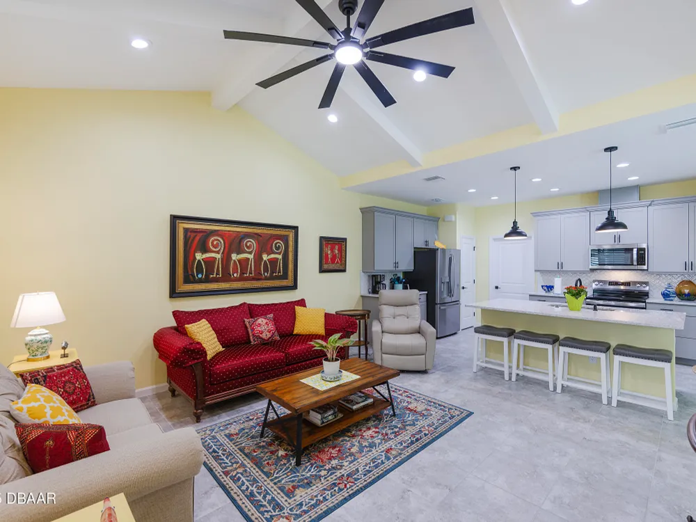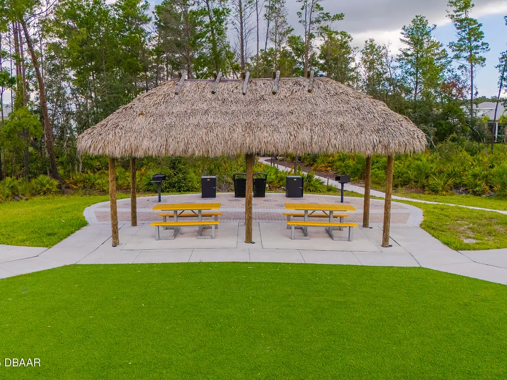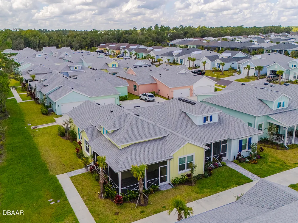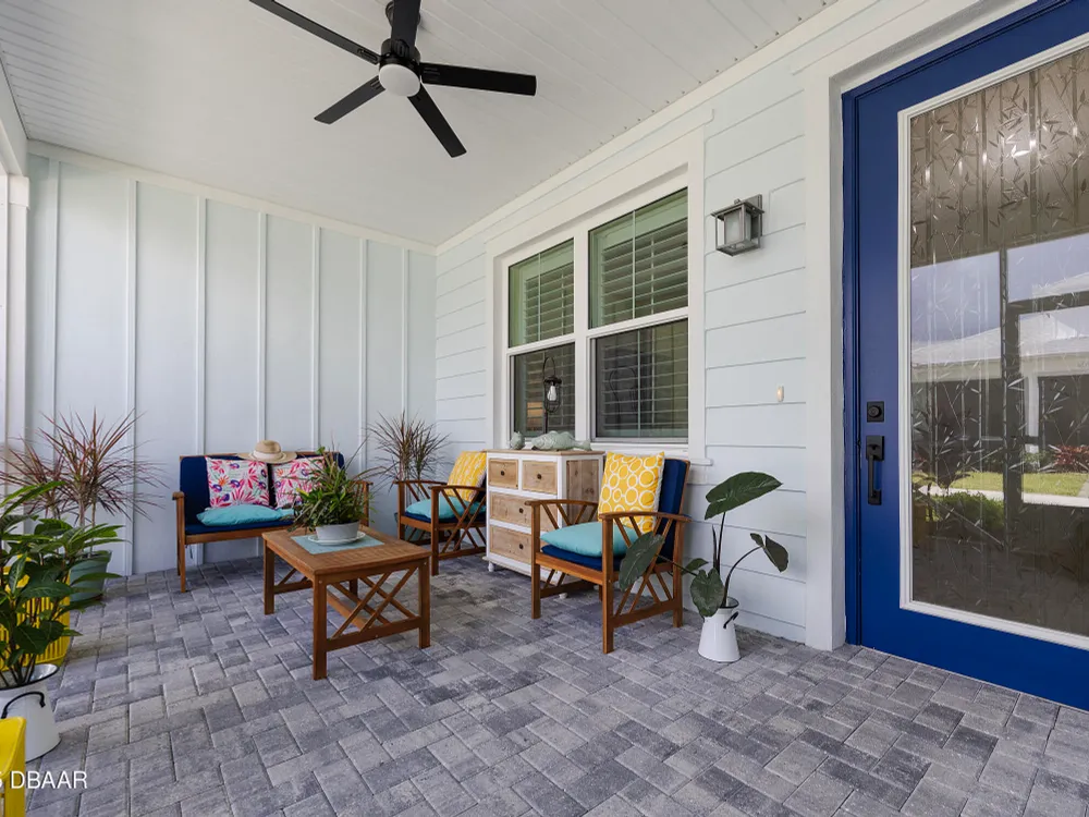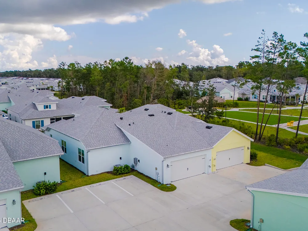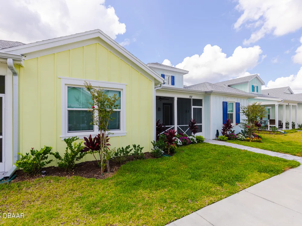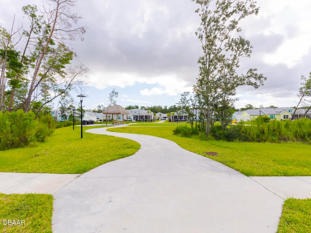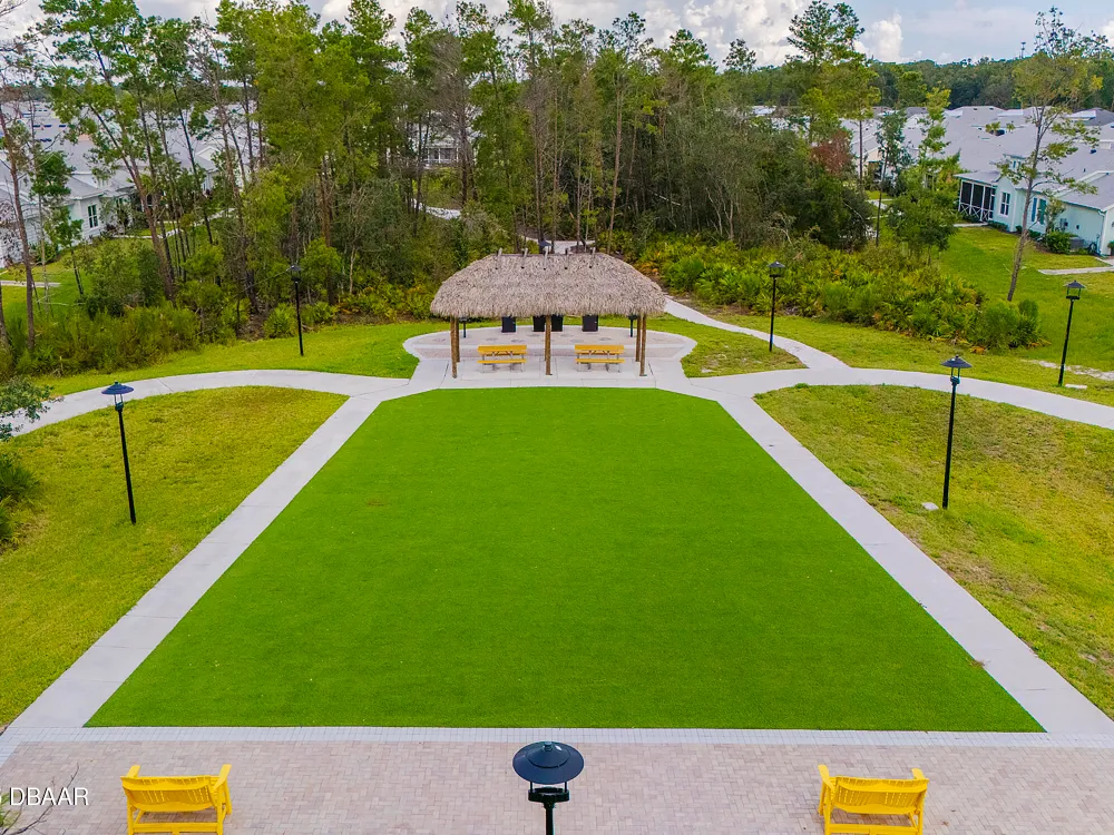 This stunning 2024-built Camellia Conch model offers the perfect blend of island-inspired living and modern comfort. Featuring 2 split bedrooms, 2 bathrooms, and a 2-car garage, this home was thoughtfully designed for both relaxation and entertaining. Step inside to an open-concept layout with bright, airy living spaces and elegant finishes throughout. Upgrades abound with vaulted beams in the living room and neutral colored tile throughout the entire home. Modern looking Plantation blinds and newly painted soft yellow walls in the living area adds a tropical feel. The gourmet kitchen boasts stainless steel appliances, quartz countertops, upgraded 42'' soft close cabinets and a spacious island — ideal for gathering with friends. Additional flex room near the kitchen is so convenient and can accommodate a large dining room table, or could be used as an office. Upgraded lighting and fans. Extra large capacity, front loading GE washer and dryer are included. The owner's suite provides a private retreat with a walk-in closet and spa-style bathroom featuring a glass walk-in shower, double vanity and custom-built storage. A versatile guest bedroom and bath ensure plenty of space for visitors. Enjoy indoor-outdoor living with a spacious screened in lanai with pavers, perfect for morning coffee or evening cocktails. The home is ideally situated near a large green space and park, complete with covered picnic tables and a grill. HOA maintenance of the outside painting and grounds means more time to soak in the Margaritaville lifestyle. Living in the gated community of Latitude Margaritaville means access to world-class amenities: resort-style pools, fitness center, restaurants, live entertainment, private beach club with daily shuttle, tennis, pickleball, bocce, a pet spa and park, and endless activities designed for active adults 55+. Located just minutes from shopping, dining, medical facilities, and the beautiful beaches of Daytona. Whether you're seeking a full-time residence or a tropical getaway, this home is move-in ready and waiting for you!