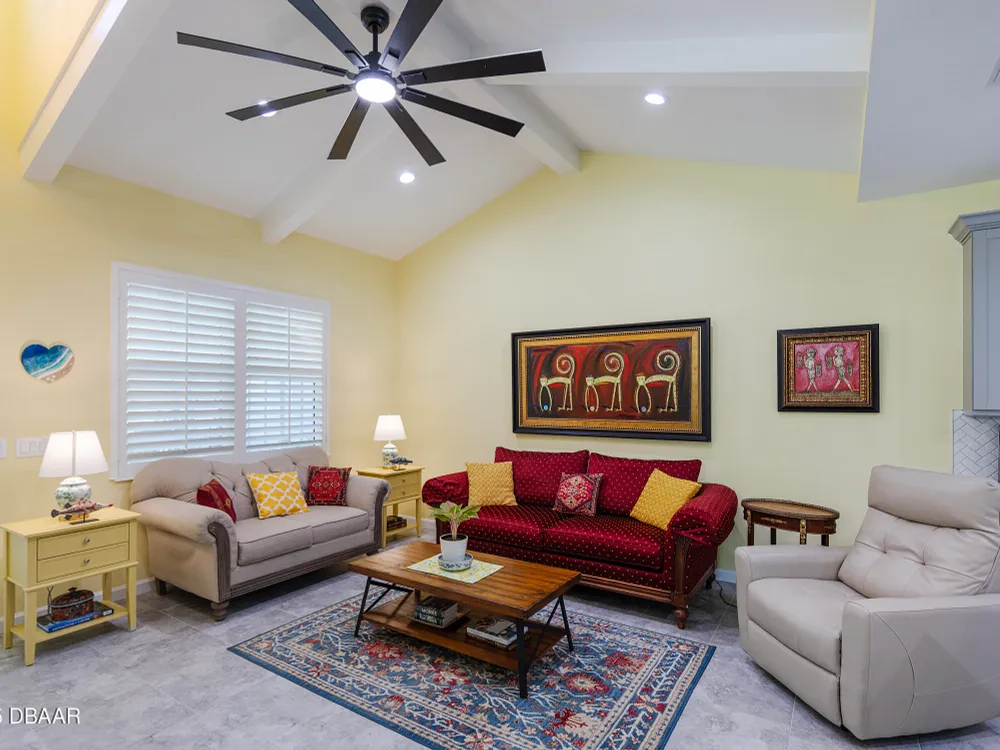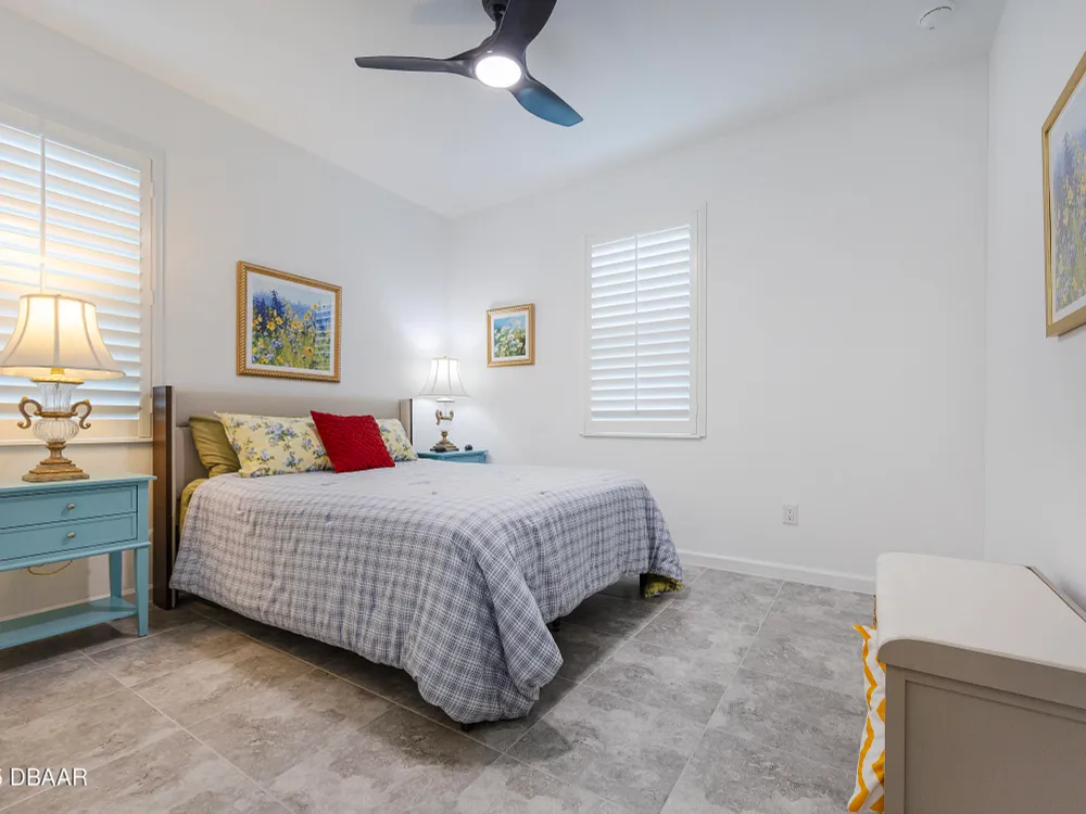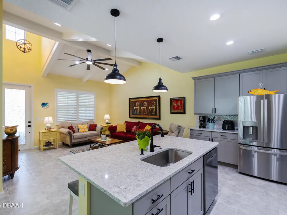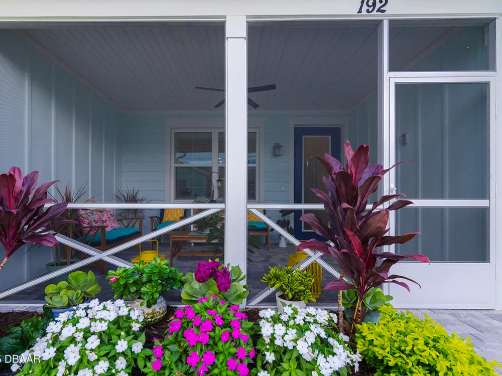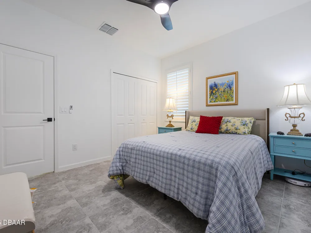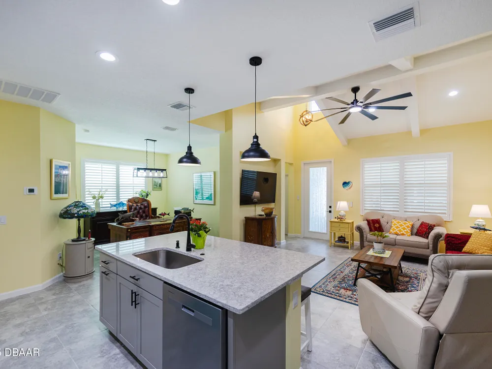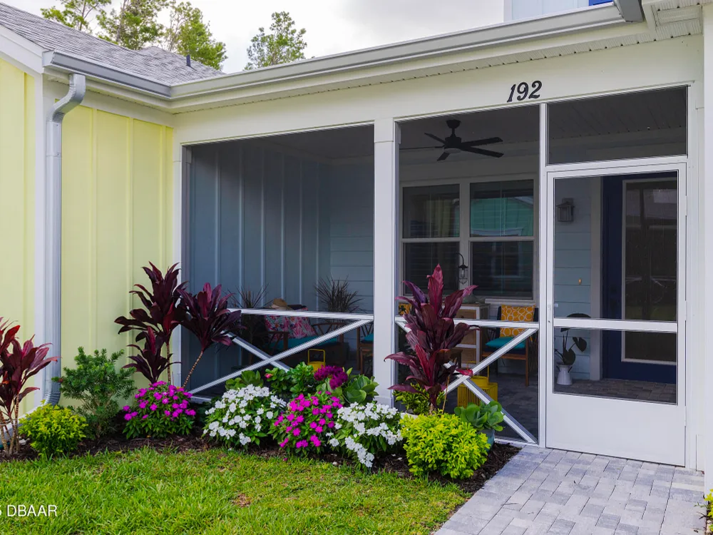 This stunning 2024-built Camellia Conch model offers the perfect blend of island-inspired living and modern comfort. Featuring 2 split bedrooms, 2 bathrooms, and a 2-car garage, this home was thoughtfully designed for both relaxation and entertaining. Step inside to an open-concept layout with bright, airy living spaces and elegant finishes throughout. Upgrades abound with vaulted beams in the living room and neutral colored tile throughout the entire home. Modern looking Plantation blinds and newly painted soft yellow walls in the living area adds a tropical feel. The gourmet kitchen boasts stainless steel appliances, quartz countertops, upgraded 42'' soft close cabinets and a spacious island — ideal for gathering with friends. Additional flex room near the kitchen is so convenient and can accommodate a large dining room table, or could be used as an office. Upgraded lighting and fans. Extra large capacity, front loading GE washer and dryer are included. The owner's suite provides a private retreat with a walk-in closet and spa-style bathroom featuring a glass walk-in shower, double vanity and custom-built storage. A versatile guest bedroom and bath ensure plenty of space for visitors. Enjoy indoor-outdoor living with a spacious screened in lanai with pavers, perfect for morning coffee or evening cocktails. The home is ideally situated near a large green space and park, complete with covered picnic tables and a grill. HOA maintenance of the outside painting and grounds means more time to soak in the Margaritaville lifestyle. Living in the gated community of Latitude Margaritaville means access to world-class amenities: resort-style pools, fitness center, restaurants, live entertainment, private beach club with daily shuttle, tennis, pickleball, bocce, a pet spa and park, and endless activities designed for active adults 55+. Located just minutes from shopping, dining, medical facilities, and the beautiful beaches of Daytona. Whether you're seeking a full-time residence or a tropical getaway, this home is move-in ready and waiting for you!