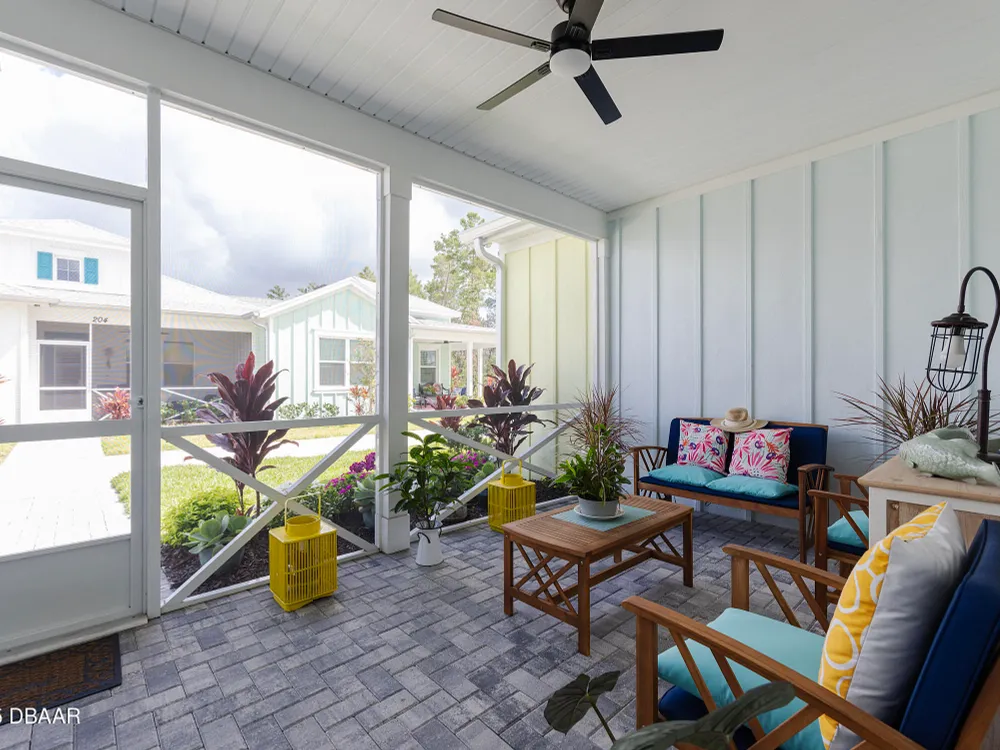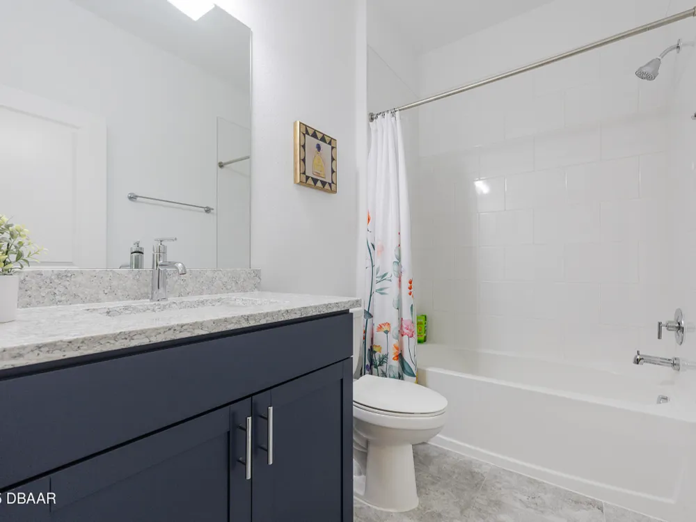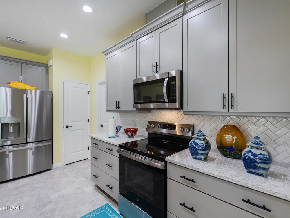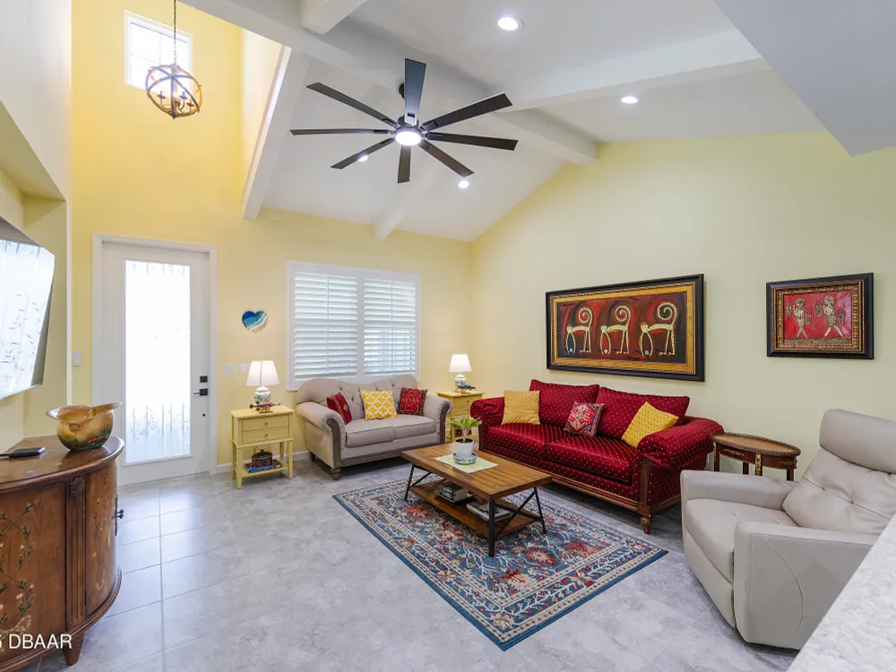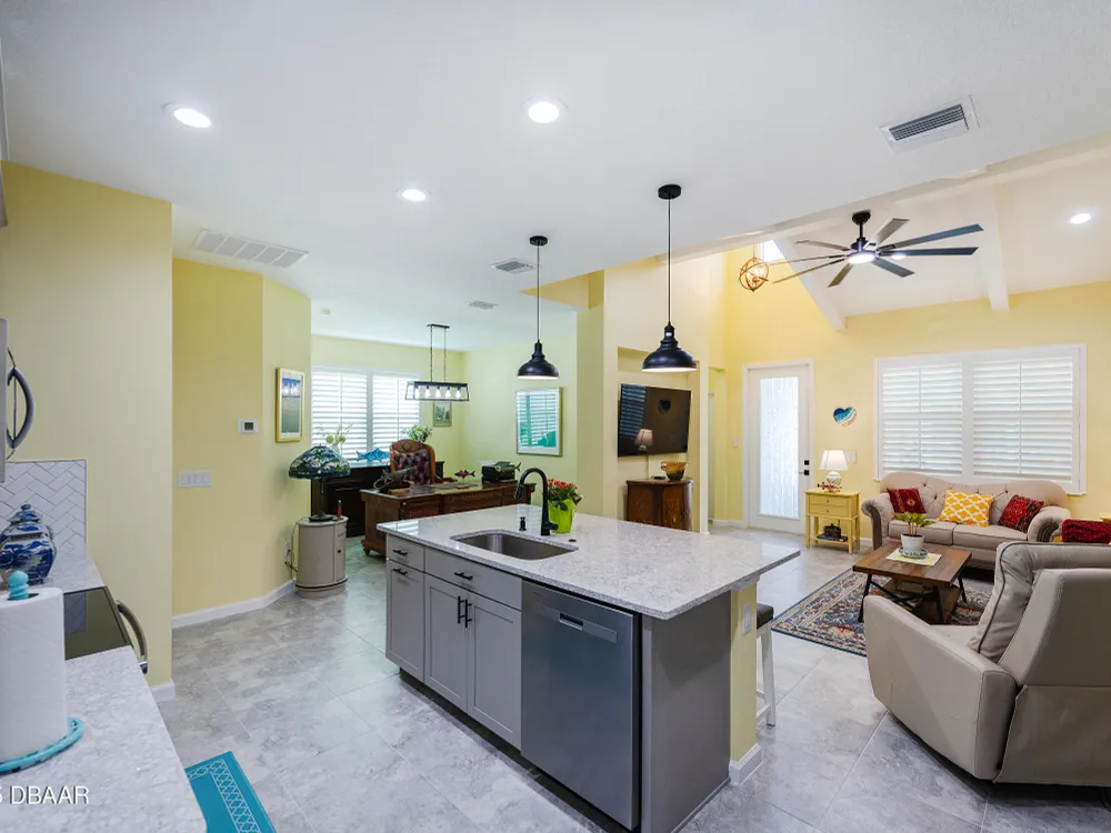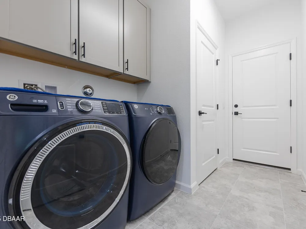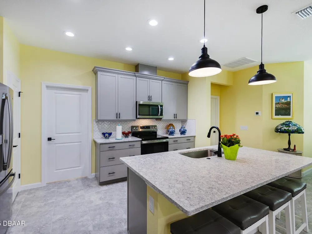 This stunning 2024-built Camellia Conch model offers the perfect blend of island-inspired living and modern comfort. Featuring 2 split bedrooms, 2 bathrooms, and a 2-car garage, this home was thoughtfully designed for both relaxation and entertaining. Step inside to an open-concept layout with bright, airy living spaces and elegant finishes throughout. Upgrades abound with vaulted beams in the living room and neutral colored tile throughout the entire home. Modern looking Plantation blinds and newly painted soft yellow walls in the living area adds a tropical feel. The gourmet kitchen boasts stainless steel appliances, quartz countertops, upgraded 42'' soft close cabinets and a spacious island — ideal for gathering with friends. Additional flex room near the kitchen is so convenient and can accommodate a large dining room table, or could be used as an office. Upgraded lighting and fans. Extra large capacity, front loading GE washer and dryer are included. The owner's suite provides a private retreat with a walk-in closet and spa-style bathroom featuring a glass walk-in shower, double vanity and custom-built storage. A versatile guest bedroom and bath ensure plenty of space for visitors. Enjoy indoor-outdoor living with a spacious screened in lanai with pavers, perfect for morning coffee or evening cocktails. The home is ideally situated near a large green space and park, complete with covered picnic tables and a grill. HOA maintenance of the outside painting and grounds means more time to soak in the Margaritaville lifestyle. Living in the gated community of Latitude Margaritaville means access to world-class amenities: resort-style pools, fitness center, restaurants, live entertainment, private beach club with daily shuttle, tennis, pickleball, bocce, a pet spa and park, and endless activities designed for active adults 55+. Located just minutes from shopping, dining, medical facilities, and the beautiful beaches of Daytona. Whether you're seeking a full-time residence or a tropical getaway, this home is move-in ready and waiting for you!