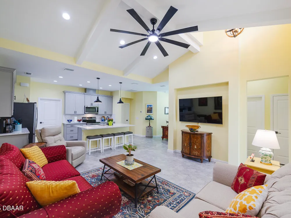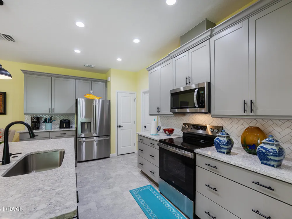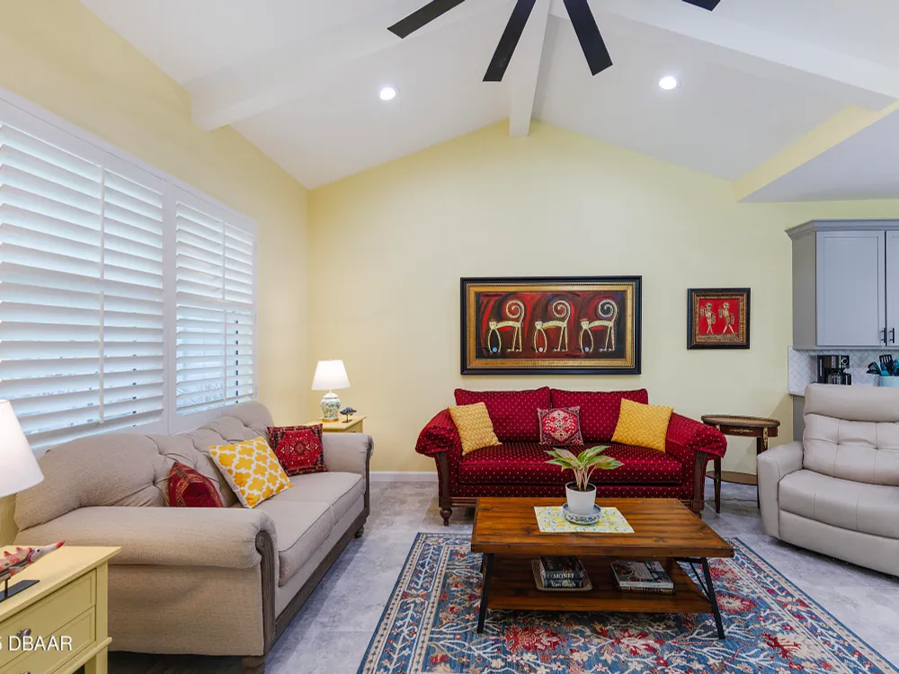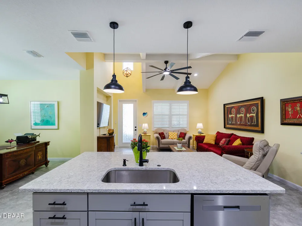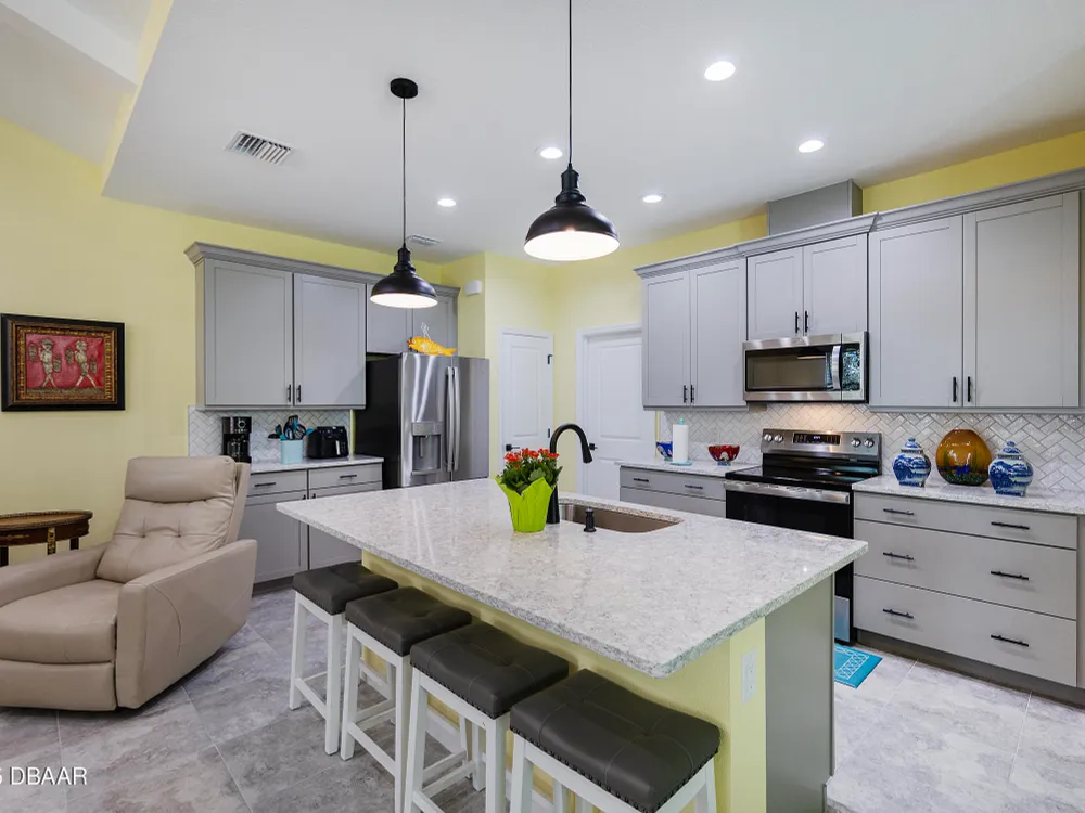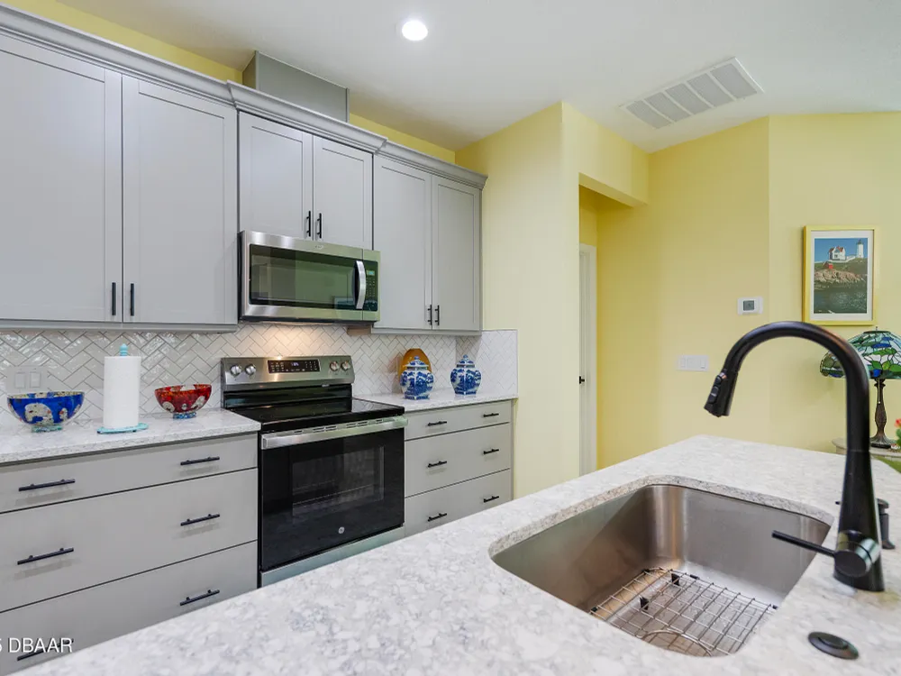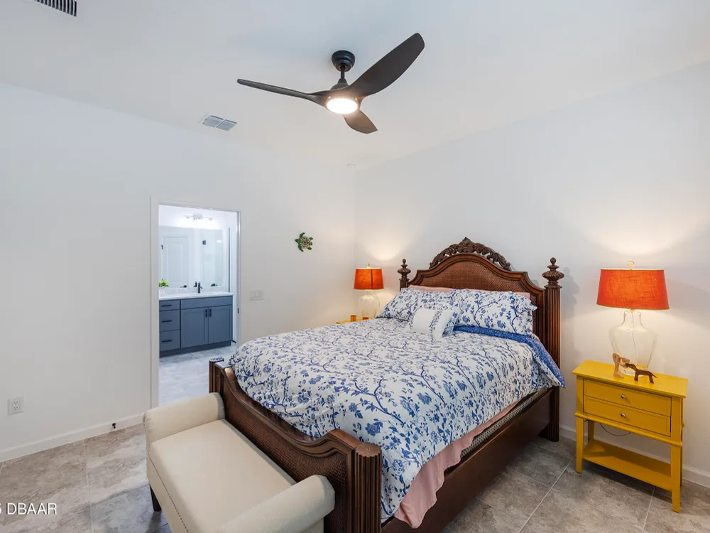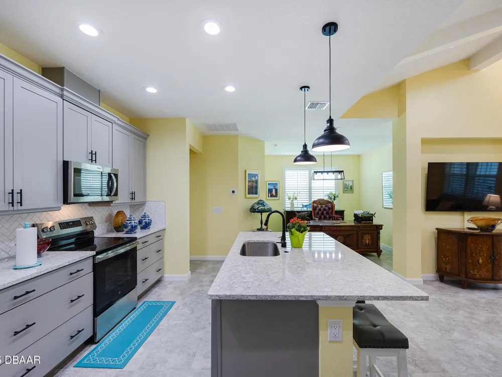 This stunning 2024-built Camellia Conch model offers the perfect blend of island-inspired living and modern comfort. Featuring 2 split bedrooms, 2 bathrooms, and a 2-car garage, this home was thoughtfully designed for both relaxation and entertaining. Step inside to an open-concept layout with bright, airy living spaces and elegant finishes throughout. Upgrades abound with vaulted beams in the living room and neutral colored tile throughout the entire home. Modern looking Plantation blinds and newly painted soft yellow walls in the living area adds a tropical feel. The gourmet kitchen boasts stainless steel appliances, quartz countertops, upgraded 42'' soft close cabinets and a spacious island — ideal for gathering with friends. Additional flex room near the kitchen is so convenient and can accommodate a large dining room table, or could be used as an office. Upgraded lighting and fans. Extra large capacity, front loading GE washer and dryer are included. The owner's suite provides a private retreat with a walk-in closet and spa-style bathroom featuring a glass walk-in shower, double vanity and custom-built storage. A versatile guest bedroom and bath ensure plenty of space for visitors. Enjoy indoor-outdoor living with a spacious screened in lanai with pavers, perfect for morning coffee or evening cocktails. The home is ideally situated near a large green space and park, complete with covered picnic tables and a grill. HOA maintenance of the outside painting and grounds means more time to soak in the Margaritaville lifestyle. Living in the gated community of Latitude Margaritaville means access to world-class amenities: resort-style pools, fitness center, restaurants, live entertainment, private beach club with daily shuttle, tennis, pickleball, bocce, a pet spa and park, and endless activities designed for active adults 55+. Located just minutes from shopping, dining, medical facilities, and the beautiful beaches of Daytona. Whether you're seeking a full-time residence or a tropical getaway, this home is move-in ready and waiting for you!