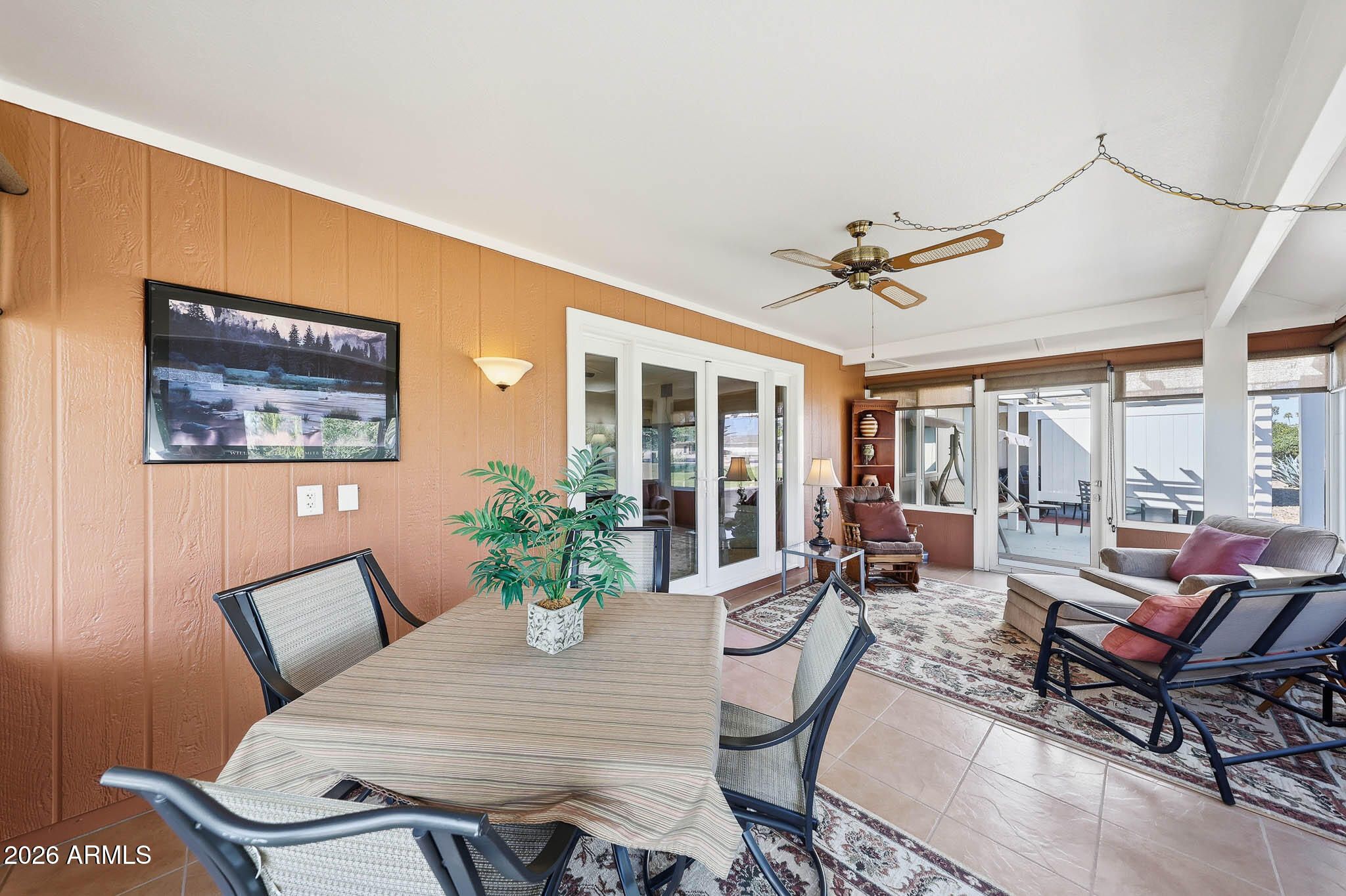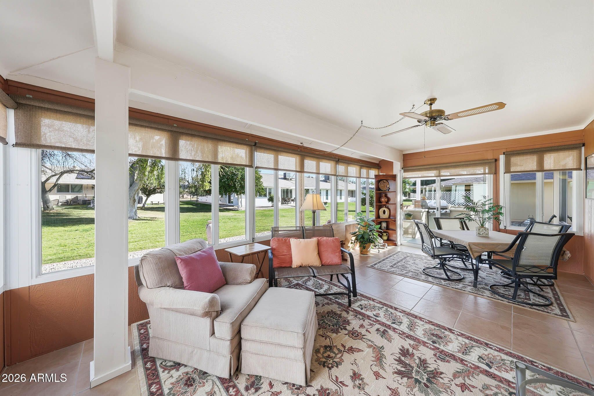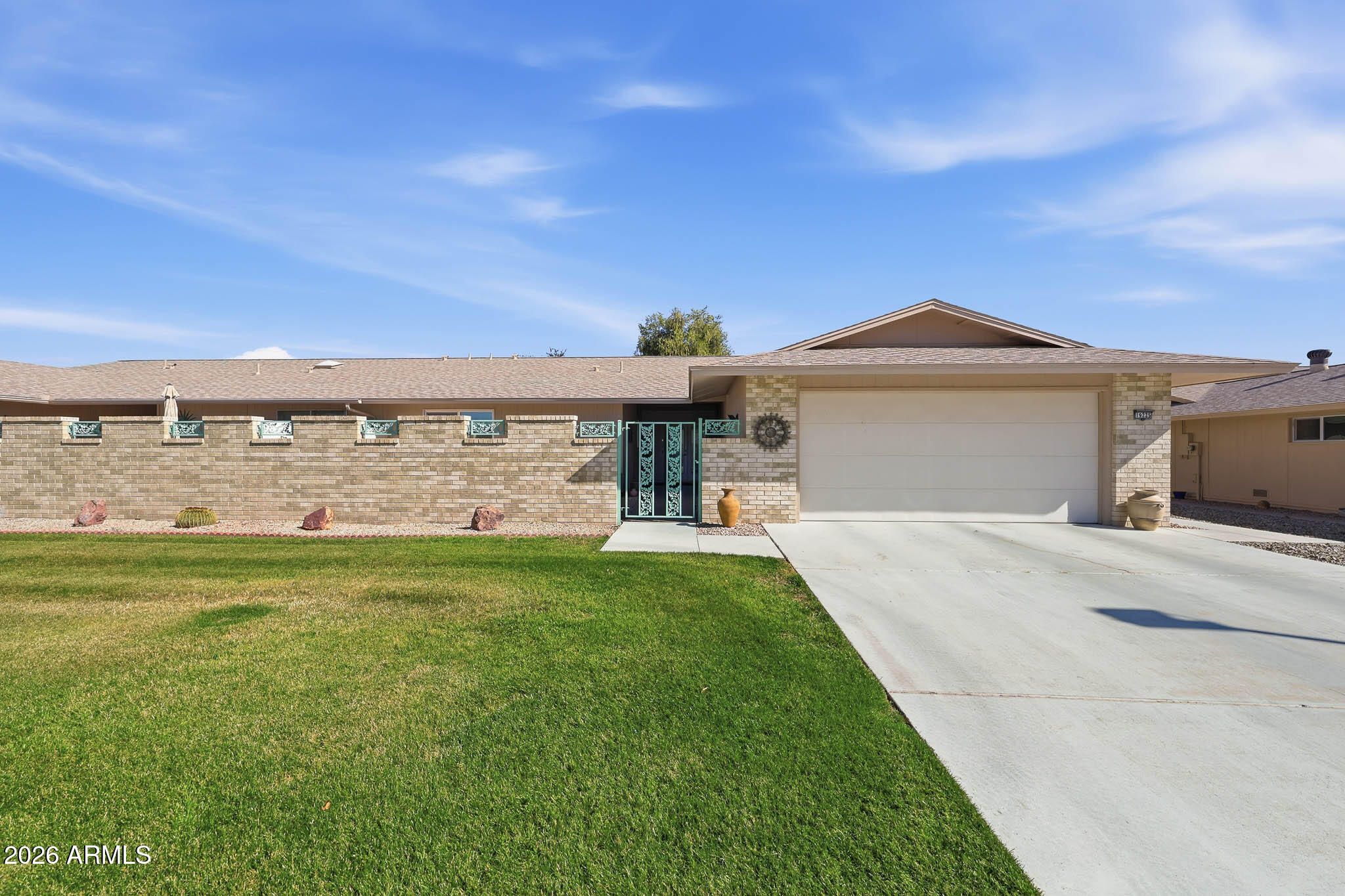 Welcome To This Expanded And Move-In Ready D-7623 Gemini Twin Home Located In Desirable Phase 3 Of Sun City. Thoughtfully Modified Over Time, This Home Offers Both Comfort And Functionality With Numerous Updates Throughout (Ask For The Full List!). The Private Front Courtyard Features Attractive Pavers And Is Enclosed By A Block Wall Fence, Creating A Welcoming Outdoor Space. Major Improvements Include A Roof Approximately 10 Years Old, A Main A/C Installed In 2025, And A Mini-Split A/C Added In 2020 For Better Balance Of Heat And Cooling Throughout The Home. Additional Attic Insulation Enhances Energy Efficiency. Inside, You'll Find A Blend Of Tile And Carpet Flooring, Popcorn Ceilings Removed, Ceiling Fans In All Rooms, And Upgraded 6-Panel Interior Doors. A Spacious Arizona Room Just Off The Living Room Adds Living Space And Is Perfect For Relaxing Or Entertaining. The Kitchen Has Been Updated With Newer Cabinetry, Pull-Out Shelving In The Lower Cabinets, A Dual-Level Utensil Drawer, And A Built-In Wine Rack. Both Bedrooms Feature Walk-In Closets. The Guest Bathroom Includes An Updated Vanity, While The Primary Bathroom Offers A Tiled Walk-In Shower And Updated Vanity. There Is Truly So Much To Appreciate In This Well-Maintained Home. Be Sure To Add This One To Your Must-See List!