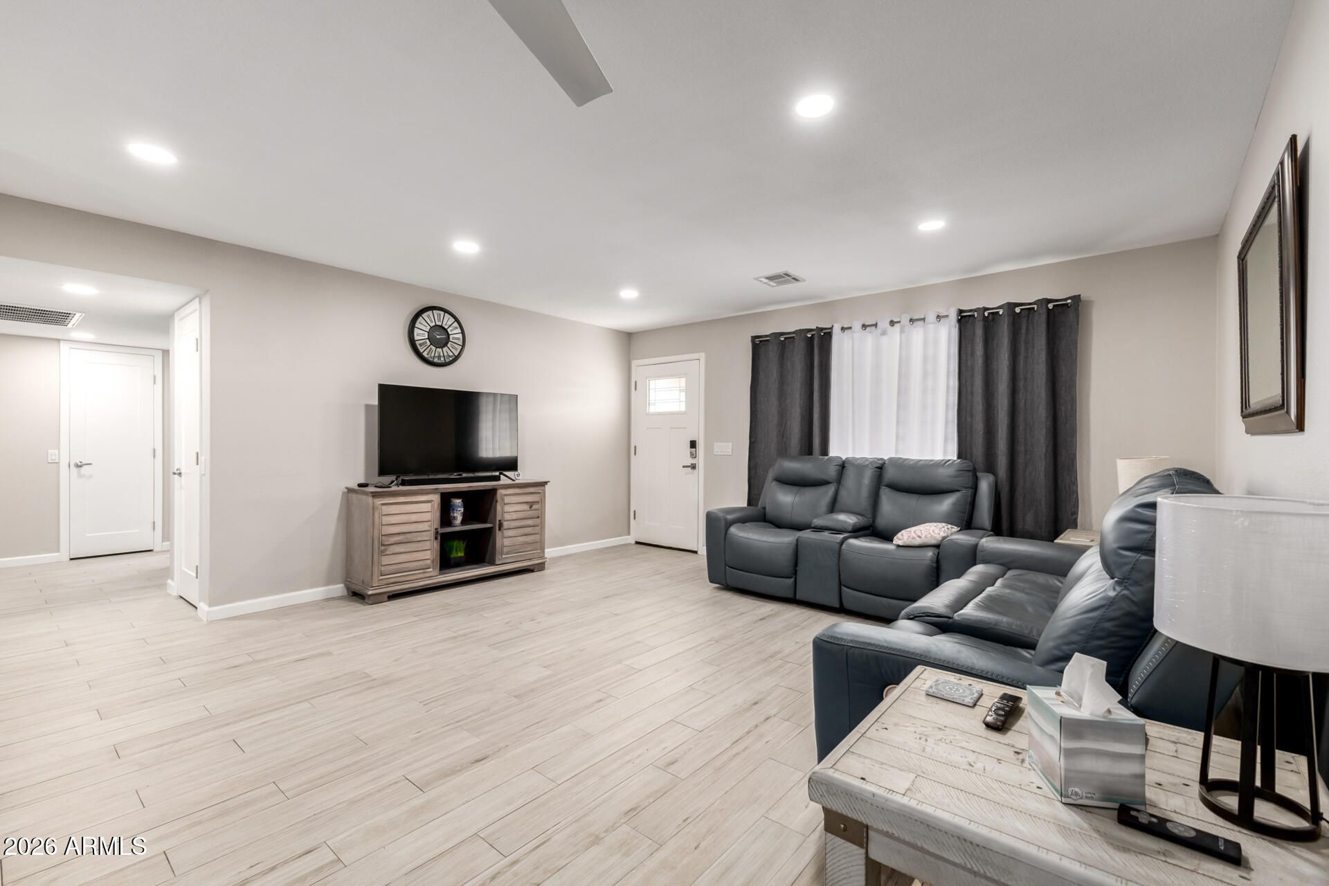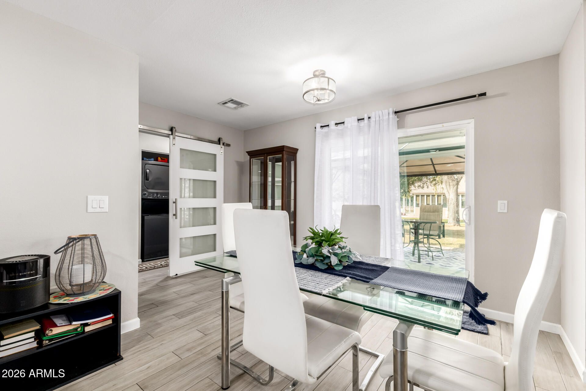 Completely remodeled in 2022, this stunning home offers high-end finishes & thoughtful upgrades throughout. Inside, the designer kitchen showcases quartz countertops, stainless steel appliances, an oversized island with bar seating, all flowing seamlessly into the dining & living areas. Both bathrooms are fully remodeled with updated fixtures, sinks, shower tile & glass doors. Additional highlights include wood look ceramic tile flooring throughout & an indoor laundry/craft space with washer & dryer. Enjoy