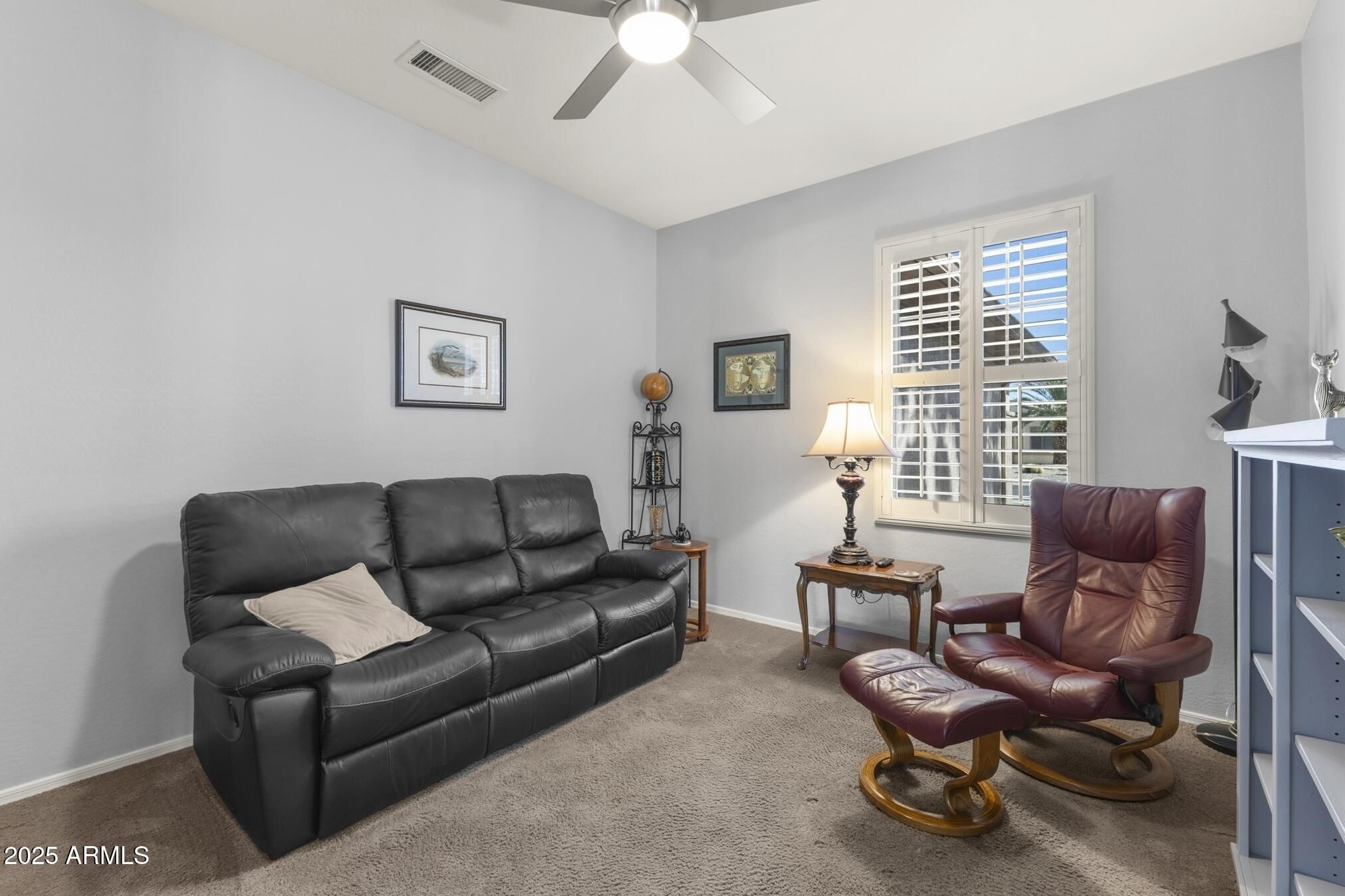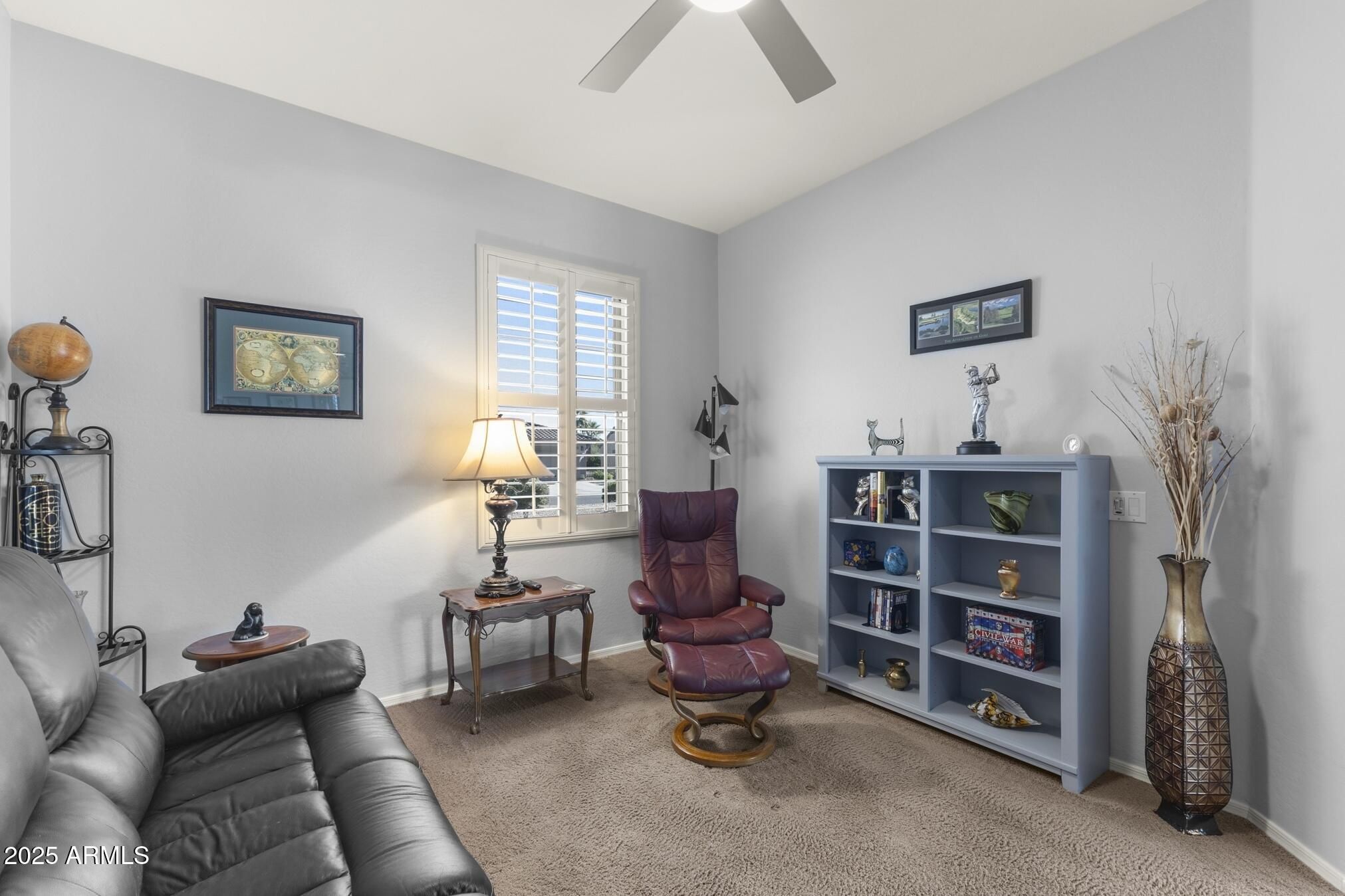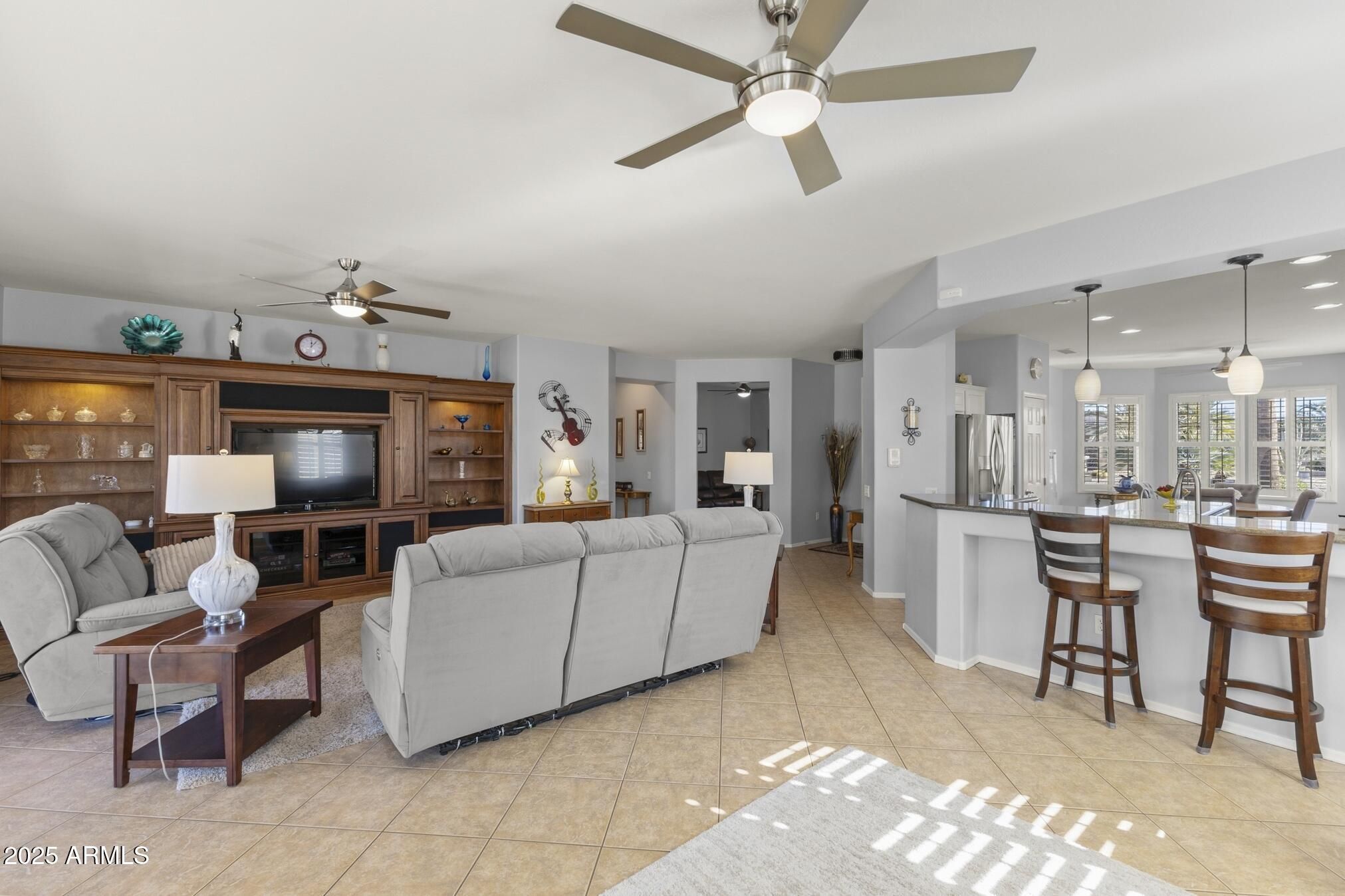 TURN-KEY GEM HAS STYLE & SPACE! This furnished 2 bedroom, 2 bath Sierra is move-in ready. A bright, spacious kitchen features white cabinets, granite counters, glass-tile backsplash, stainless appliances, a bay-window in the breakfast nook, a large island, deep undermount sink, brushed-nickel faucet and an R/O system. A custom built-in media wall in the Great Room, plantation shutters and 16'' diagonal tile adds extra flair. The oversized primary suite with bay window is a perfect retreat. The updated bath features tiled shower, quartz counters, dual undermount sinks, new faucets, and toilet. The updated guest bath has a quartz top, tiled shower/tub combo, glass door, and new fixtures. Carpeted bedrooms and den, newer interior paint, and LED lighting throughout add comfort and style. Additional Upgrades include: Energy-efficient HVAC (2022) Newer gas water heater Whole-home water softener Inside laundry with cabinets, hard surface countertop, and stainless utility sink Extended 2-car garage with epoxy floor, newly painted walls, and painted cabinets for storage Coated driveway Security door Central alarm system Gutters & Downspouts( Extended covered patio, coated surface and ceiling fans, perfect for relaxing or entertaining Block-walled yard offers plenty of privacy LED landscape lighting PVC irrigation system Lemon and orange trees