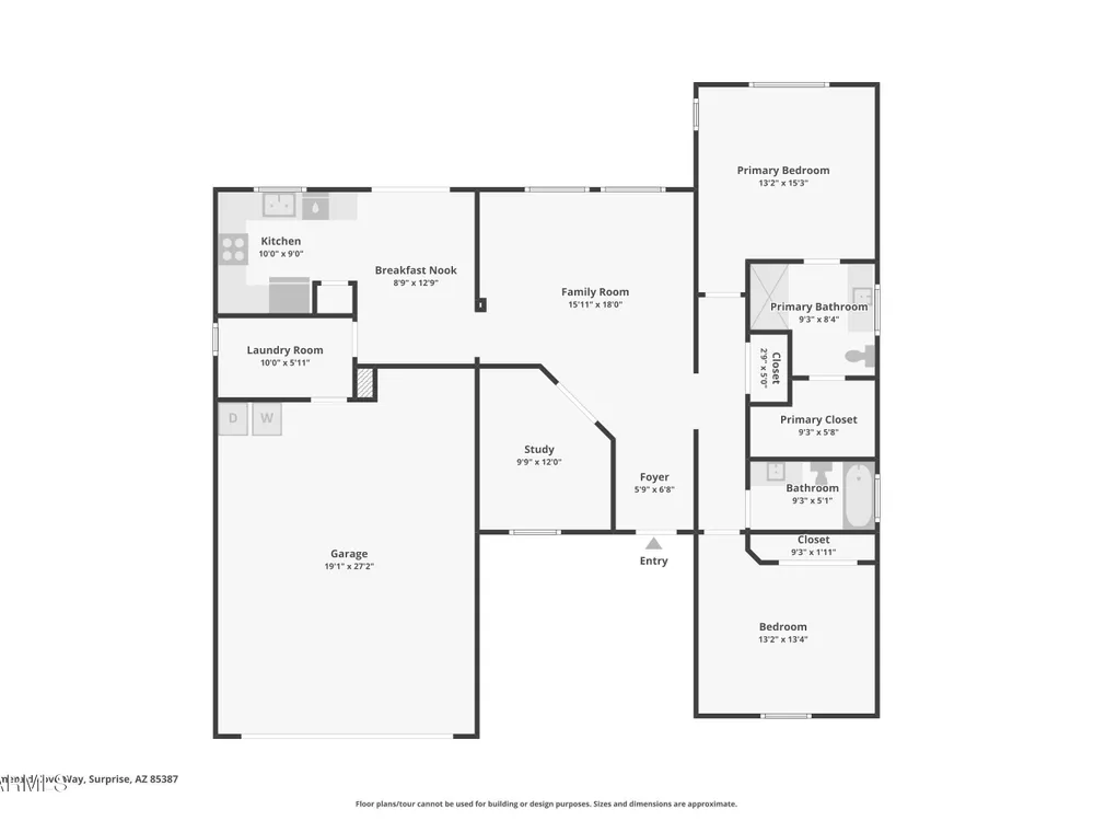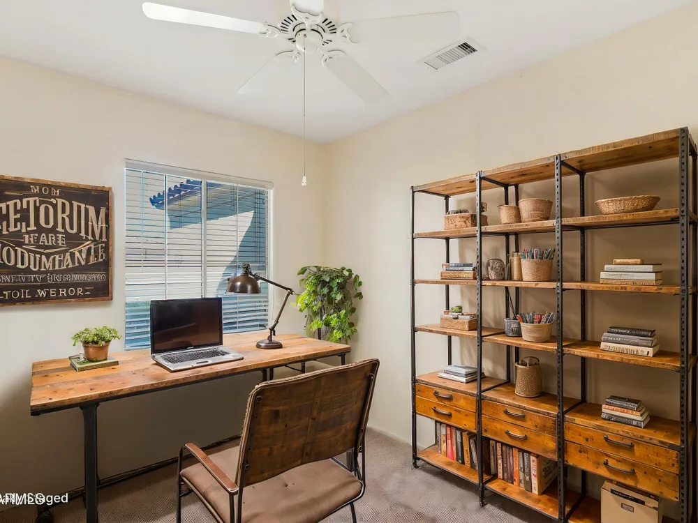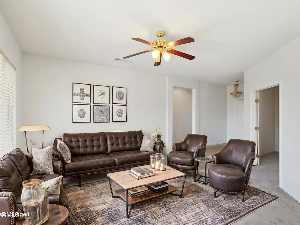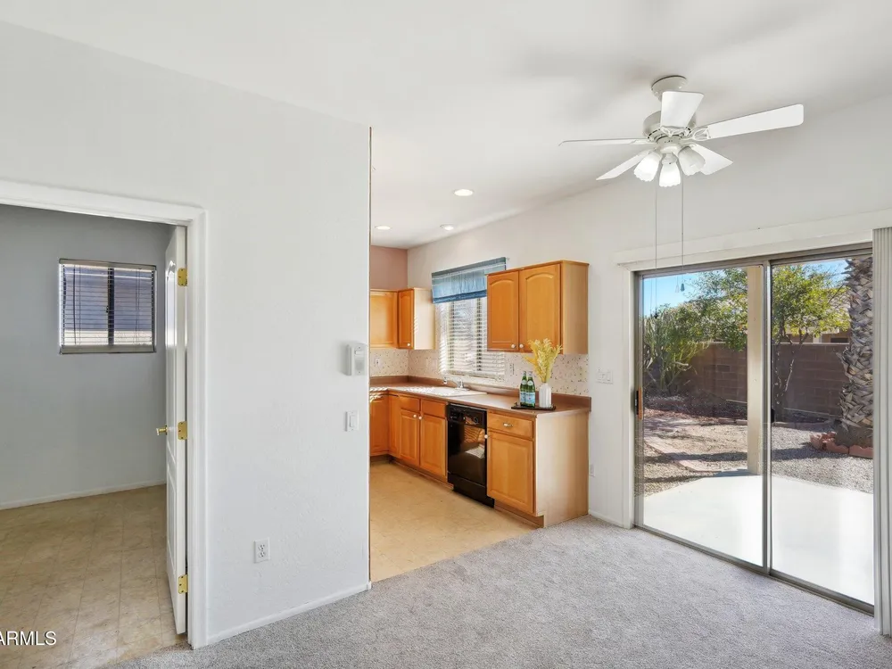 Wonderful Home in this 55+ Active Adult Community of The Grand in Surprise. Upon entry, you'll find a light & bright, freshly painted interior (2024) and updated carpet throughout (2024). 2/BD 2/BA plus Den/office with double doors. The functional kitchen offers a nice pantry with plenty of cabinets and black appliances. The stylish dividing wall between the dining and living rooms is a nice touch. There is a bonus laundry/flex room off the garage that is plenty large for crafts, or just extra storage. The Primary bedroom has dual sinks and a large walk-in closet. The 2-car EXTENDED GARAGE is large enough to park a golf cart. The backyard offers an EXTENDED COVERED PATIO, fruit trees and low maintenance landscape. The perfect place to enjoy year-round entertaining and beautiful sunsets. The HOA covers front yard landscape maintenance, ensuring you'll always have a beautiful, manicured yard, without the fuss. Conveniently located in Suprise, just off the 303 freeway, Sun City Grand offers so many activities including multiple Golf Courses, pools, tennis courts, workout facilities and dining options. Walking and biking trails throughout the community ensure you stay active year-round. Live your best life in a great community, where you'll feel like you're on vacation every day! Upgrades include: *Interior Paint *New Carpet *Designated office or den with french doors *Flex room off of garage used as laundry, office, storage or craft room *Custom divider wall between dining and living room with built in shelving *Large walk-in closet in primary bedroom *Gas water heater for efficiency *Extended 2 car garage *Front yard landscape maintained by the HOA *Security screen door *Extended covered back patio *Fruit trees and drip system in low maintenance backyard Community offers Golf, community center with clubhouse, tennis, pools, restaraunts and lots of community activities.