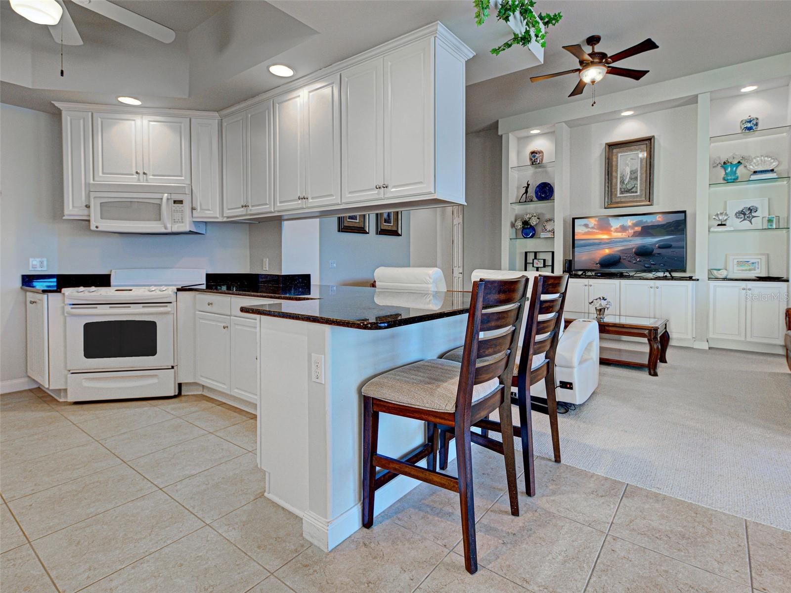 - Built-in Features, Ceiling Fan(s), Eat-in Kitchen, High Ceilings, Main Level Primary, Solid Surface Counters, Solid-Wood Cabinets, Split Bedrooms, Thermostat, Walk-In Closet(s), Window Treatments
