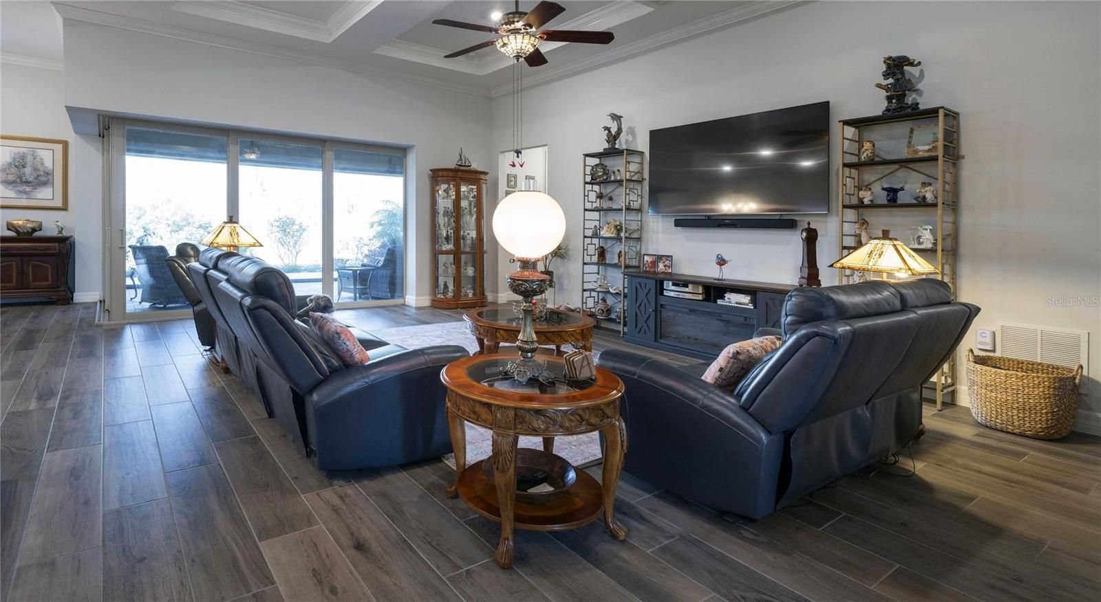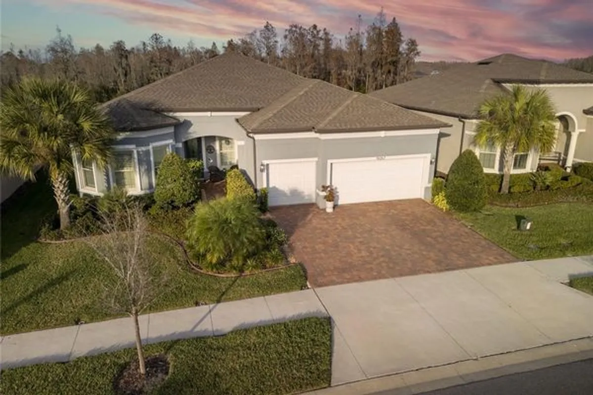 This Beautiful 3-Bedroom, 3-Bath home with a den and 3-car garage on a premium lot backing up to conservation, with no rear neighbors, is located in an active-lifestyle 55+ community of Del Webb in the Bexley subdivision. From the attractive sealed paver driveway, walkway and front porch, enter the foyer to the spacious open floor plan with 12-foot ceilings in the main living area, wood-look ceramic tile planks and crown molding throughout the home, 8-foot doors, with plantation shutters on all windows. The large kitchen features an oversized island, quartz countertops, a 5-burner gas cooktop, dishwasher, a hot-water booster under the sink, a built-in microwave and oven that can be used as a convection oven and walk-in pantry. The separate dining/café’ area with a picture window overlooking the lanai and conservation is perfect for breakfast, lunch, or dinner parties. The kitchen overlooks the great room with its beautiful coffered ceiling. The upgraded disappearing corner sliders in the café’ and great room give easy access to the pavered custom lanai and add to the home’s spaciousness. The lanai features a remote-control screen for outdoor living. The luxurious main bedroom with a lovely en-suite bath and a large walk-in closet is the perfect retreat. The 3-way split-bedroom plan offers complete privacy in each of the other 2 bedrooms, with their own baths. The community features security measures such as gated access and surveillance cameras, providing added safety for active-lifestyle residents. The laundry room includes custom cabinetry with a built-in sink. The extended 3-car garage, with wall cabinetry and a sealed floor, is fully insulated and air conditioned. There are also 4 electric drop-down shelving units hung from the ceiling of the garage for addition storage. The home also includes a water purifier and softener, gutters, and tankless water heater. All lawn maintenance is provided by the HOA so that you can enjoy the many amenities of the 19,000 square foot clubhouse with café’, arts and crafts room, ballroom and fitness center. Swim in the lap pool lanes, the resistance pool, hot tub, bocce, tennis and pickleball courts, dog park, community garden, and a full-time lifestyle director planning multiple activities and events.