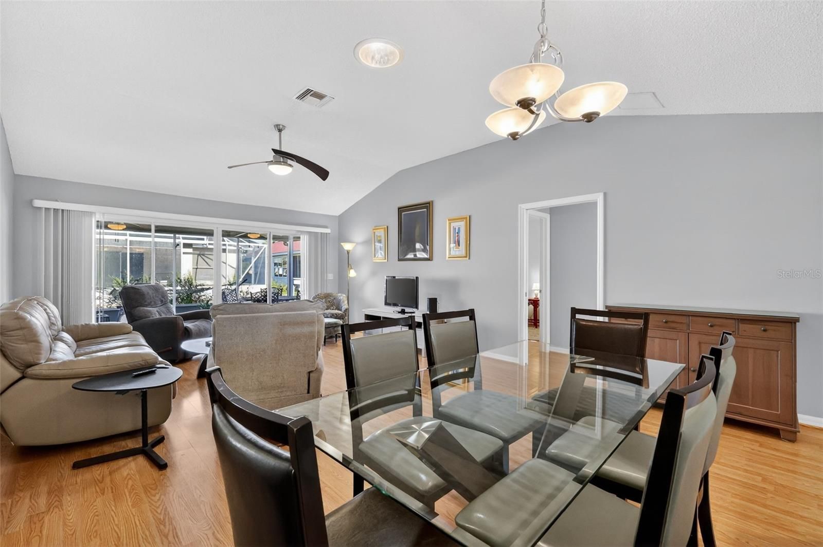 - Ceiling Fan(s), Eat-in Kitchen, Living/Dining Room, Open Floorplan, Main Level Primary, Split Bedrooms, Thermostat, Vaulted Ceiling(s), Walk-In Closet(s)
