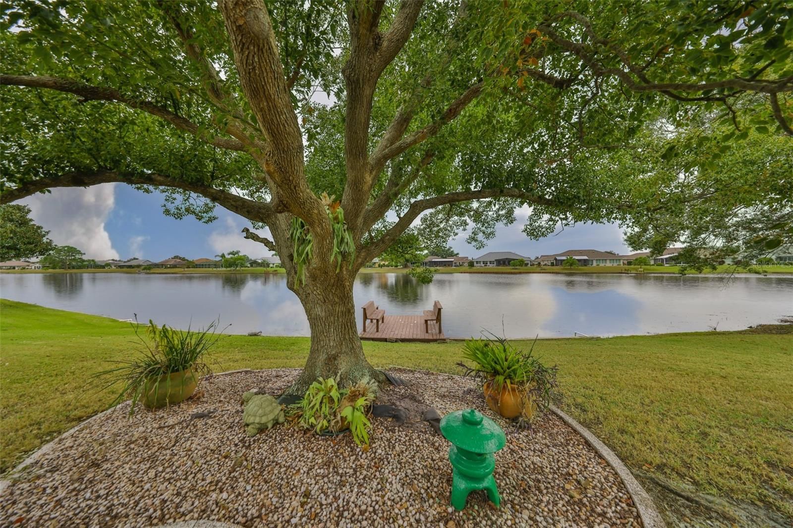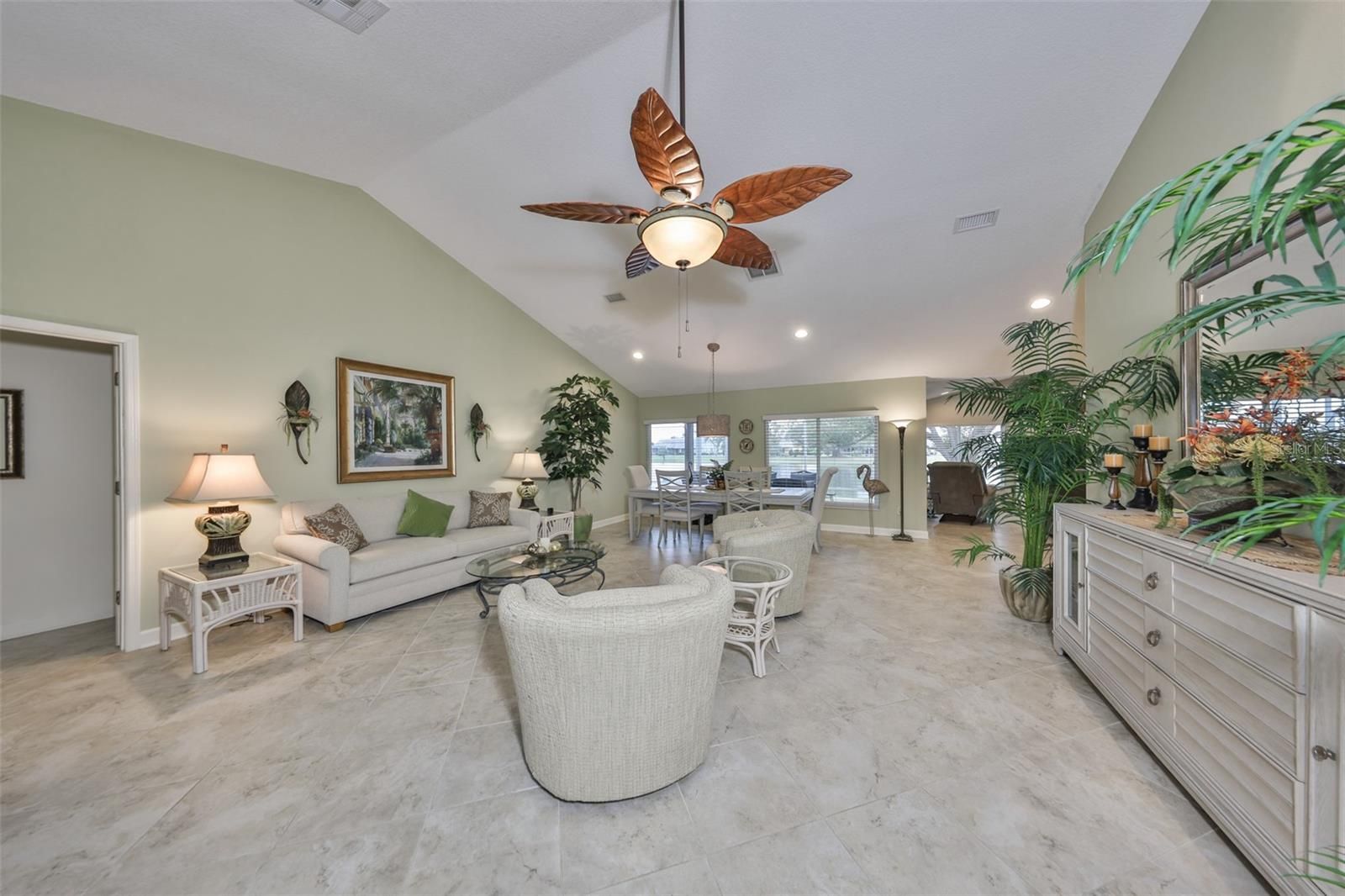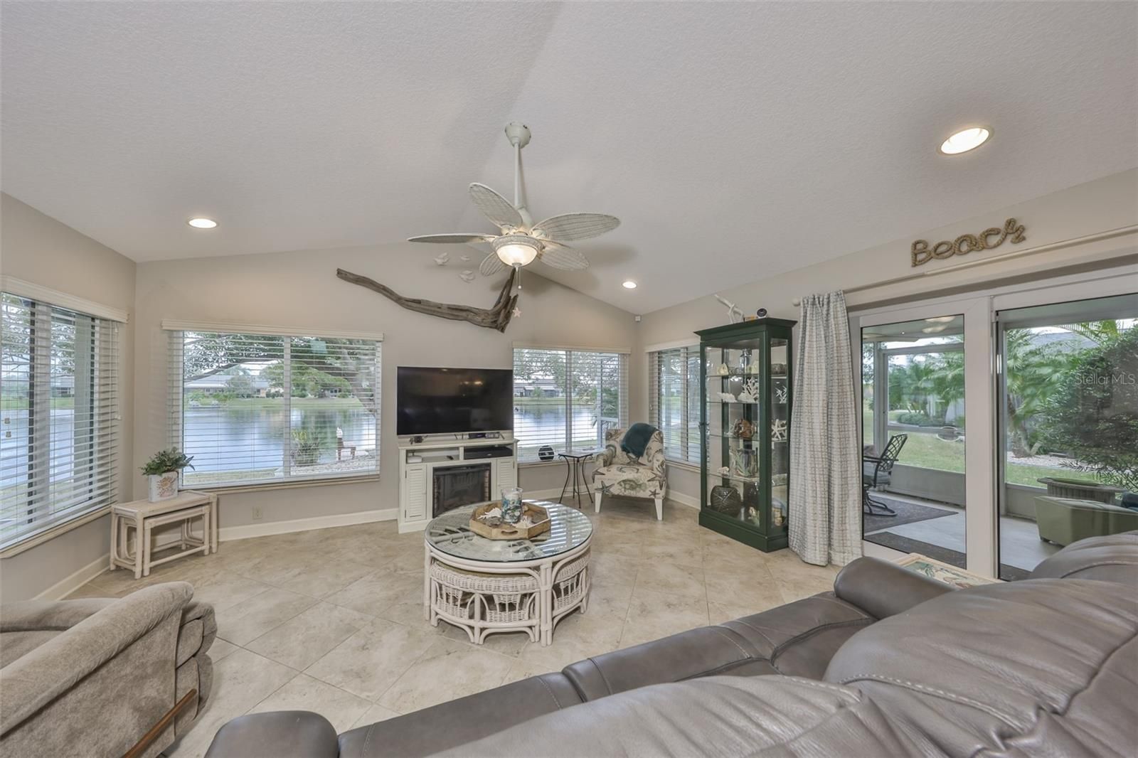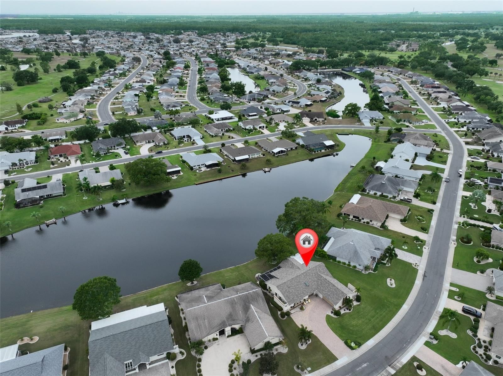 WELCOME TO YOUR OWN PIECE OF PARADISE WITH A WATER VIEW FROM ALMOST EVERY ROOM, LOW HOA & IRRIGATION FROM THE LAKE! This HGTV inspired, totally remodeled home would be the envy of all your neighbors. It is in the beautiful Caloosa Country Club ESTATES of the North side of Sun City Center. When you drive up to this property, you'll immediately notice the spacious lot & lush grass, expansive paved driveway, and impressive curb appeal. Walk through the front door & you will be amazed at the modern feel & every superb detail not to mention the breathtaking view of the Caloosa Lake. Featuring 18” classic porcelain tile and popcorn-free ceilings across the main living area, this newly remodeled home offers a redesigned kitchen and living space that enhances both functionality and flow, all while highlighting beautiful water views and local wildlife. Enjoy the neutral color scheme, upgraded fans, fixtures & electric switches, energy efficient windows & sliders, Velux Solar Fresh-Air Skylight, custom blinds, and 2 fabulous & distinct outdoor living spaces. The centrally located, modern kitchen features SS Bosh appliances, beverage refrigerator, ample soft close cabinets, drawers, & pull-outs, lovely granite countertops with coordinating stone backsplash, and a convenient breakfast bar. The main bedroom's ensuite boasts a spacious walk-in closet, carefully designed with generous hanging areas, organized shelving, and cabinets offering abundant drawer storage. The primary bath has dual vanities, a corner spa tub positioned beneath a sunny window with a pleasant court yard view, tiled walk-in shower, and separate linen & water closets. The split floor plan has the 2nd & 3rd bedrooms on the opposite side of this home which allows for maximum privacy for you & your guests. The guest bathroom features an elegant renovation, including a tall vanity, a coordinating linen cabinet, and an attractive tiled shower. The interior laundry room has overhead cabinets, utility sink, & 2 nice sized closets-great for storage & keeping you and your home organized. The 2-car garage has a rear garage door entrance allowing easy access to your phenomenal yard & dock. 2024: Hot Water Heater, New Irrigation System, 2 Separate Outdoor Living Spaces, Rolldown Hurricane Shutters. This home offers too many upgrades to list it truly is a MUST SEE! Ask for the Home Feature Sheet Sun City Center is an active 55+ golf cart community that offers indoor & outdoor pools & spas, a well-equipped fitness center, a community hall, library, arts/crafts, outdoor sports, Pickleball and golf. This home has too many upgrades to list, OUICK schedule your showing, or you will miss one of the best houses in SCC.