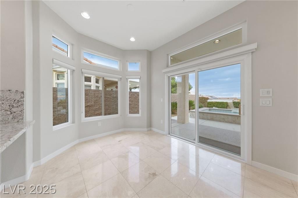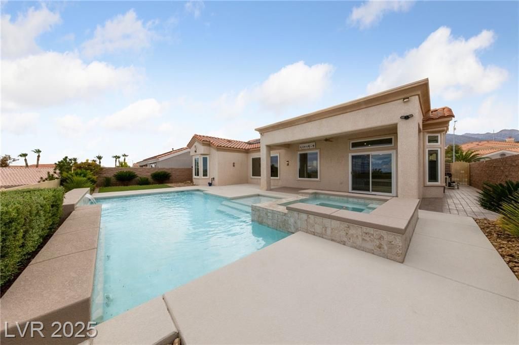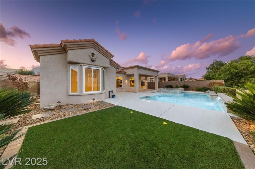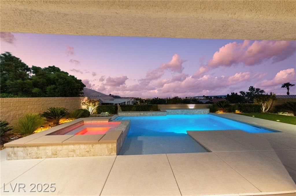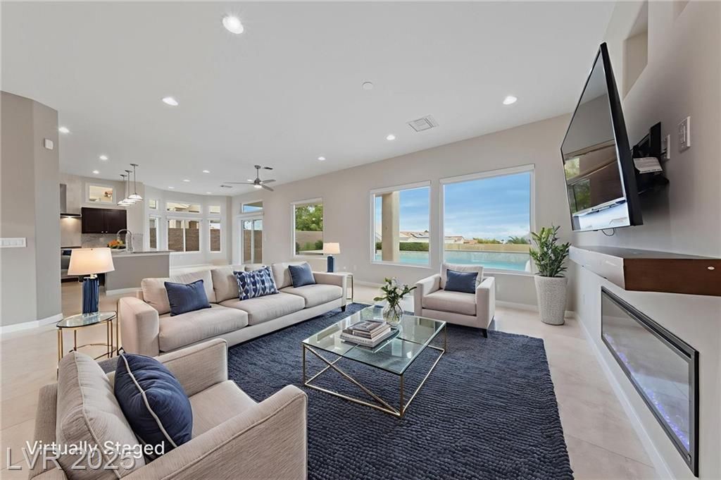 VALLEY & STRIP VIEW ~ PRICED TO SELL ~ Live Like You Are On Vacation! 2 Bedroom, 2 Bath, 1,713 sq. ft. Home. Completely Remodeled & Redesigned, this Residence blends Luxury and Functionality. Enjoy the Solar Heated Built-In Pool & Spa with a Waterfall, Cool Deck, Pentair Pool Equipment, and a Beautifully Landscaped Backyard with Upgraded Irrigation, Artificial Turf, and Exterior LED Lighting. Inside, New Milgaurd Lifetime Warranty Windows, Polished Travertine Tile Floors Flow Throughout. The Chef’s Kitchen boasts a Farmhouse Sink, Ice-Sprinkled Granite Countertops and Backsplash, Soft-Close Maple Cabinets with Full Pullouts, a Superior Liebherr Refrigerator, a Miele Futura Dishwasher, a Bertazzoni Stove and Hood, a GE Monogram Microwave, an RO Water System, Under/Over Cabinet Lighting, and Dimmable Recessed LED Ceiling Lights. The Spa Inspired Primary Bathroom features a Custom Travertine Shower, Double Kohler Sinks, & Granite Countertops. ENJOY OUR SUN CITY LIFESTYLE & AMENITIES.