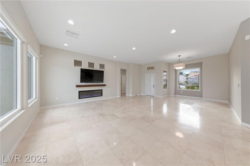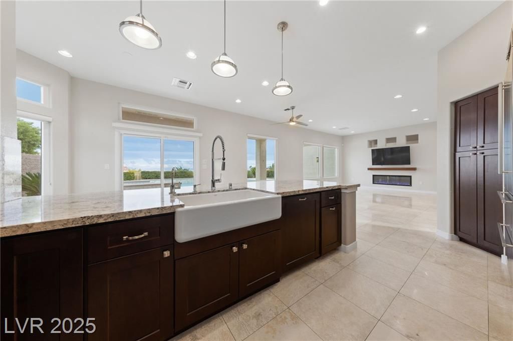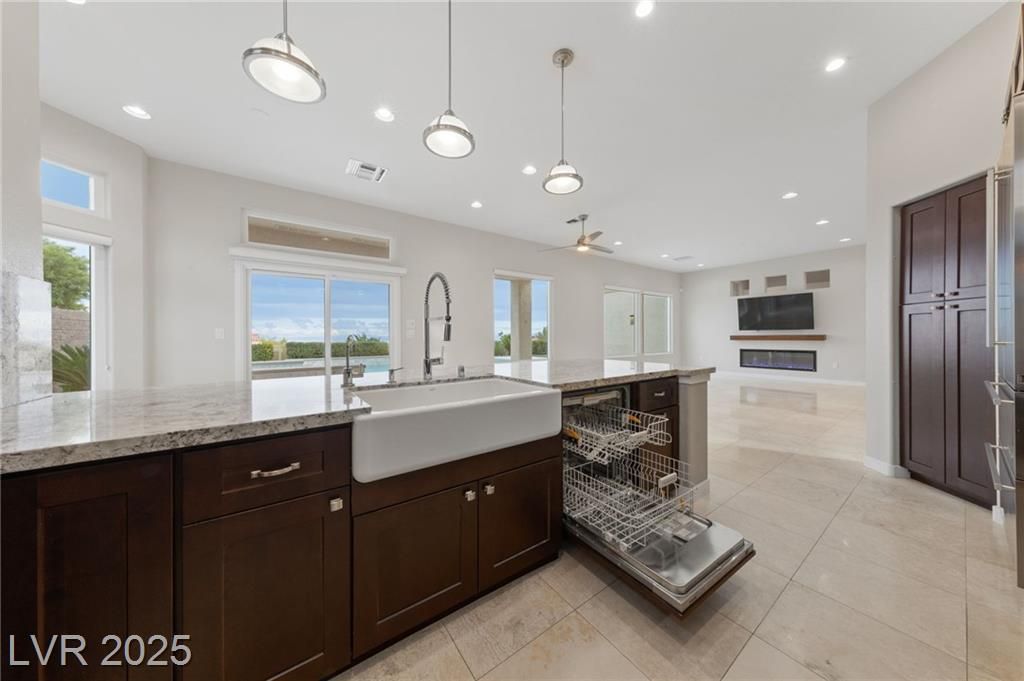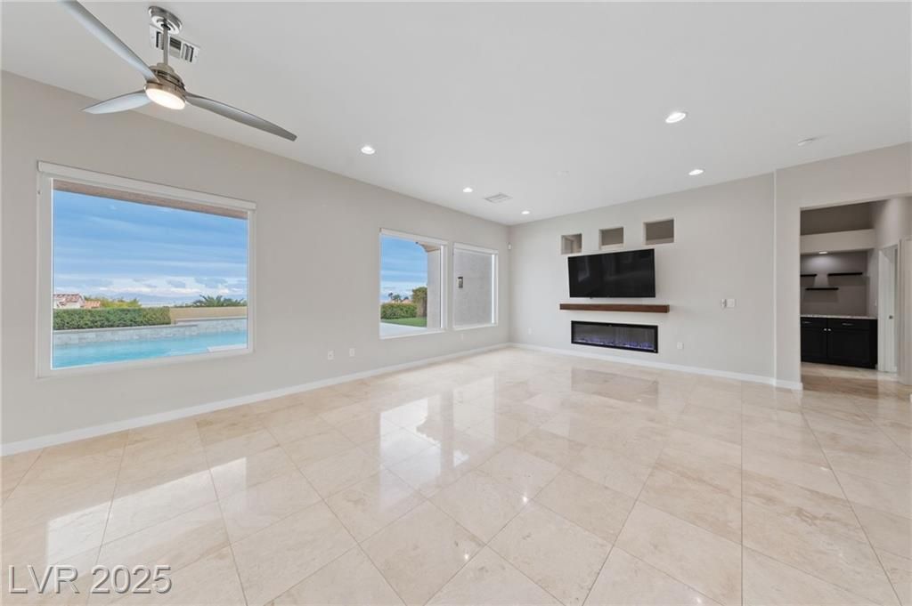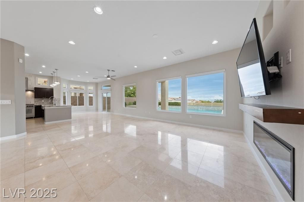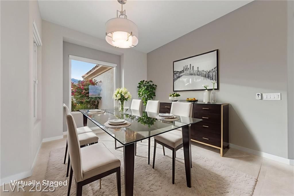 VALLEY & STRIP VIEW ~ PRICED TO SELL ~ Live Like You Are On Vacation! 2 Bedroom, 2 Bath, 1,713 sq. ft. Home. Completely Remodeled & Redesigned, this Residence blends Luxury and Functionality. Enjoy the Solar Heated Built-In Pool & Spa with a Waterfall, Cool Deck, Pentair Pool Equipment, and a Beautifully Landscaped Backyard with Upgraded Irrigation, Artificial Turf, and Exterior LED Lighting. Inside, New Milgaurd Lifetime Warranty Windows, Polished Travertine Tile Floors Flow Throughout. The Chef’s Kitchen boasts a Farmhouse Sink, Ice-Sprinkled Granite Countertops and Backsplash, Soft-Close Maple Cabinets with Full Pullouts, a Superior Liebherr Refrigerator, a Miele Futura Dishwasher, a Bertazzoni Stove and Hood, a GE Monogram Microwave, an RO Water System, Under/Over Cabinet Lighting, and Dimmable Recessed LED Ceiling Lights. The Spa Inspired Primary Bathroom features a Custom Travertine Shower, Double Kohler Sinks, & Granite Countertops. ENJOY OUR SUN CITY LIFESTYLE & AMENITIES.