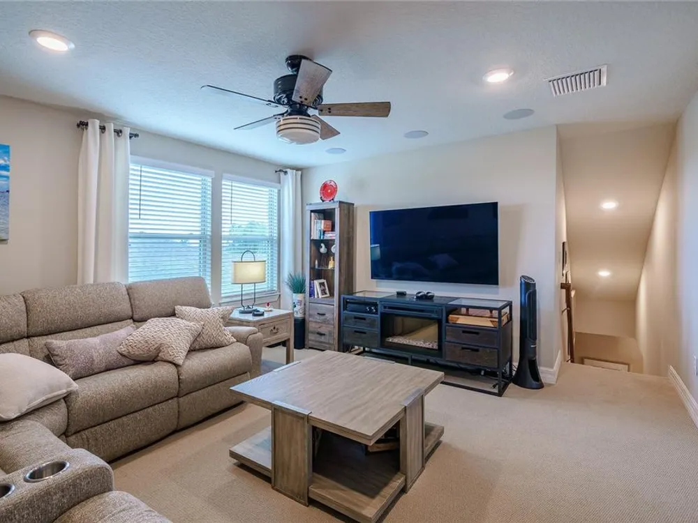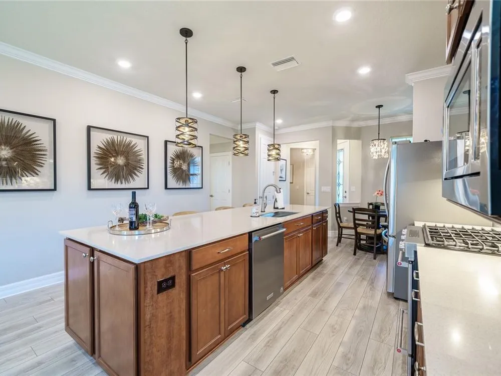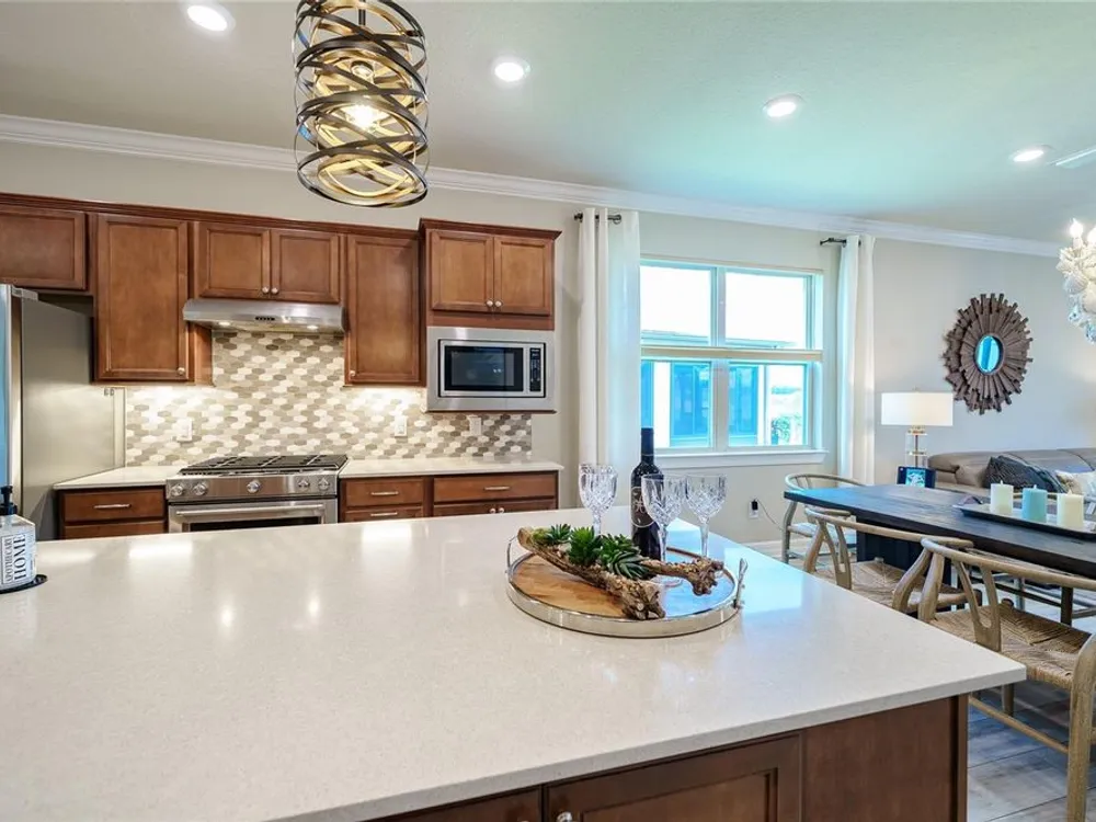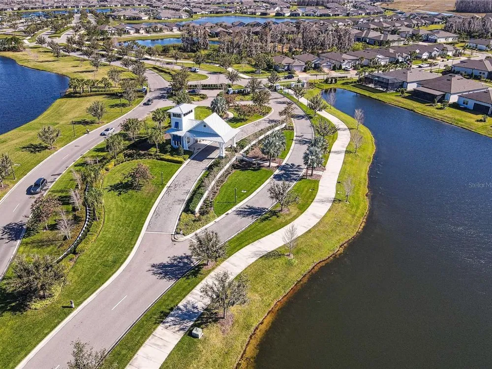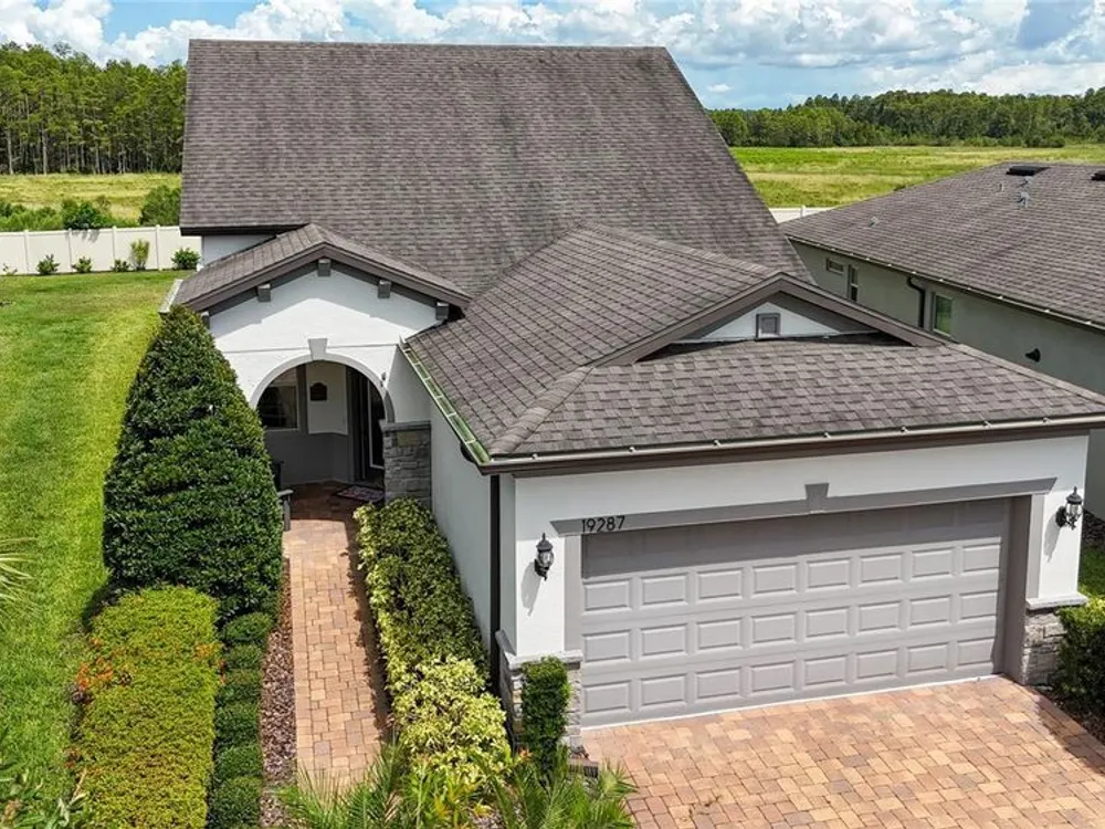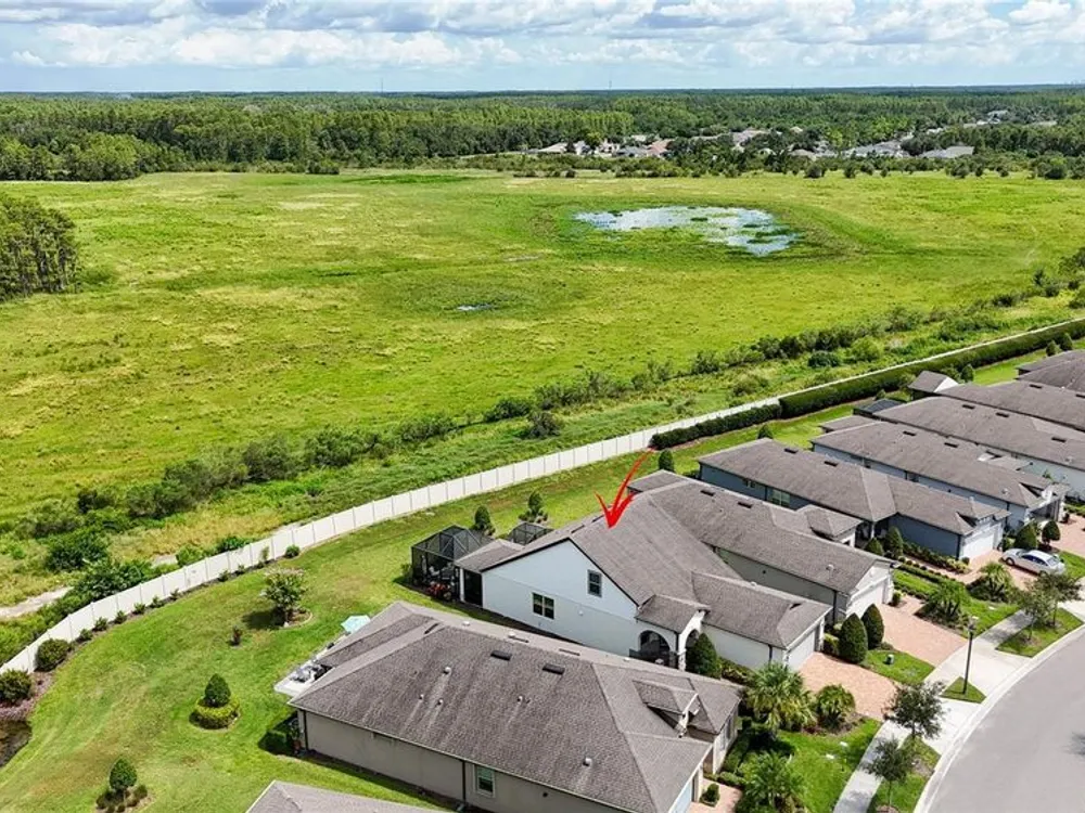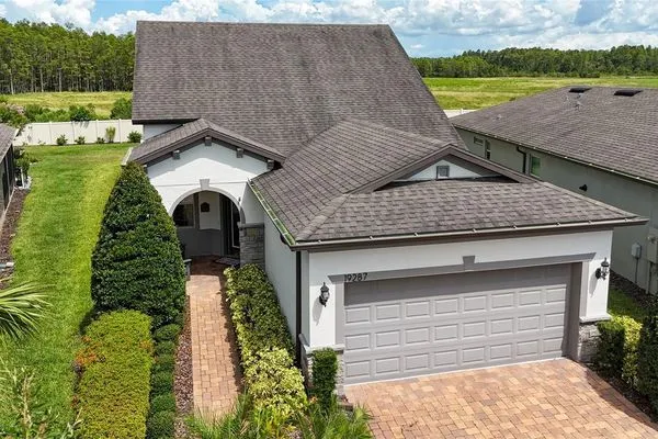 Welcome to this stunning Steel Creek Grand model, perfectly situated in the sought-after gated active over 55 community of Del Webb Bexley in Land O’ Lakes—just minutes from major roads, top shopping and dining, excellent medical facilities, and less than 30 minutes from both Downtown Tampa and Tampa International Airport. From the moment you arrive, the great curb appeal is undeniable, with a brick paver driveway, stone-accented entryway, covered front porch, retractable screen door, and decorative glass inlay front door creating a warm and inviting welcome. Inside, you’ll be greeted by soothing earth tones, wood accent walls, and unique designer light fixtures throughout, with crown molding in every room adding elegance. Luxury vinyl flooring flows through the main living areas, complemented by a staircase with decorative wrought-iron spindles that’s tucked away to preserve the home’s open flow. The heart of the home is the spacious, well-appointed kitchen, featuring a massive quartz island, stainless steel appliances, pull-out shelving, and a custom pantry. Enjoy meals in the sunlit breakfast nook, then transition to the Florida room (not included in square footage) that leads to two screened lanais—one enhanced with perimeter outdoor lighting—perfect for evening gatherings. This well-designed two-story layout features 3 bedrooms, 3 full baths, and a loft. The upstairs offers a private retreat with a bedroom, full bath, and loft—ideal for a guest suite, a grandkids’ playroom, or a home office—complete with built-in surround sound speakers. The primary suite boasts a spa-like ensuite bath with dual sinks, quartz counters, a shower with glass doors, and an exceptional custom-built closet. All closets in the home feature custom built-ins, and the laundry room offers cabinet storage plus an included washer and dryer. The 2-car garage comes with extra storage cabinets that will remain for the new owners. The pie-shaped, oversized backyard provides complete privacy and a peaceful pond view to the left—an ideal spot for morning coffee or quiet relaxation. And with lawn care included, you’ll have more time to enjoy the things you love. If you enjoy staying Active INCREDIBLE AMENITIES include a Resort-Style Pool with lap lanes, Resistance Pool, Hot Tub, and Cabanas, Expansive 19,000 sq. ft. clubhouse, Multipurpose Room and Arts and Crafts Room, Beer and Wine Bar, Cafe/Bistro/, Outdoor Fireplace, Lounge, 2 Tennis Courts, 6 Pickle ball Courts, 4 Bocce Ball Courts, Fitness Center, Movement Studio, Community Garden, Dog Park, and many Resident Clubs and Interest Groups! Whether you're looking for a full-time residence or a second home to escape the cold and snowy days up North, impeccably cared for, this home has it all! Don’t let this one slip away!