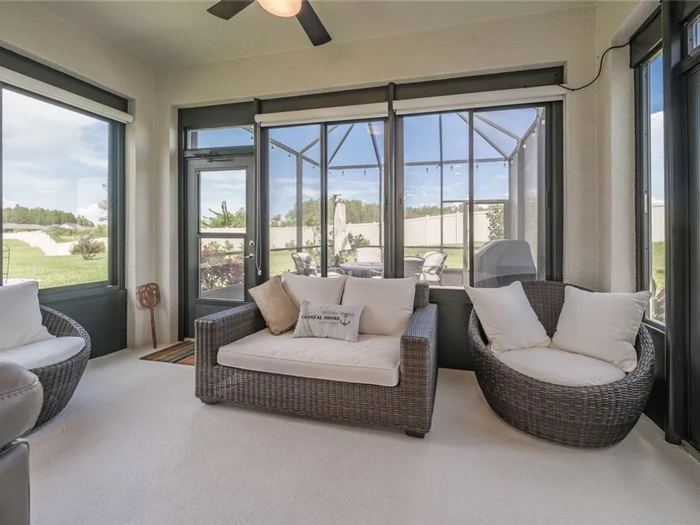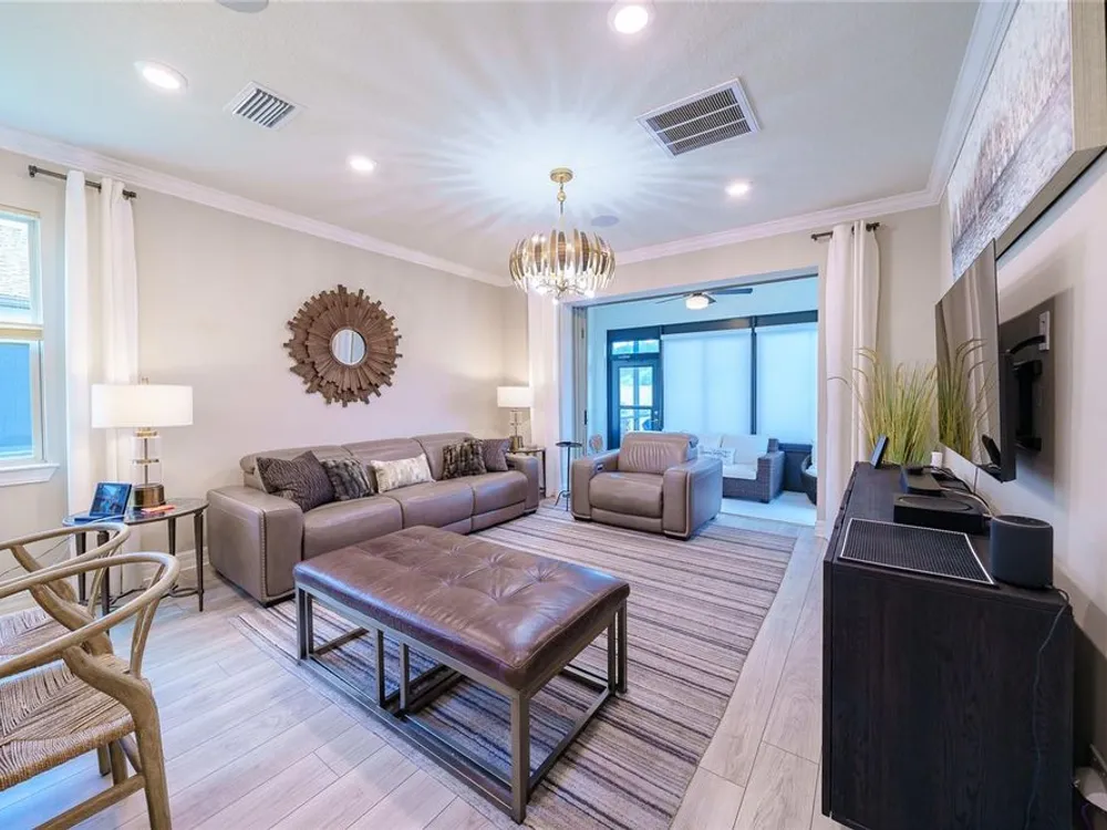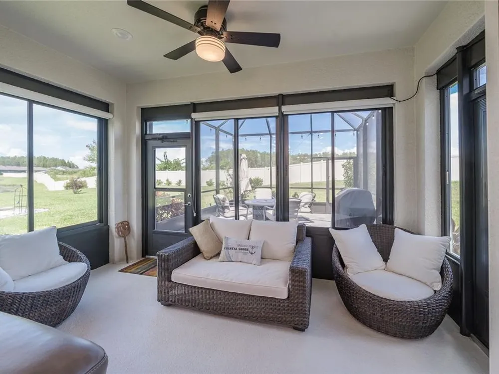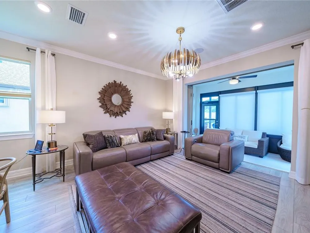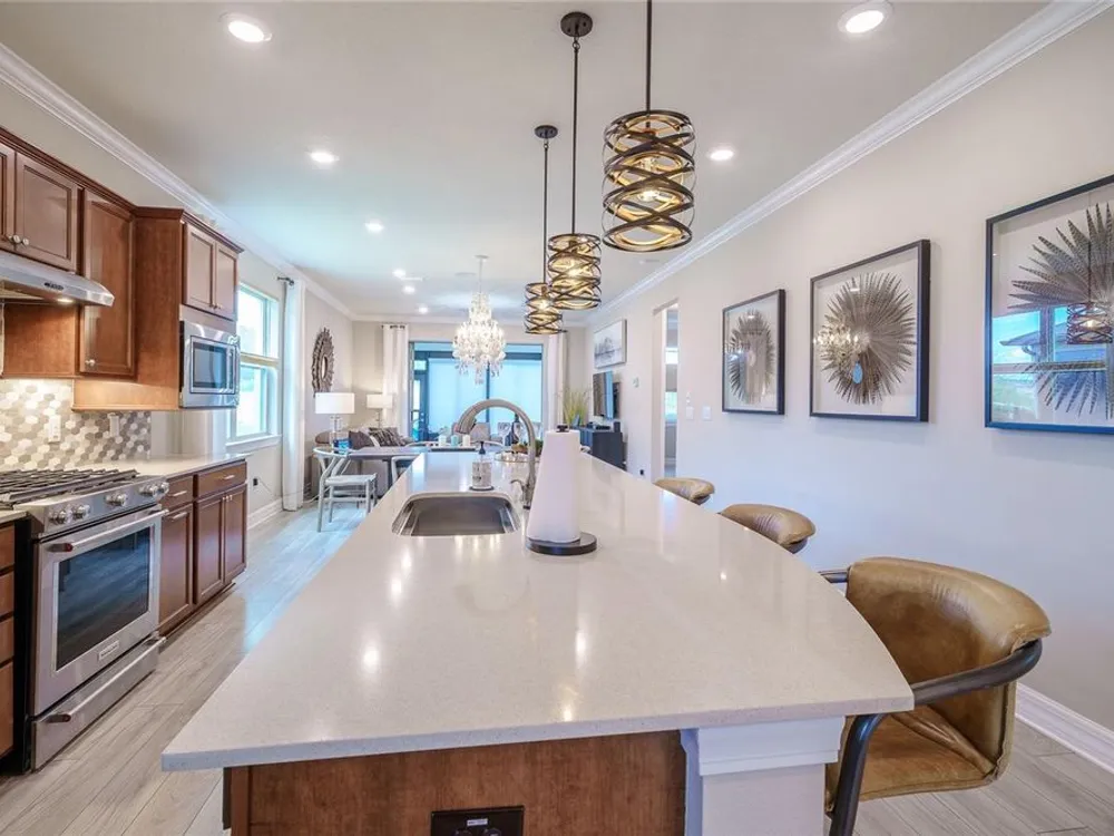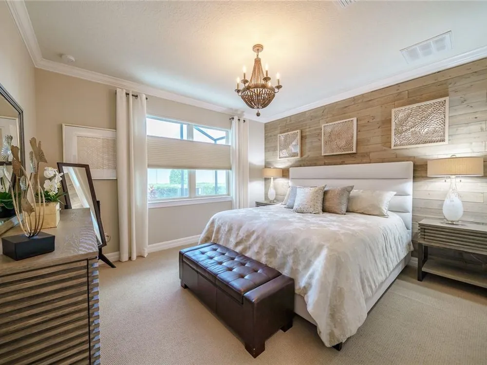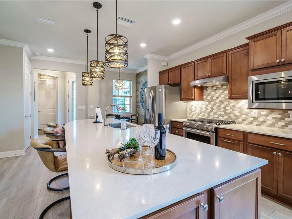 Welcome to this stunning Steel Creek Grand model, perfectly situated in the sought-after gated active over 55 community of Del Webb Bexley in Land O’ Lakes—just minutes from major roads, top shopping and dining, excellent medical facilities, and less than 30 minutes from both Downtown Tampa and Tampa International Airport. From the moment you arrive, the great curb appeal is undeniable, with a brick paver driveway, stone-accented entryway, covered front porch, retractable screen door, and decorative glass inlay front door creating a warm and inviting welcome. Inside, you’ll be greeted by soothing earth tones, wood accent walls, and unique designer light fixtures throughout, with crown molding in every room adding elegance. Luxury vinyl flooring flows through the main living areas, complemented by a staircase with decorative wrought-iron spindles that’s tucked away to preserve the home’s open flow. The heart of the home is the spacious, well-appointed kitchen, featuring a massive quartz island, stainless steel appliances, pull-out shelving, and a custom pantry. Enjoy meals in the sunlit breakfast nook, then transition to the Florida room (not included in square footage) that leads to two screened lanais—one enhanced with perimeter outdoor lighting—perfect for evening gatherings. This well-designed two-story layout features 3 bedrooms, 3 full baths, and a loft. The upstairs offers a private retreat with a bedroom, full bath, and loft—ideal for a guest suite, a grandkids’ playroom, or a home office—complete with built-in surround sound speakers. The primary suite boasts a spa-like ensuite bath with dual sinks, quartz counters, a shower with glass doors, and an exceptional custom-built closet. All closets in the home feature custom built-ins, and the laundry room offers cabinet storage plus an included washer and dryer. The 2-car garage comes with extra storage cabinets that will remain for the new owners. The pie-shaped, oversized backyard provides complete privacy and a peaceful pond view to the left—an ideal spot for morning coffee or quiet relaxation. And with lawn care included, you’ll have more time to enjoy the things you love. If you enjoy staying Active INCREDIBLE AMENITIES include a Resort-Style Pool with lap lanes, Resistance Pool, Hot Tub, and Cabanas, Expansive 19,000 sq. ft. clubhouse, Multipurpose Room and Arts and Crafts Room, Beer and Wine Bar, Cafe/Bistro/, Outdoor Fireplace, Lounge, 2 Tennis Courts, 6 Pickle ball Courts, 4 Bocce Ball Courts, Fitness Center, Movement Studio, Community Garden, Dog Park, and many Resident Clubs and Interest Groups! Whether you're looking for a full-time residence or a second home to escape the cold and snowy days up North, impeccably cared for, this home has it all! Don’t let this one slip away!