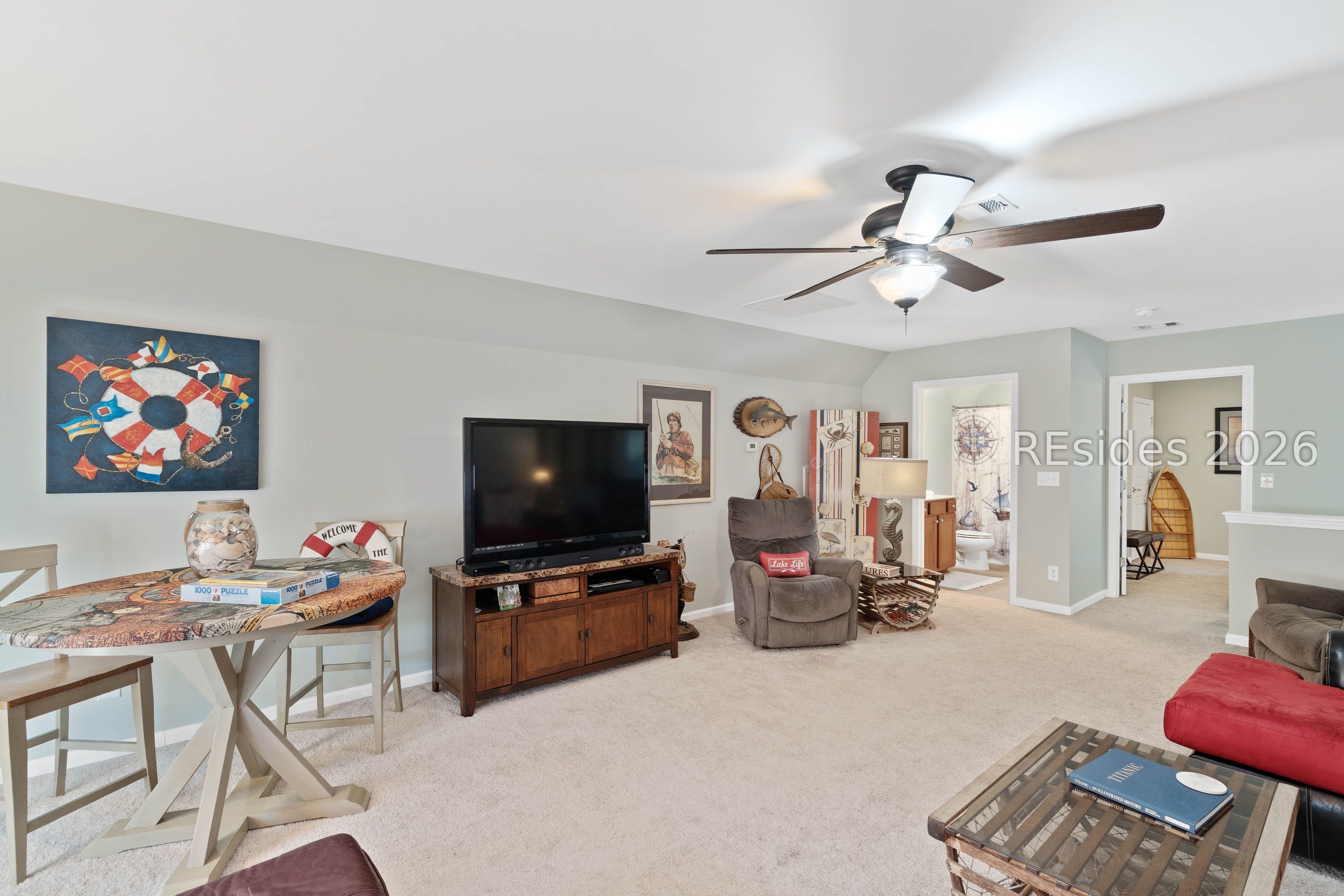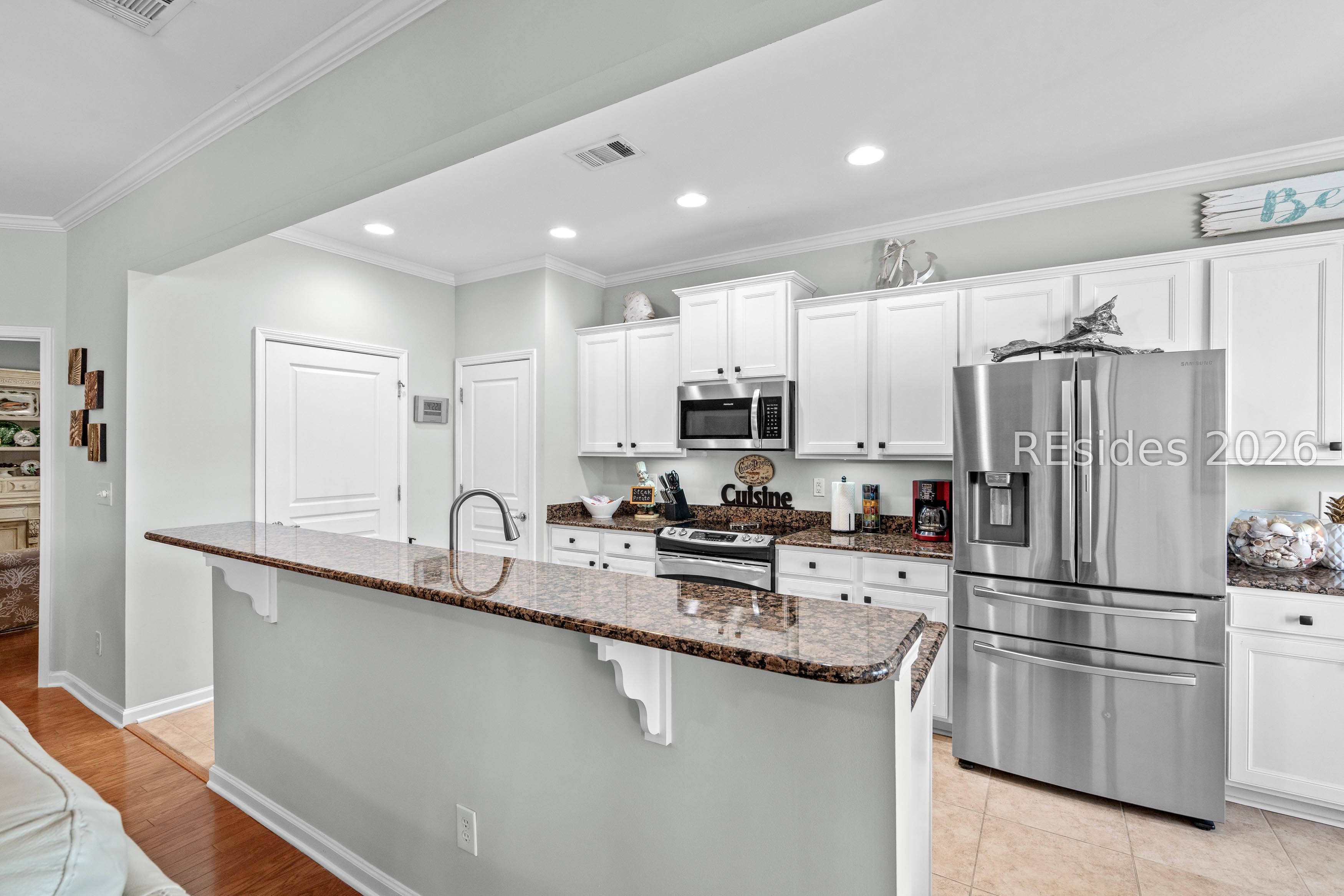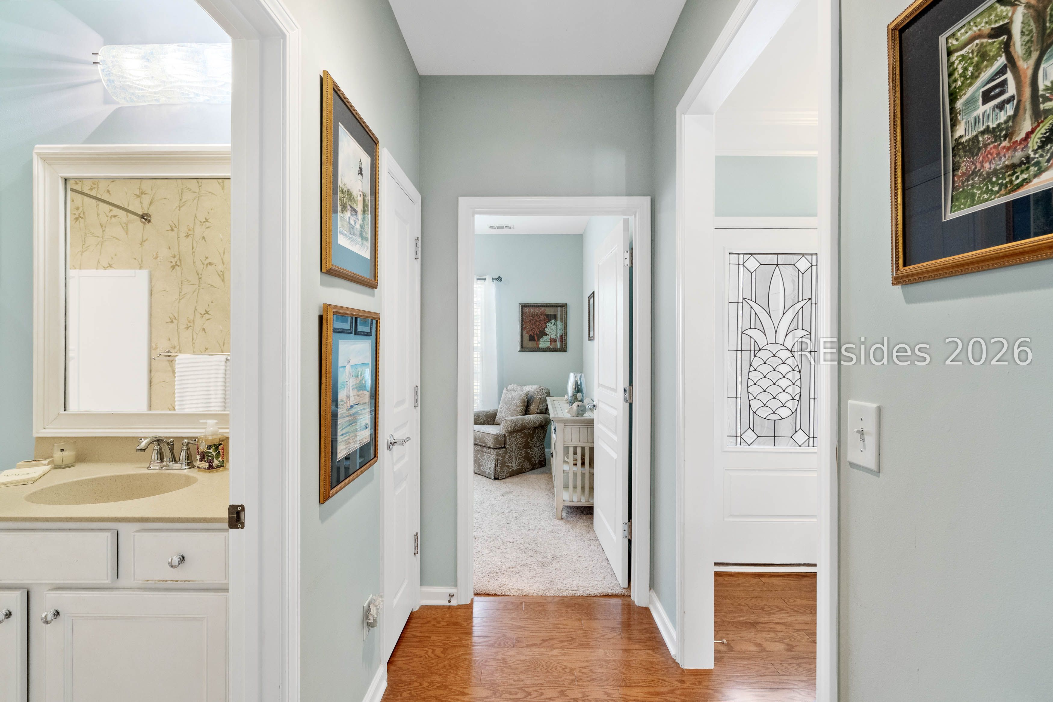 Need space? This stunning Vernon Hill model with loft offers 3,277 sq ft of beautifully updated living space, featuring 4 bedrooms plus a private office/den. A welcoming brick paver path leads to the foyer, where hardwood floors and fresh paint flow throughout. The split floor plan includes two guest bedrooms and a full bath at the front, a spacious great room with formal dining, and an office with French doors. The kitchen shines with granite countertops, stainless steel appliances, pantry, and cozy breakfast nook. A bright Carolina room opens to a paver patio with serene golf and lagoon views. The generous primary suite features a walk-in closet and en-suite bath with double vanity and large shower. Upstairs, enjoy a loft with expansive living area, 4th bedroom, and full bath-perfect for guests. Newer HVAC, 2-car garage, and prime location near the clubhouse, golf, and tidewater gate complete this move-in ready home in amenity-rich Sun City.