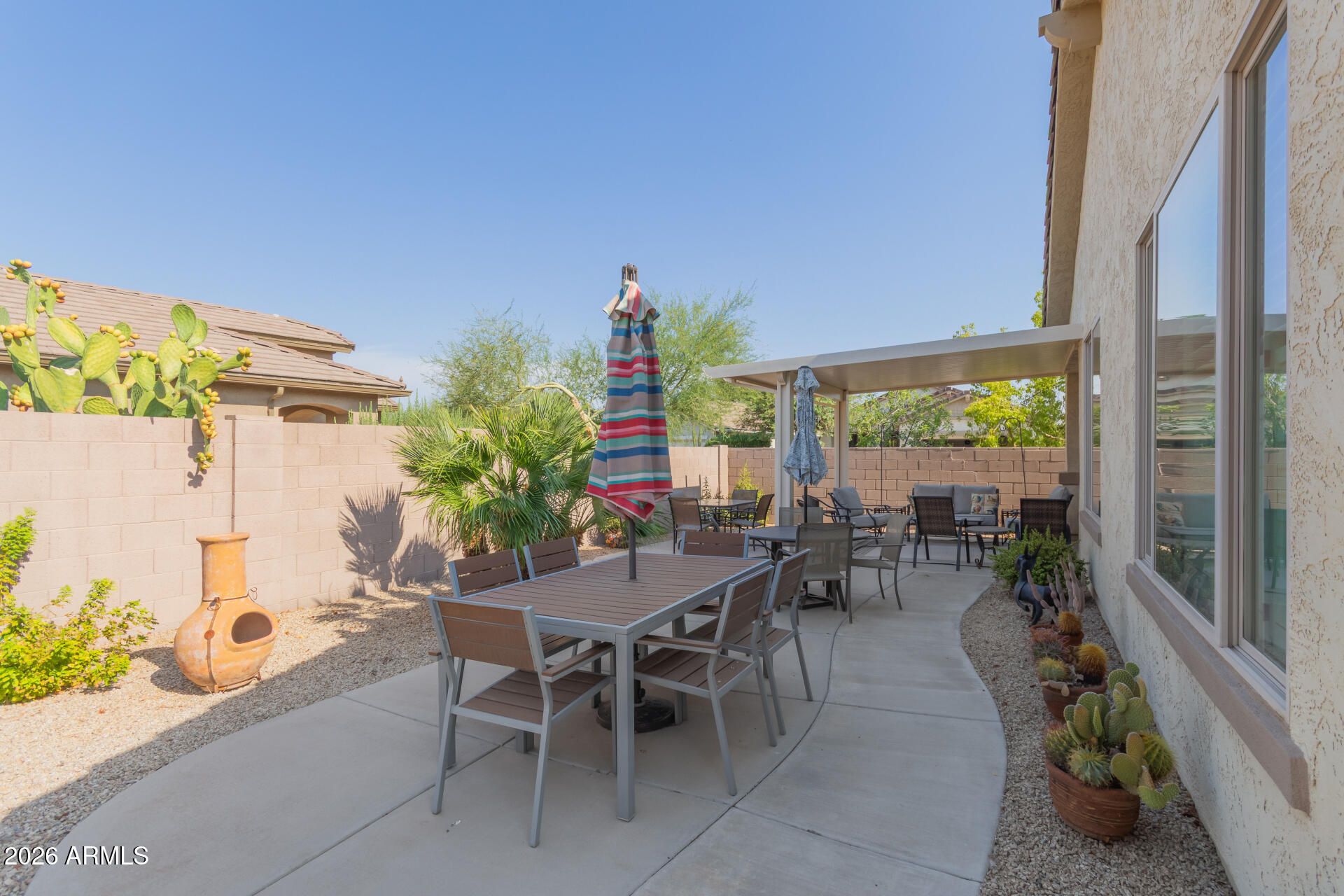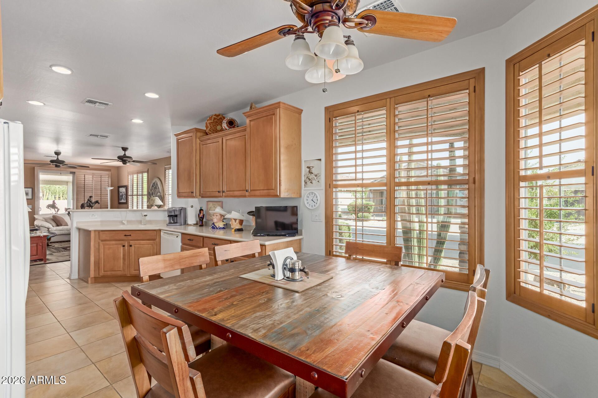 Discover your perfect retirement escape in this 2-bed, 2-bath + den gem located on a desirable corner lot in the 55+ gated community of Solera at Johnson Ranch. This home features an extended garage—ideal for added storage or larger vehicles—shutters throughout and an east-facing backyard, offering cooler afternoon shade, perfect for relaxing on warm Arizona days. The light-filled kitchen includes Corian countertops and a charming breakfast nook with views of the front courtyard. The spacious primary suite features a walk-in closet, dual sinks, and a separate tub and shower. Residents of Solera enjoy resort-style amenities like a private clubhouse, heated pools & spas, tennis & pickleball courts, golf, and more! Well cared for and waiting for you to make it your home!