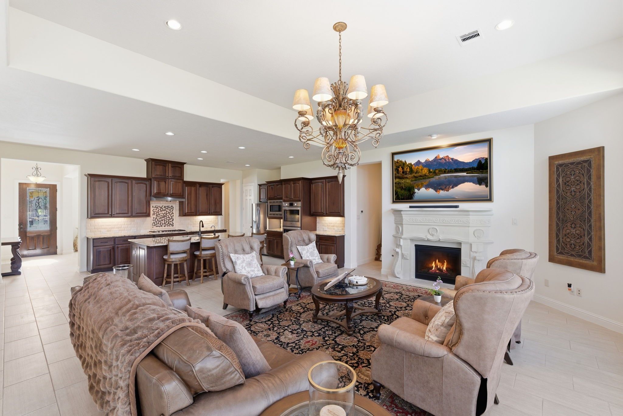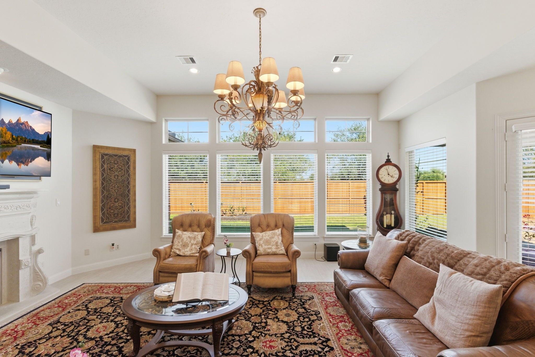 Stunning 1.5-story sanctuary, 2788 + 315.12 sq. ft., located in Heritage at Towne Lake, a vibrant 55+ community offering pickleball, swimming, boating, fitness classes, poker nights, and more. This home delivers more than comfort—it offers a lifestyle to enjoy! Inside, enjoy beautifully renovated bathrooms, an elegant designer cast stone fireplace, and tile flooring throughout—no carpet! The gourmet chef’s kitchen boasts stainless steel appliances, a massive island, abundant granite countertops, and a spacious walk-in pantry. The serene primary suite features dual sinks, a vanity space, soaking tub, oversized walk-in shower, and dual closets with direct access to the utility room. Upstairs, a fully finished two-room flex area (w/ garage entry) provides endless possibilities for guests, hobbies, or a secluded office. Outside, relax on the expansive covered patio with a firepit, Electronic Auto Shades enclosing full back porch, and lush landscaping—ideal for entertaining or unwinding.