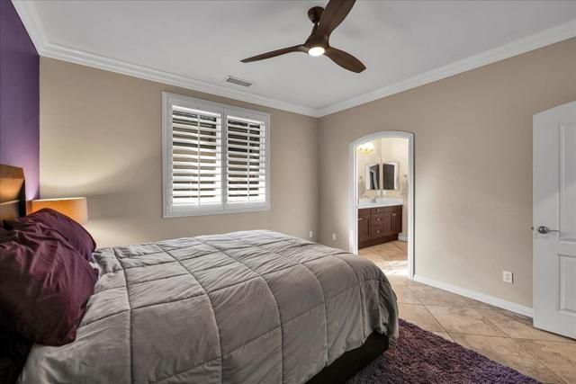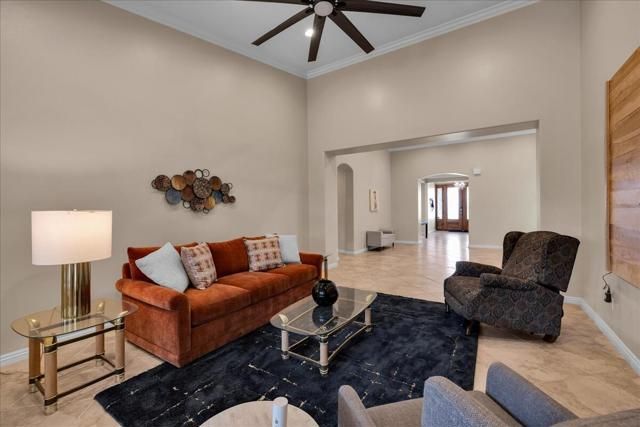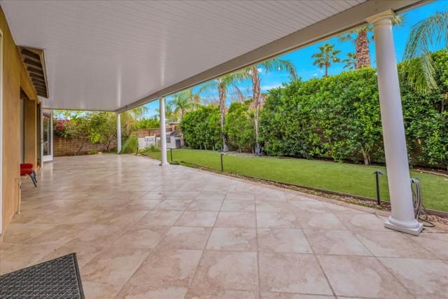 Palm Springs living with Owned Solar! This impressive 2,825 sq ft residence welcomes you through beveled-glass double doors into a formal living and dining room with soaring vaulted ceilings. Oversized diagonal tile flooring flows throughout the home and out to the inviting patios. Located in the gated Four Seasons 55+ community, residents enjoy endless social activities centered around the stunning 14,000 sq ft clubhouse.The gourmet kitchen features abundant storage, a center island, breakfast nook, and bar seating, complemented by granite countertops, stainless steel appliances, and custom cabinetry. The adjoining family room with a stacked-stone gas fireplace creates a warm gathering space with countertop seating. The primary suite is a private retreat offering a gas fireplace, south-facing patios, two large walk-in closets, dual vanities, a granite walk-in shower, and a soaking tub. A second en-suite bedroom is situated on the opposite side of the home near the den or optional third bedroom, connected by a Jack-and-Jill bath, plus a separate guest powder room. Dual newer A/C units provide year-round comfort. The serene backyard showcases a large pergola-covered patio, mountain views, built-in BBQ, and low-maintenance artificial turf. 'The Lodge' clubhouse offers a full calendar of activities, fitness studios, ballroom, library, game room, and more. Resort-style amenities include pools, spas, tennis, pickleball, BBQ areas, and scenic walking paths. Low HOA fees include Frontier fiber optic internet. Just minutes from downtown Palm Springs, this home blends luxury, comfort, and community living.