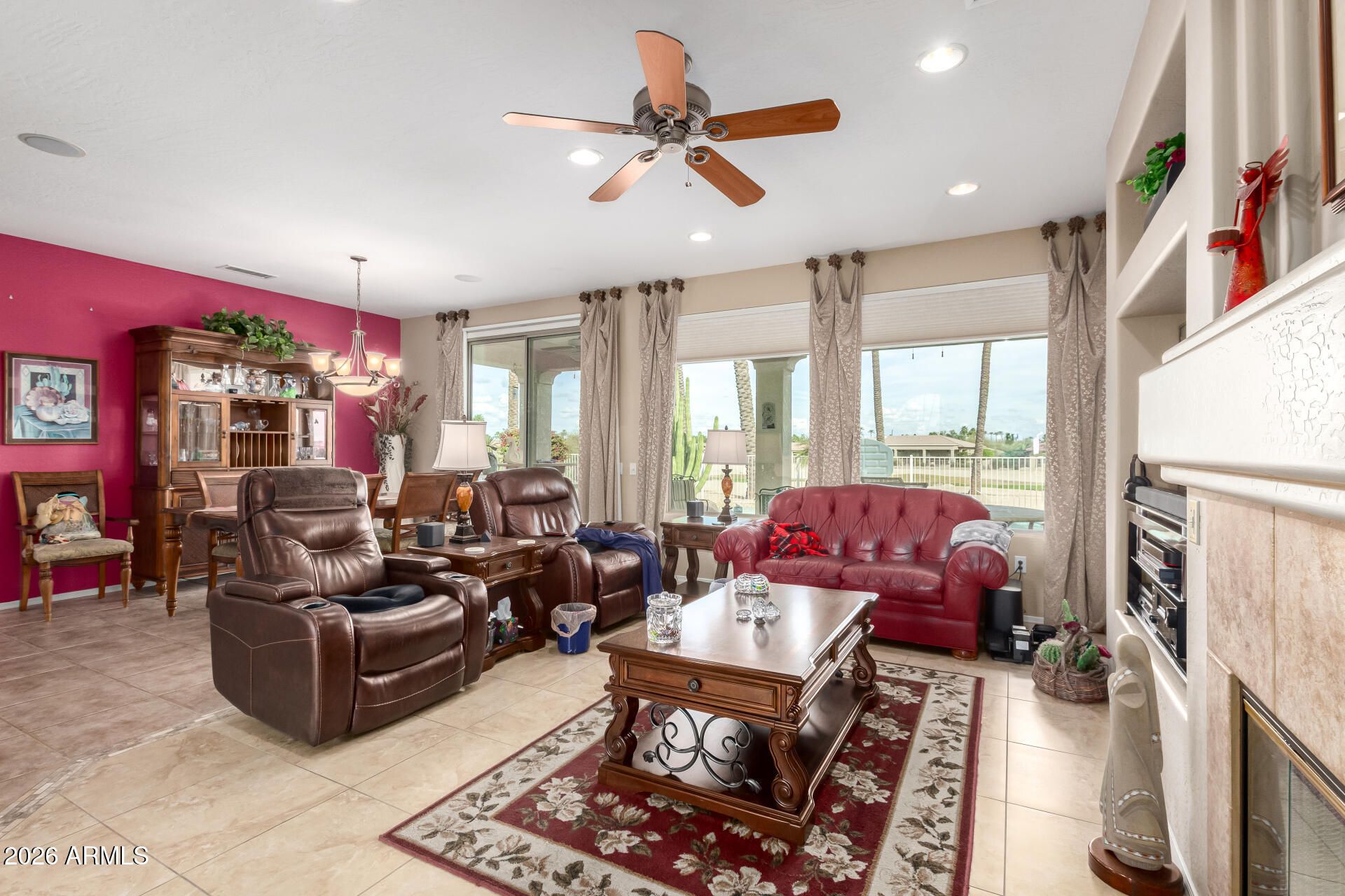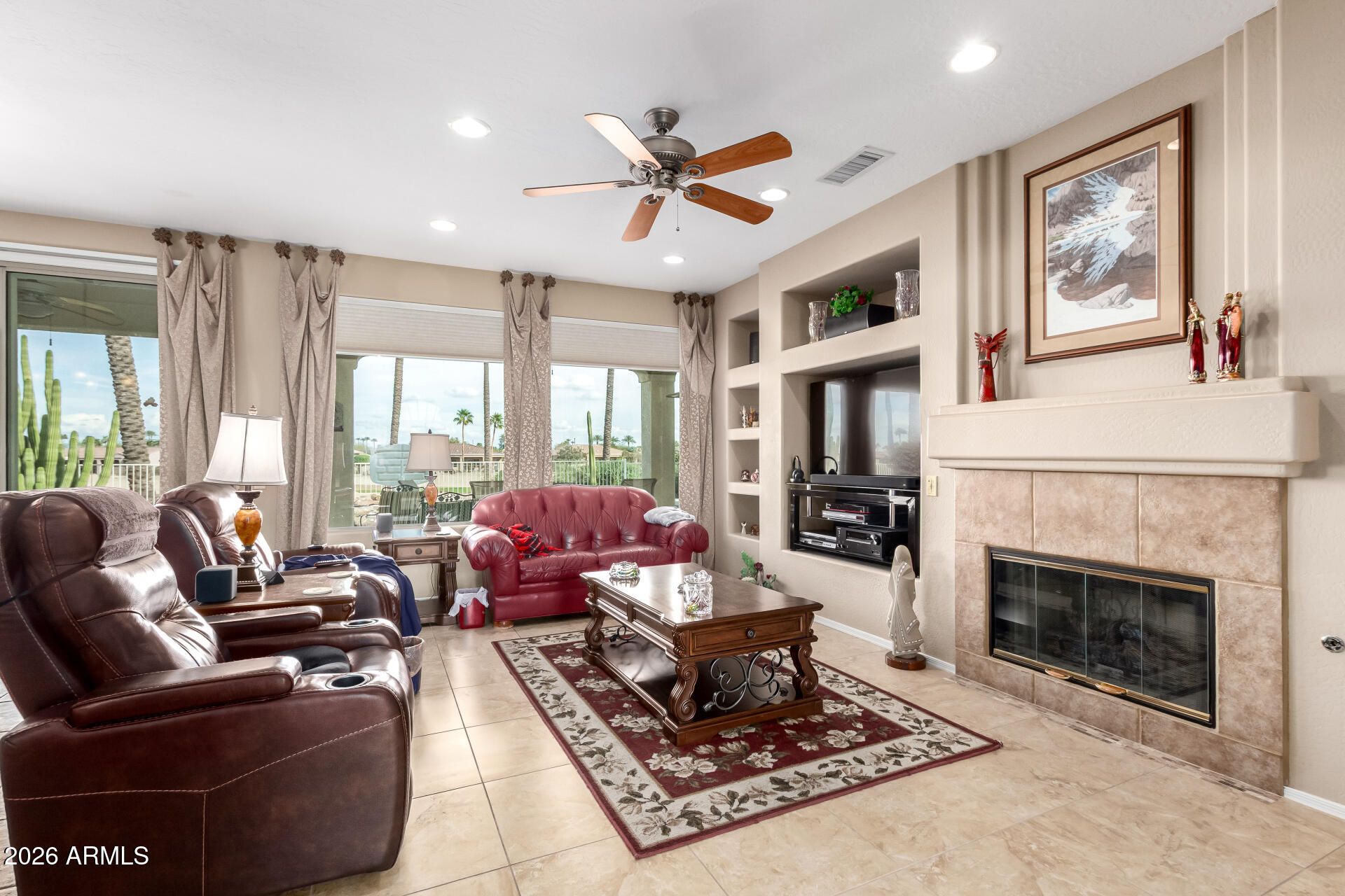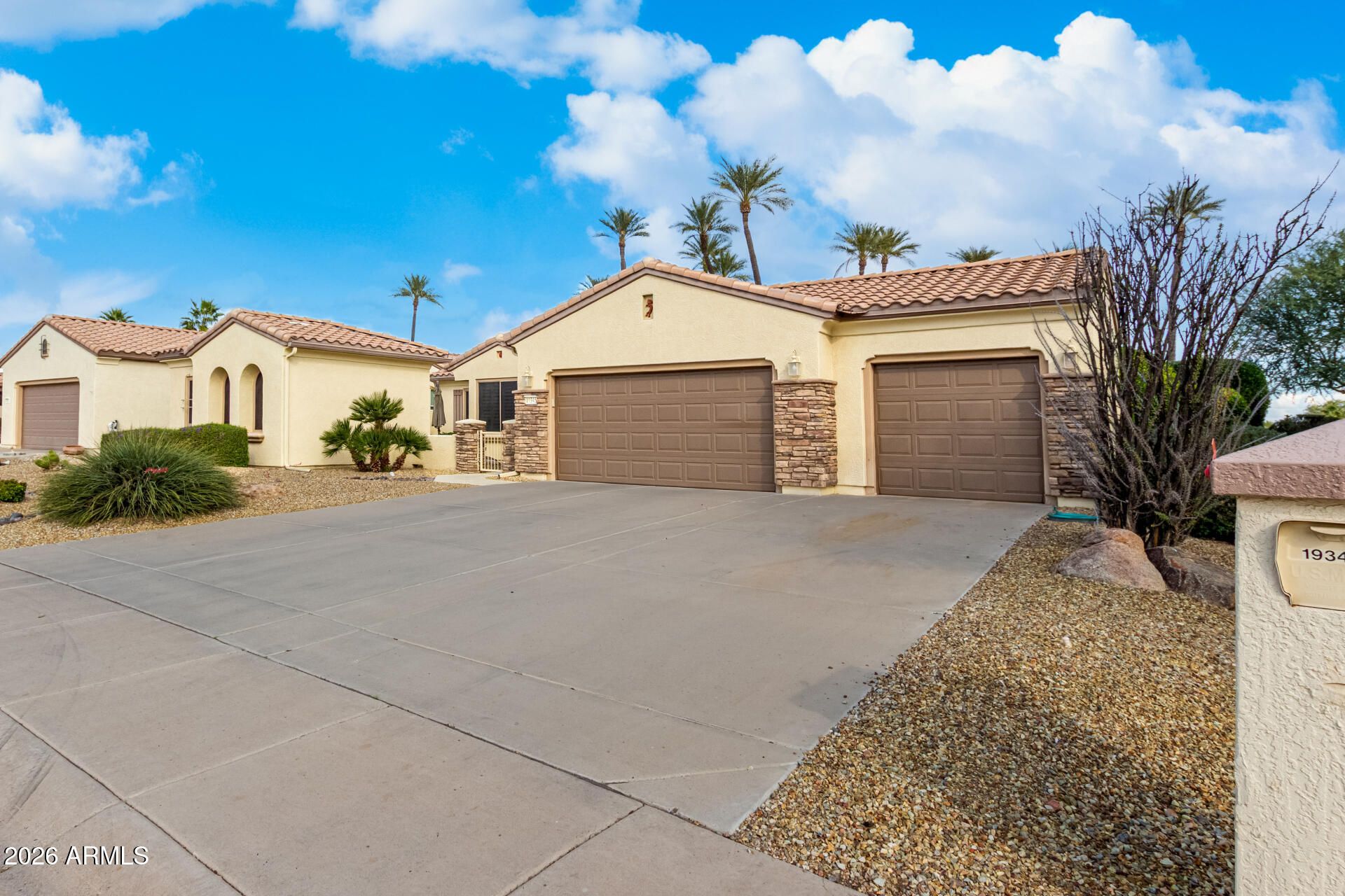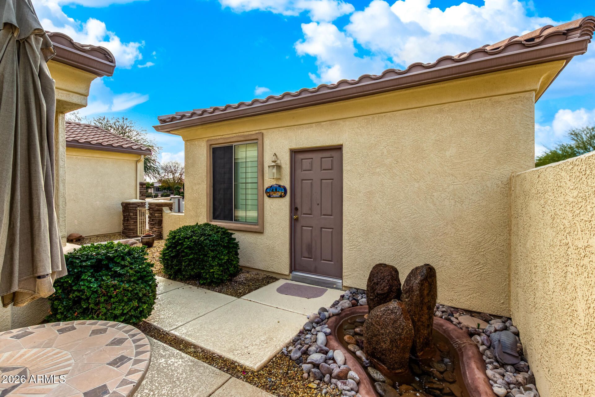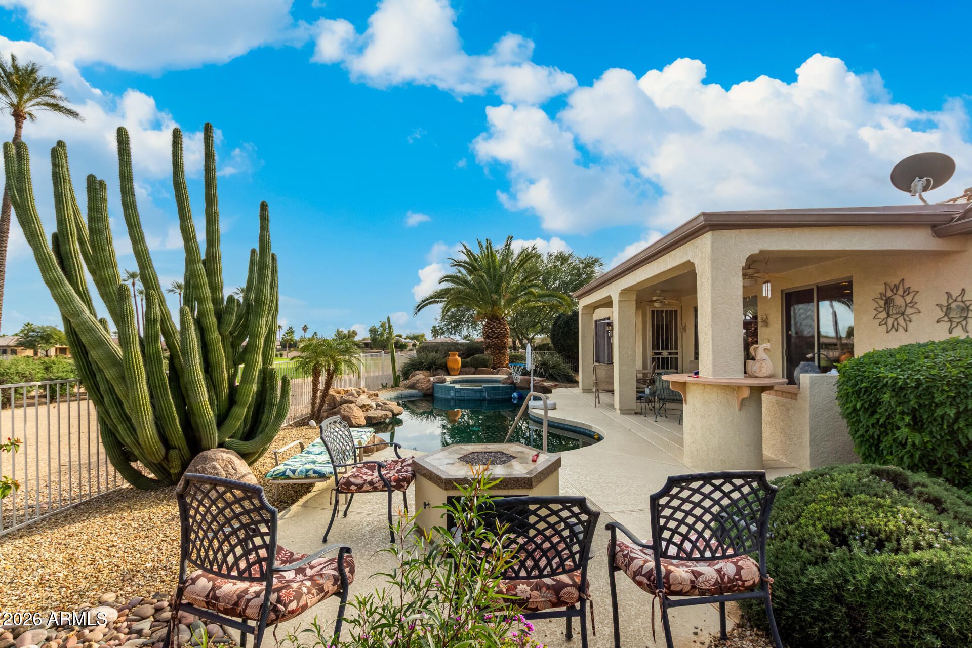 Exceptional golf course living awaits in this beautiful Sun City Grand home. The stone accented façade, charming courtyard, and easy care landscaping create instant curb appeal. Inside, a bright, open layout features a cozy fireplace, media niche, and plantation shutters. The kitchen offers a breakfast bar, maple cabinetry, tile counters and backsplash, built-in appliances, and a sunny breakfast nook. The primary suite includes backyard access, a bay window, and a spa-like bath with dual sinks, soaking tub, walk-in shower, and closet. A DETACHED CASITA adds flexibility with a private bath and living space. The entertainer's backyard shines with a covered patio, built-in BBQ, sparkling pool, spa and view fencing. BRAND NEW ROOF AS OF JANUARY 2026 combining elegance with peace of mind!