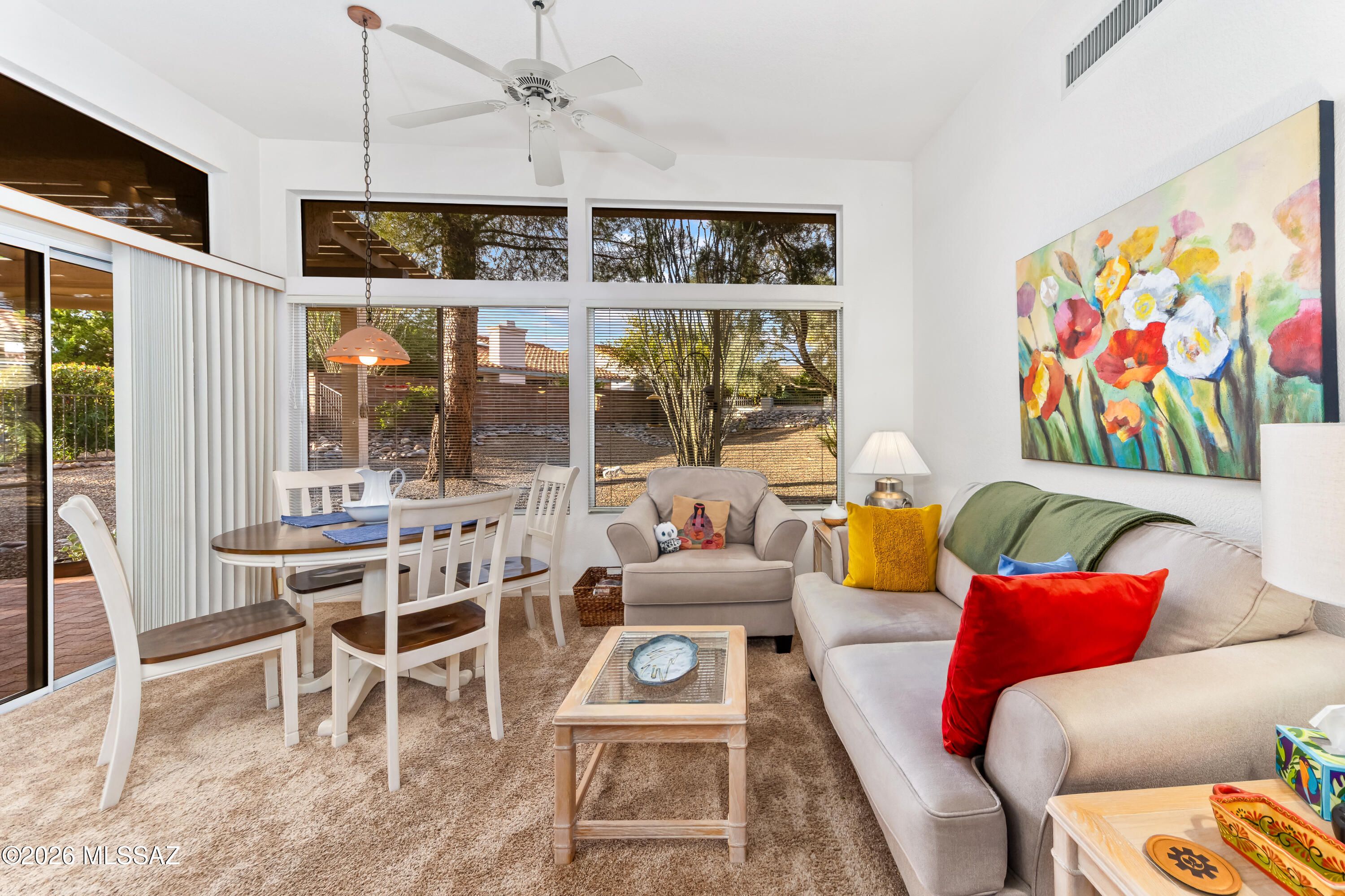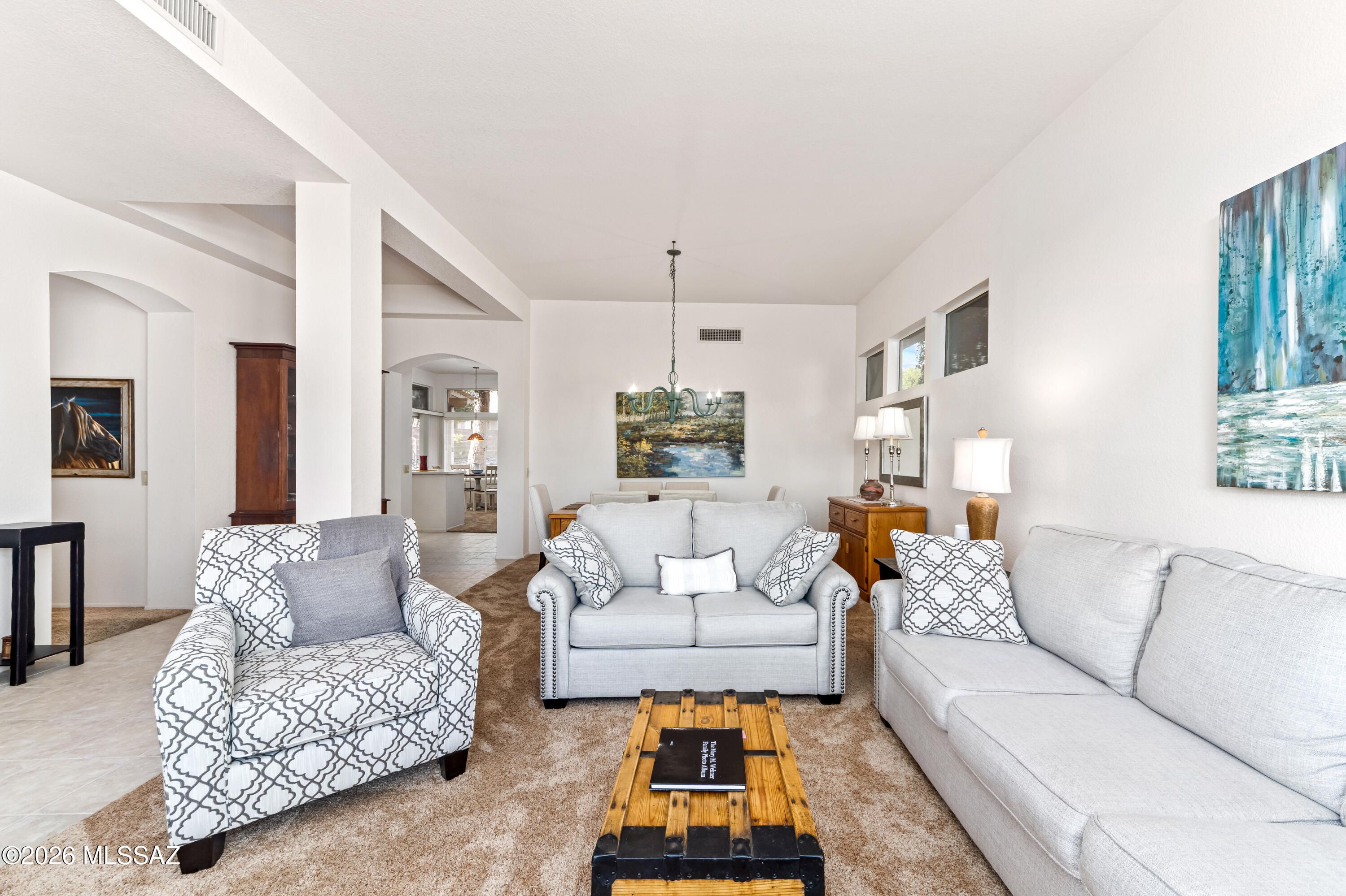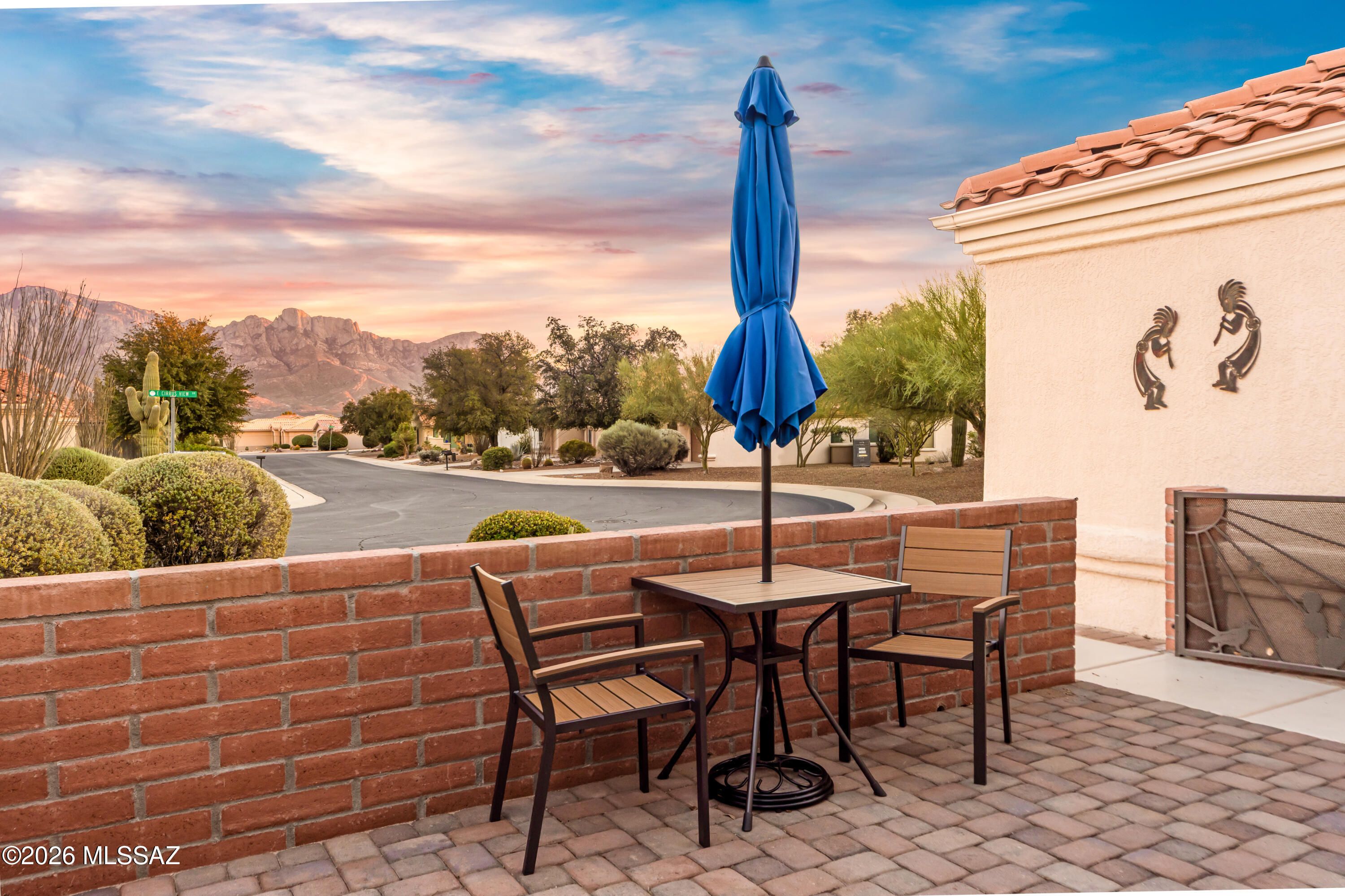 Sun City Oro Valley Home w/ Catalina Mountain Views Selling Furnished! This Lovely 1,499 sq. ft. Santa Cruz Model home features an Enclosed Front Patio w/ Panoramic Catalina Mountain Views! Enter into the Open Living Room / Dining Room facing the Majestic Mountains w/ Breathtaking Views from inside & out! This bright, beautiful 2BR / 2 Full Bath home is selling turn-key. The Owner's Suite features a dual-sink vanity, walk-in shower & slider to the back patio. Bedroom 2 has a murphy bed & built-ins. Pretty eat-in Kitchen w/ island and slider to the back yard. The park-like setting is beautiful w/ a Carge Patio covered by a charming Ramada. The yard is Fenced & Gated. Sun City Amenities include: 18 Hole Golf Course, 2 Pools, Pickleball, Tennis, Fitness Ctr, Art Ctr, Clubs to join & more!