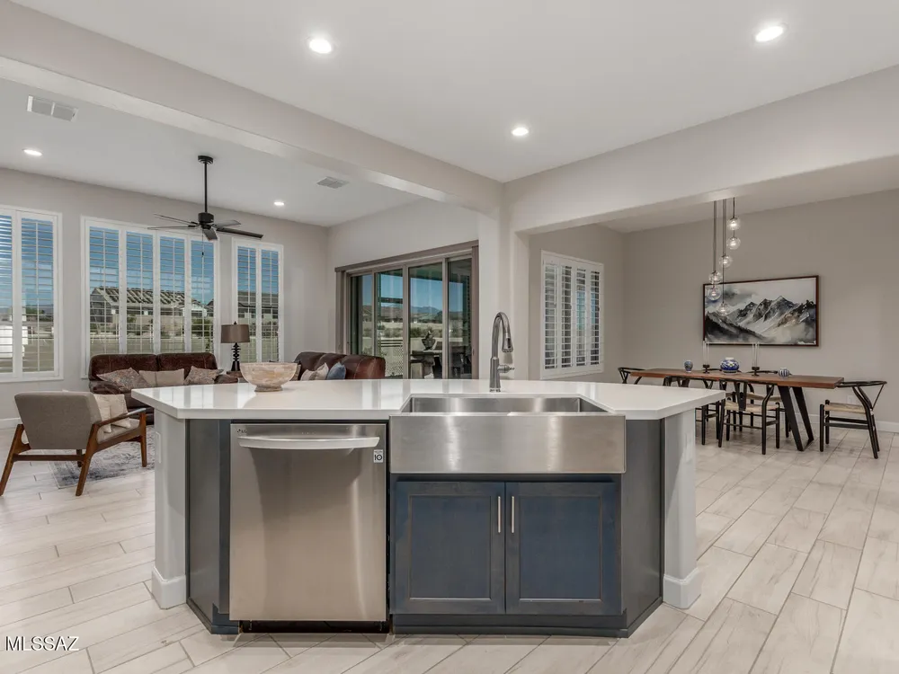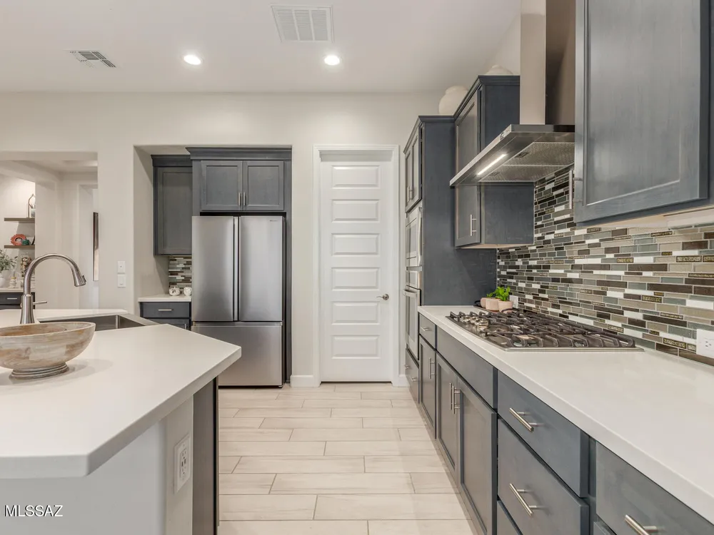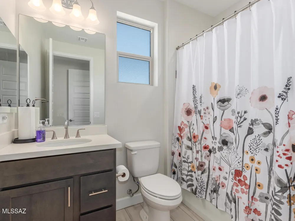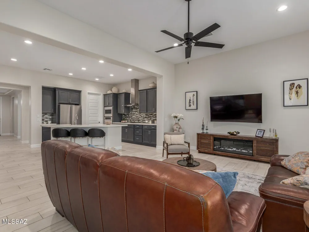 Look no more! Charming single-story residence w/ Stunning Mountain Views! Award winning Fresco Model featuring a desert landscape and desirable SE facing back yard w/sunrise and mountain views. 2 years new and move-in ready. Inside, you'll find a Great Room with 11' ceiling, upgraded kitchen with quartz counters, tile backsplash, large crescent island with Kohler SS farm sink, SS appliances, Owner's suite has large walk-in closet, dual vanities and tile shower. Guest room with bath, powder room and den.. Outdoors: The backyard offers a fountain, artificial turf, large Arizona room & ample space for gatherings! Don't miss this one! Owner/Agent