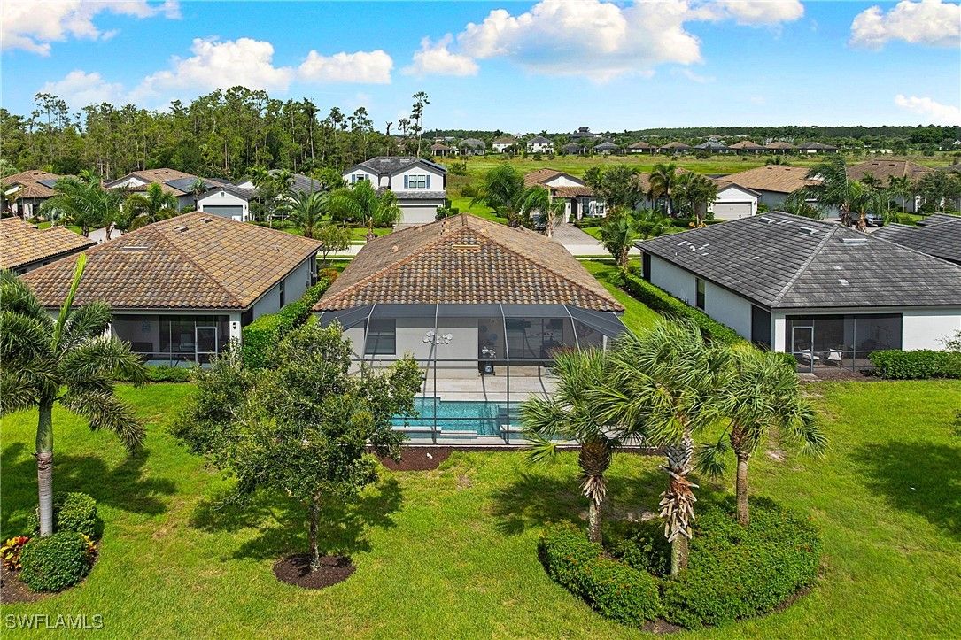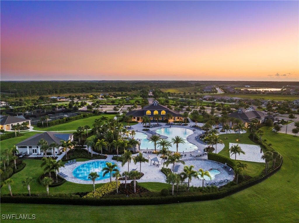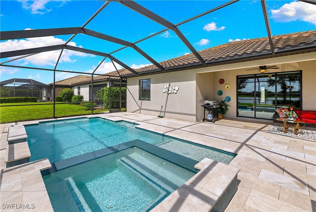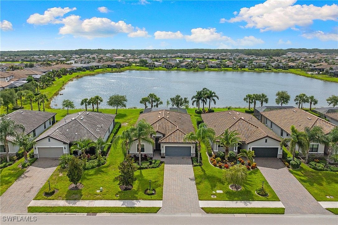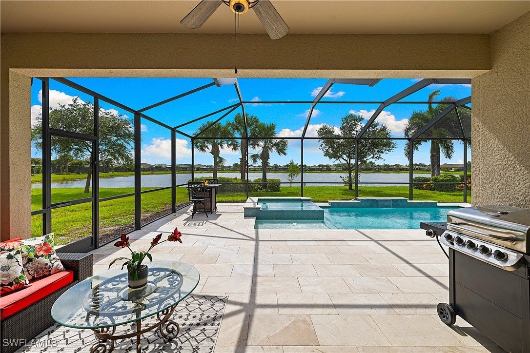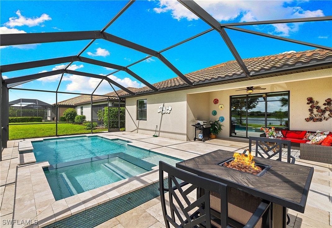 MOVE IN RIGHT AWAY! DESIRABLE LAKEFRONT HOME WITH CUSTOM SALTWATER POOL & SPA AND SPARKLING WATER VIEWS IS AVAILABLE NOW IN THE PLACE AT CORKSCREW! ENJOY SPECTACULAR SUNSETS OVER THE LAKE ALL YEAR LONG WITH THE WESTERN REAR EXPOSURE. This 2019 “Trevi” residence offers 3 Bedrooms + Den w/Glass Doors, 3 Full Baths, 2 Car Garage, 2,032sf living area. The outdoor space starts with the TRAVERTINE POOL DECK extending out 24 feet from the covered lanai. The CUSTOM POOL WITH CORNER SPA glistens when the water cascades over the modern teal glass mosaic tile onto the large SUNSHELF. The RAISED WALL adds an additional “POP” as a focal point with a sheer decent water feature. This deep homesite still provides plenty of room to add a fence beyond the screened pool enclosure for your kids and pets to play. The OPEN CONCEPT floorplan features 12” x 24” PLANK TILE, upgraded light fixtures and ceiling fans, REMOTE BLINDS ON SLIDERS, window treatments, CROWN MOLDING throughout the main areas and a DESIGNER GLASS DOOR INSERT. The Greatroom boasts a striking STONE FEATURE WALL equipped with an LED FIREPLACE that is perfect to create a relaxing atmosphere. The Kitchen showcases White cabinetry, STAINLESS STEEL APPLIANCES, Granite Countertops, a WALK-IN PANTRY and a kitchen island for casual dining. The Dining area joins the Greatroom creating an inviting space for entertaining in the heart of the home while opening onto the covered lanai space. The Primary Suite is appointed with a CUSTOM WOOD TRIM ACCENT WALL, dual closets and SPARKLING WATER VISTAS from your bedside. The Primary Bath boasts of double sinks, SOAKING TUB, SEPARATE SHOWER and a private water closet. Guests will enjoy accommodations in the split bedroom layout. One guest suite has it's own EN-SUITE FULL BATH for added privacy. WASHER AND DRYER included. PROPERTY IS HIGH AND DRY AND LOCATED IN FLOOD ZONE X... NO FLOOD INSURANCE REQUIRED! Amenities at The Place include: Resort Pool w/100' Waterslide, Indoor Restaurant, Bourbon Bar, Cafe, Outdoor Bar, Fitness Center, Movement Studio, Tennis, Pickleball, Bocce, Basketball, Playground, Dog Park, Childwatch, Spa Services. For GOLF ENTHUSIASTS, the highly rated Jack Nicklaus designed OLD CORKSCREW GOLF CLUB is open to the public and located directly across the street from the community entrance! NEW PUBLIX GROCERY STORE... JUST 1.4 MILES AWAY... IS NOW OPEN!!! TENANTS INCLUDE DUNKIN DONUTS, UPS STORE, LEGNO ITALIAN RESTAURANT, NAIL AND HAIR SALON, HEARTLAND DENTAL, AND MORE!