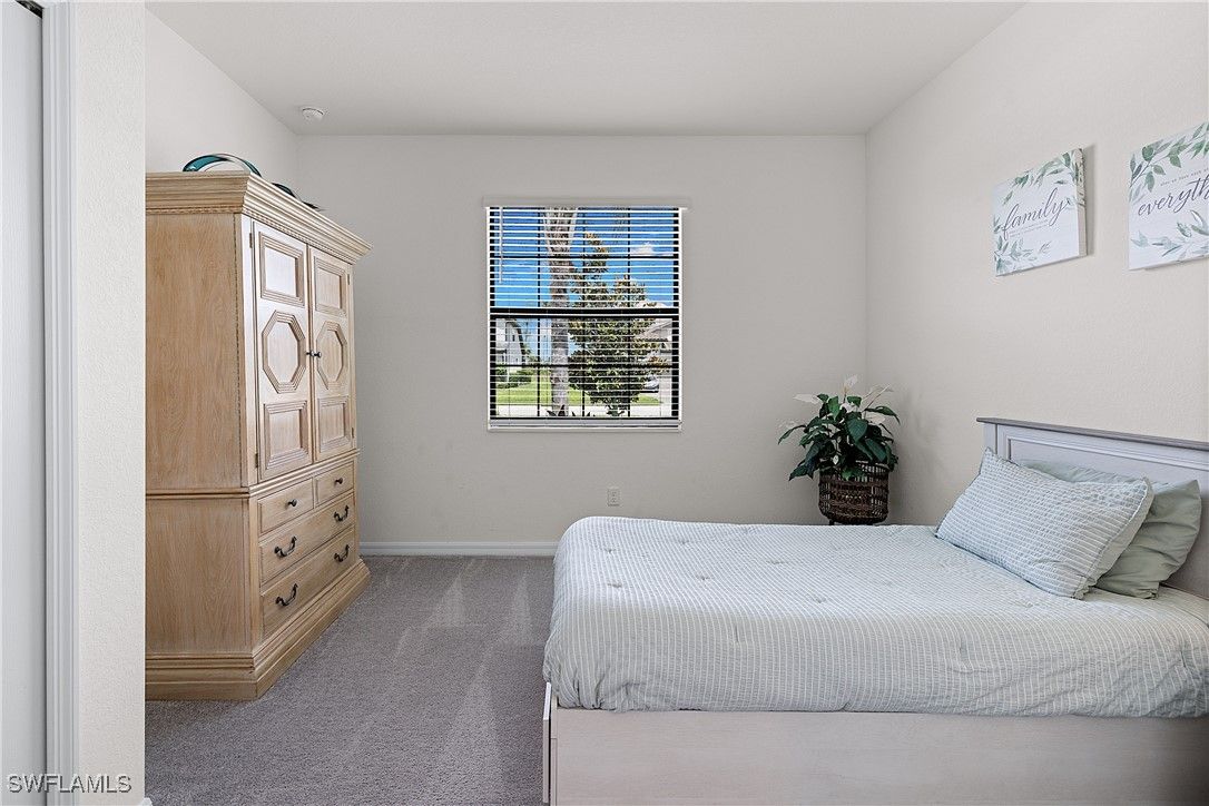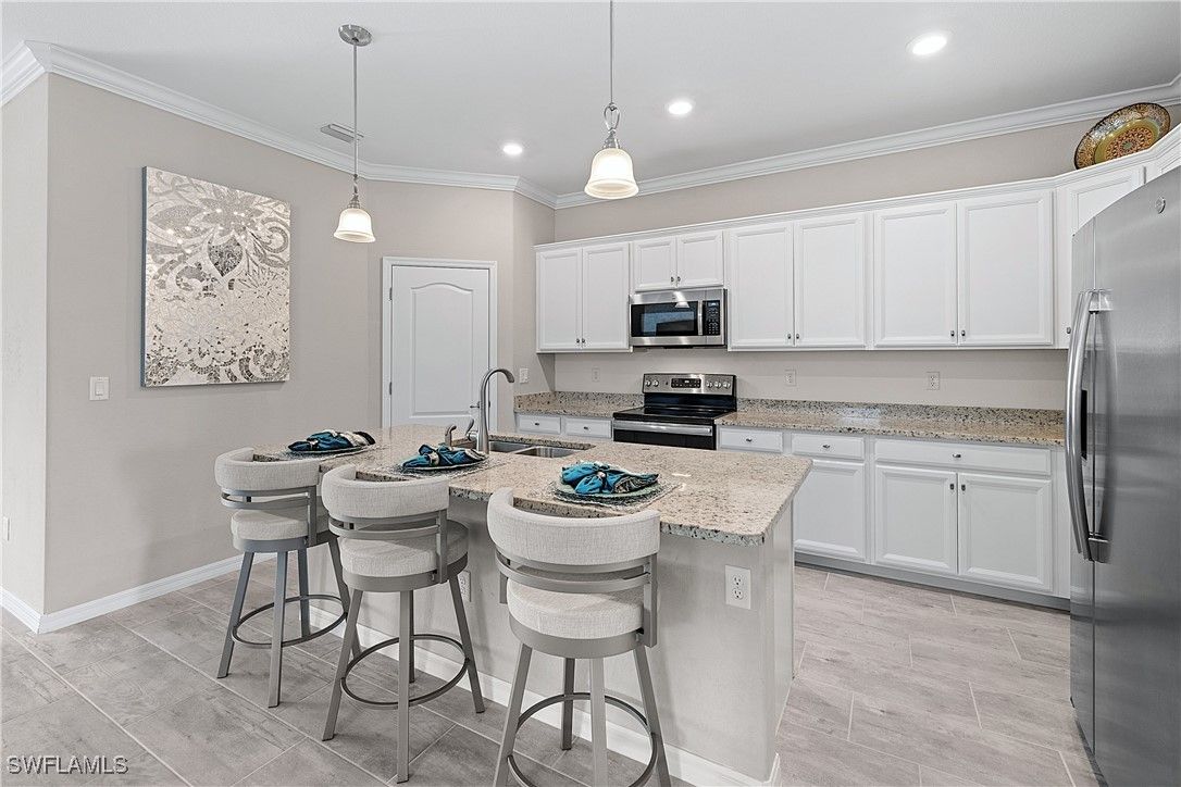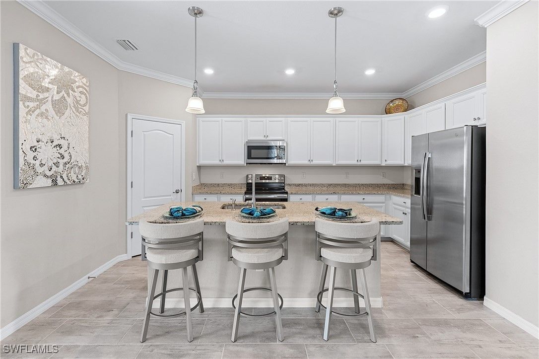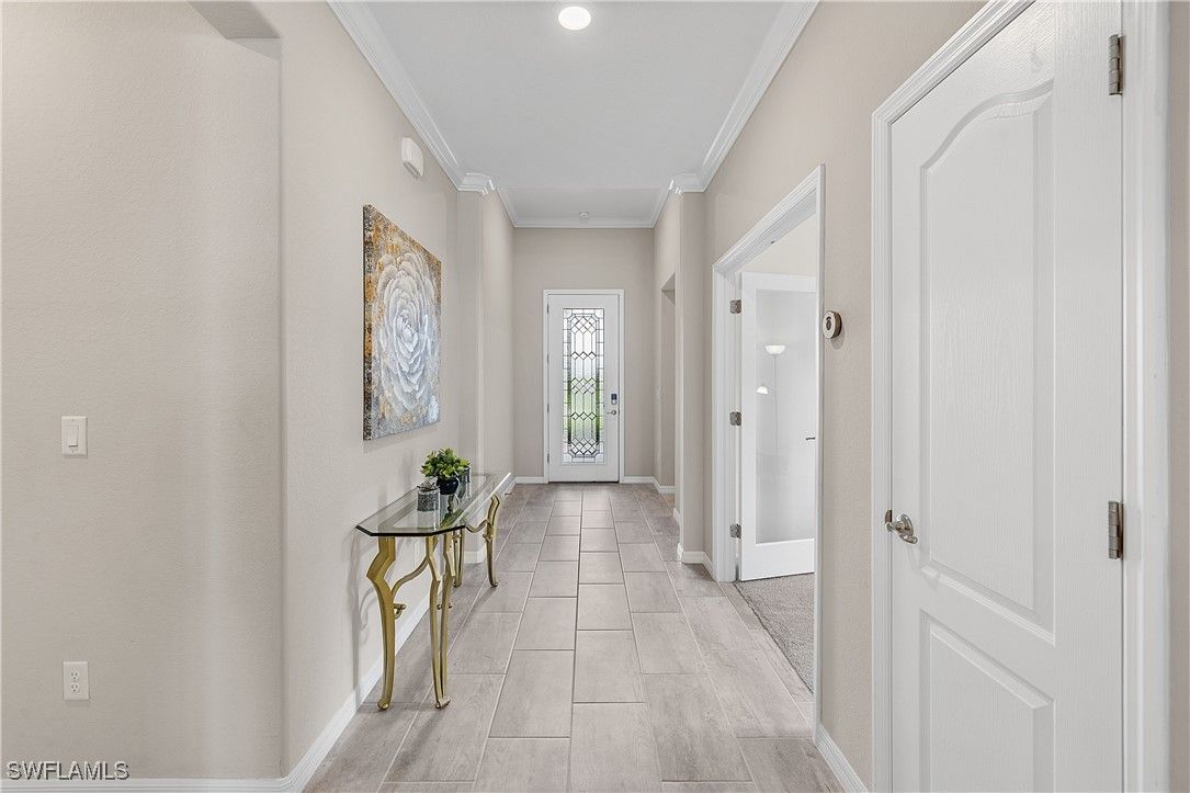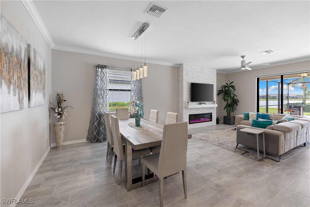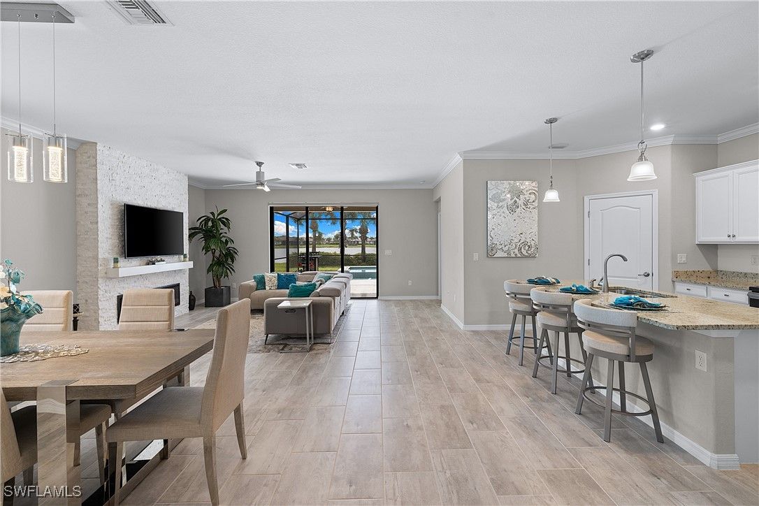 MOVE IN RIGHT AWAY! DESIRABLE LAKEFRONT HOME WITH CUSTOM SALTWATER POOL & SPA AND SPARKLING WATER VIEWS IS AVAILABLE NOW IN THE PLACE AT CORKSCREW! ENJOY SPECTACULAR SUNSETS OVER THE LAKE ALL YEAR LONG WITH THE WESTERN REAR EXPOSURE. This 2019 “Trevi” residence offers 3 Bedrooms + Den w/Glass Doors, 3 Full Baths, 2 Car Garage, 2,032sf living area. The outdoor space starts with the TRAVERTINE POOL DECK extending out 24 feet from the covered lanai. The CUSTOM POOL WITH CORNER SPA glistens when the water cascades over the modern teal glass mosaic tile onto the large SUNSHELF. The RAISED WALL adds an additional “POP” as a focal point with a sheer decent water feature. This deep homesite still provides plenty of room to add a fence beyond the screened pool enclosure for your kids and pets to play. The OPEN CONCEPT floorplan features 12” x 24” PLANK TILE, upgraded light fixtures and ceiling fans, REMOTE BLINDS ON SLIDERS, window treatments, CROWN MOLDING throughout the main areas and a DESIGNER GLASS DOOR INSERT. The Greatroom boasts a striking STONE FEATURE WALL equipped with an LED FIREPLACE that is perfect to create a relaxing atmosphere. The Kitchen showcases White cabinetry, STAINLESS STEEL APPLIANCES, Granite Countertops, a WALK-IN PANTRY and a kitchen island for casual dining. The Dining area joins the Greatroom creating an inviting space for entertaining in the heart of the home while opening onto the covered lanai space. The Primary Suite is appointed with a CUSTOM WOOD TRIM ACCENT WALL, dual closets and SPARKLING WATER VISTAS from your bedside. The Primary Bath boasts of double sinks, SOAKING TUB, SEPARATE SHOWER and a private water closet. Guests will enjoy accommodations in the split bedroom layout. One guest suite has it's own EN-SUITE FULL BATH for added privacy. WASHER AND DRYER included. PROPERTY IS HIGH AND DRY AND LOCATED IN FLOOD ZONE X... NO FLOOD INSURANCE REQUIRED! Amenities at The Place include: Resort Pool w/100' Waterslide, Indoor Restaurant, Bourbon Bar, Cafe, Outdoor Bar, Fitness Center, Movement Studio, Tennis, Pickleball, Bocce, Basketball, Playground, Dog Park, Childwatch, Spa Services. For GOLF ENTHUSIASTS, the highly rated Jack Nicklaus designed OLD CORKSCREW GOLF CLUB is open to the public and located directly across the street from the community entrance! NEW PUBLIX GROCERY STORE... JUST 1.4 MILES AWAY... IS NOW OPEN!!! TENANTS INCLUDE DUNKIN DONUTS, UPS STORE, LEGNO ITALIAN RESTAURANT, NAIL AND HAIR SALON, HEARTLAND DENTAL, AND MORE!