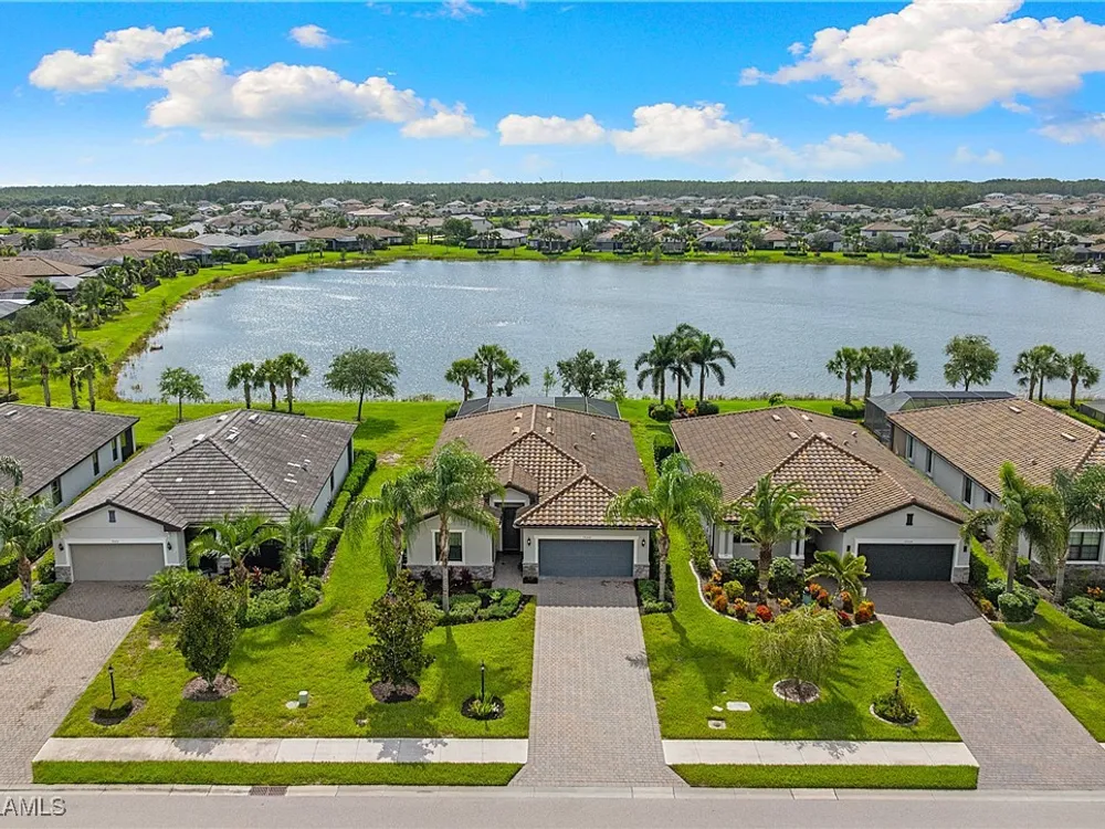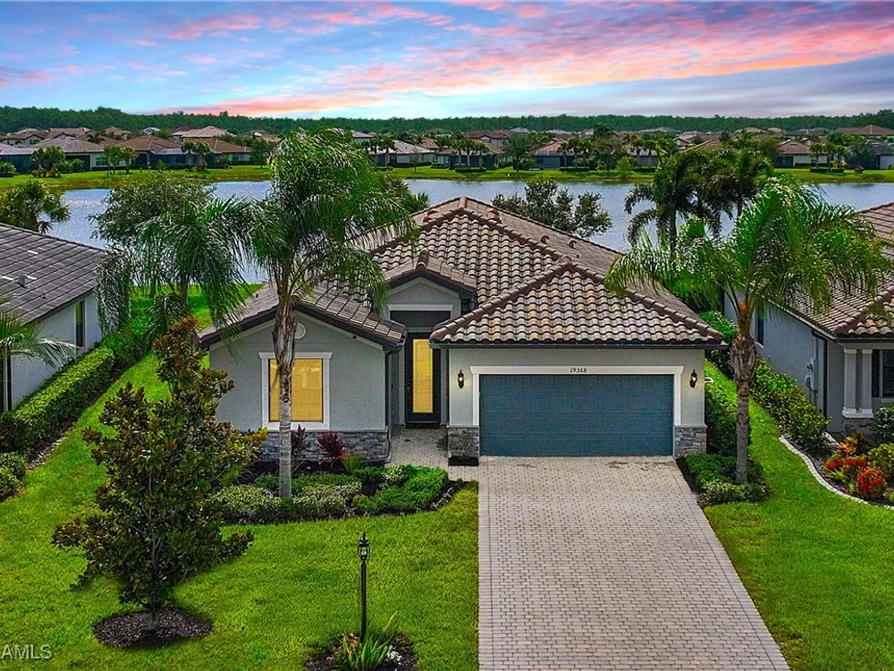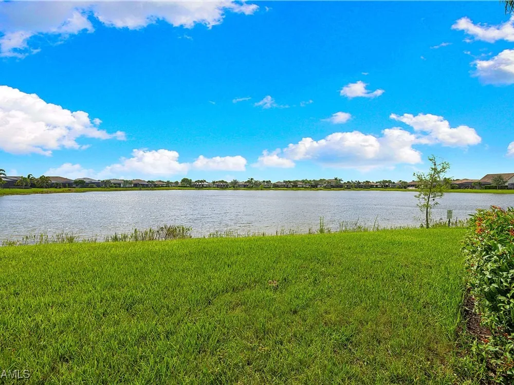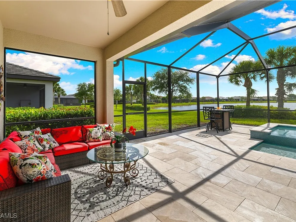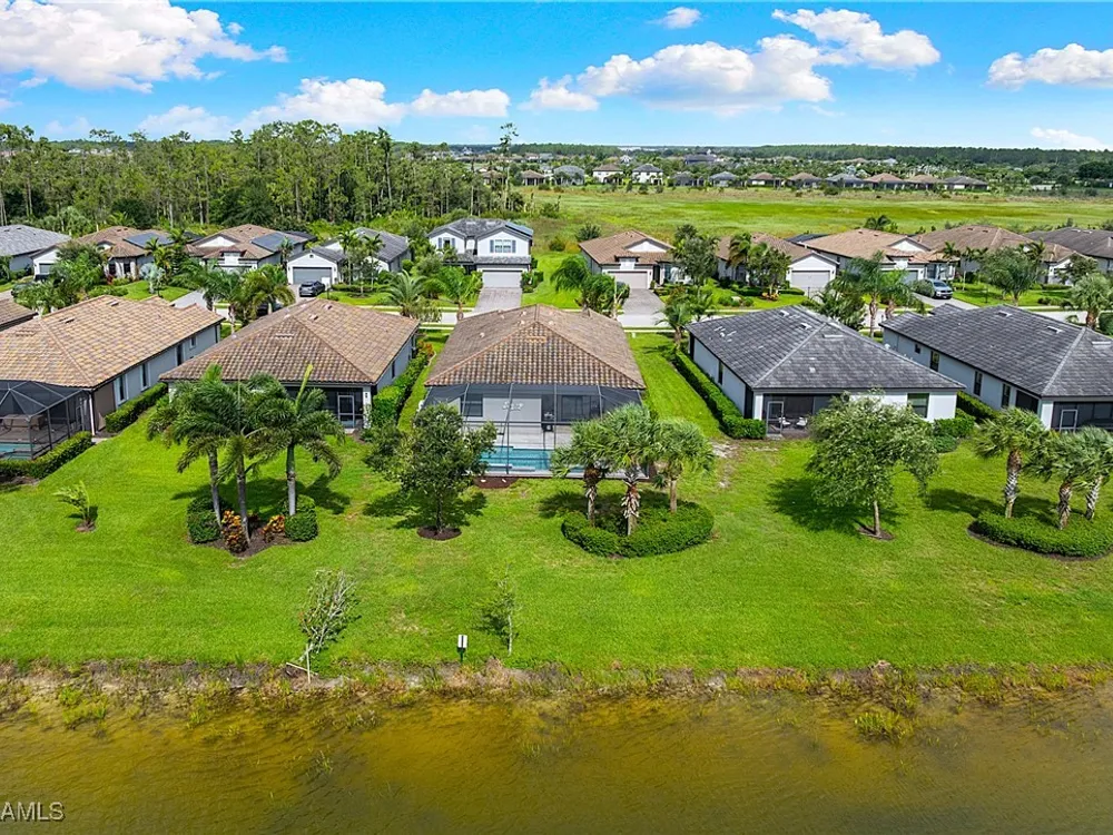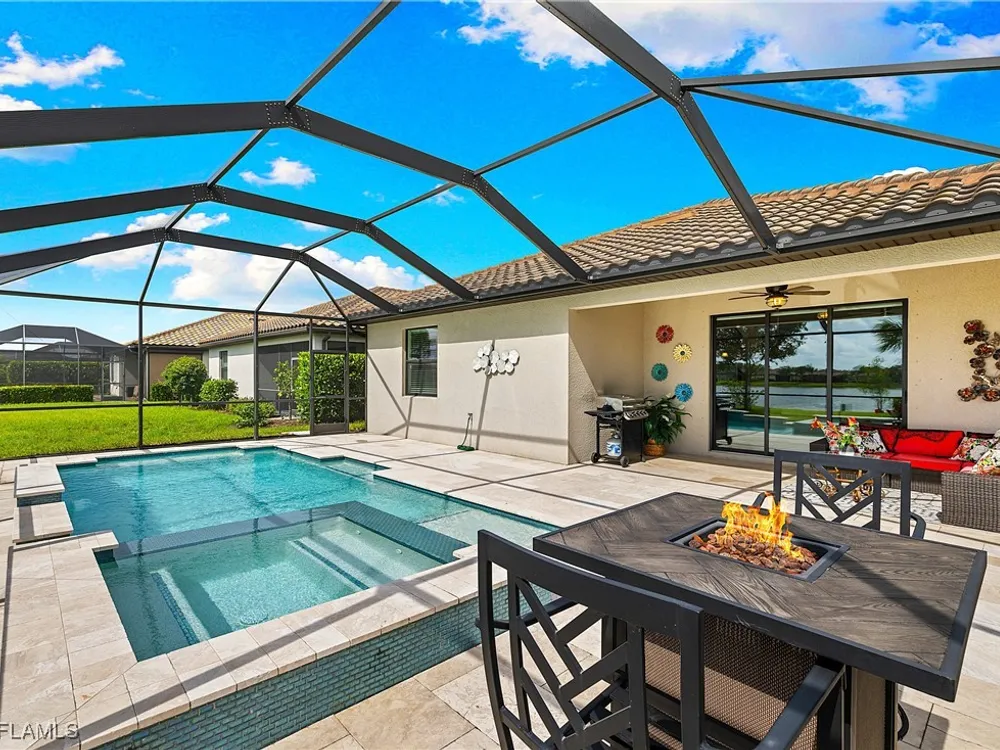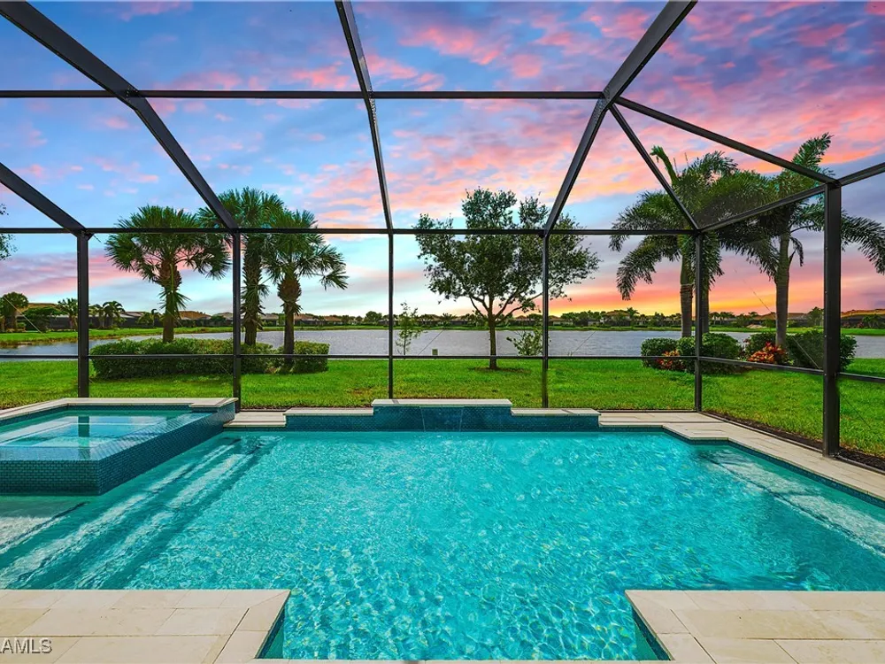 DESIRABLE LAKEFRONT HOME WITH CUSTOM SALTWATER POOL & SPA AND SPARKLING WATER VIEWS IS AVAILABLE NOW IN THE PLACE AT CORKSCREW! ENJOY SPECTACULAR SUNSETS OVER THE LAKE ALL YEAR LONG WITH THE WESTERN REAR EXPOSURE. This 2019 “Trevi” residence offers 3 Bedrooms + Den w/Glass Doors, 3 Full Baths, 2 Car Garage, 2,032sf living area. The outdoor space starts with the TRAVERTINE POOL DECK extending out 24 feet from the covered lanai. The CUSTOM POOL WITH CORNER SPA glistens when the water cascades over the modern teal glass mosaic tile onto the large SUNSHELF. The RAISED WALL adds an additional “POP” as a focal point with a sheer decent water feature. This deep homesite still provides plenty of room to add a fence beyond the screened pool enclosure for your kids and pets to play. The OPEN CONCEPT floorplan features 12” x 24” PLANK TILE, upgraded light fixtures and ceiling fans, REMOTE BLINDS ON SLIDERS, window treatments, CROWN MOLDING throughout the main areas and a DESIGNER GLASS DOOR INSERT. The Greatroom boasts a striking STONE FEATURE WALL equipped with an LED FIREPLACE that is perfect to create a relaxing atmosphere. The Kitchen showcases White cabinetry, STAINLESS STEEL APPLIANCES, Granite Countertops, a WALK-IN PANTRY and a kitchen island for casual dining. The Dining area joins the Greatroom creating an inviting space for entertaining in the heart of the home while opening onto the covered lanai space. The Primary Suite is appointed with a CUSTOM WOOD TRIM ACCENT WALL, dual closets and SPARKLING WATER VISTAS from your bedside. The Primary Bath boasts of double sinks, SOAKING TUB, SEPARATE SHOWER and a private water closet. Guests will enjoy accommodations in the split bedroom layout. One guest suite has it's own EN-SUITE FULL BATH for added privacy. WASHER AND DRYER included. PROPERTY IS HIGH AND DRY AND LOCATED IN FLOOD ZONE X... NO FLOOD INSURANCE REQUIRED! Amenities at The Place include: Resort Pool w/100' Waterslide, Indoor Restaurant, Bourbon Bar, Cafe, Outdoor Bar, Fitness Center, Movement Studio, Tennis, Pickleball, Bocce, Basketball, Playground, Dog Park, Childwatch, Spa Services. For GOLF ENTHUSIASTS, the highly rated Jack Nicklaus designed OLD CORKSCREW GOLF CLUB is open to the public and located directly across the street from the community entrance! NEW PUBLIX GROCERY STORE... JUST 1.4 MILES AWAY... IS NOW OPEN!!! TENANTS INCLUDE DUNKIN DONUTS, UPS STORE, LEGNO ITALIAN RESTAURANT, NAIL AND HAIR SALON, HEARTLAND DENTAL, AND MORE!