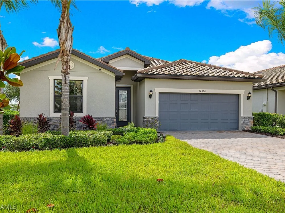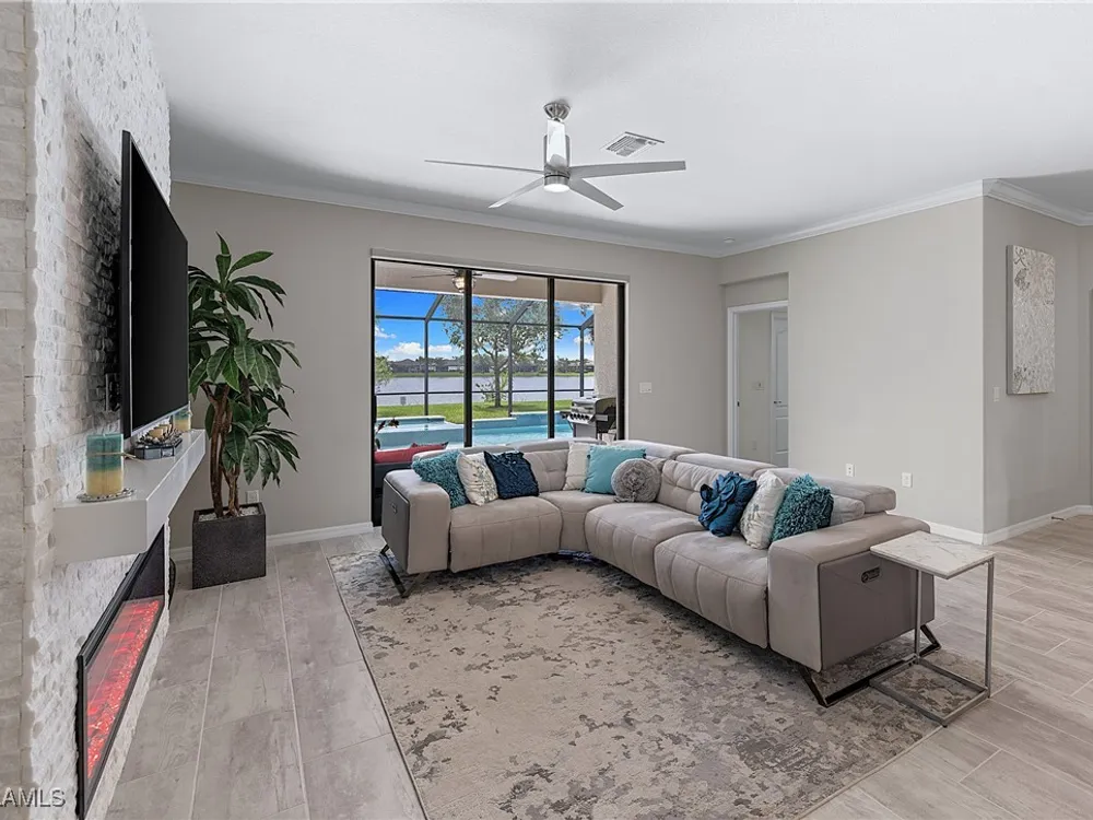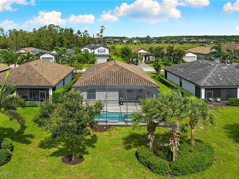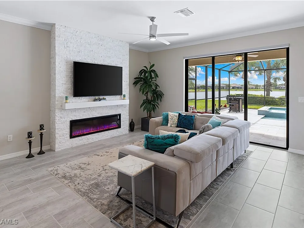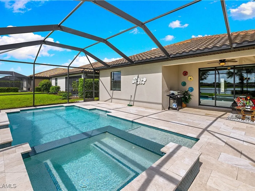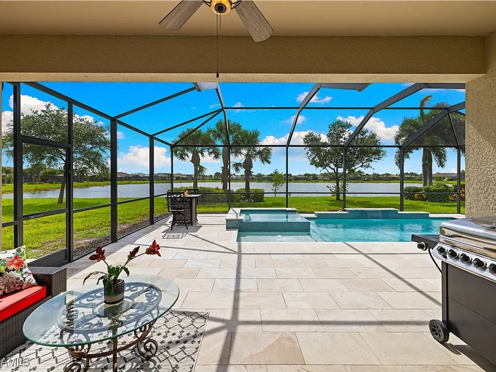 DESIRABLE LAKEFRONT HOME WITH CUSTOM SALTWATER POOL & SPA AND SPARKLING WATER VIEWS IS AVAILABLE NOW IN THE PLACE AT CORKSCREW! ENJOY SPECTACULAR SUNSETS OVER THE LAKE ALL YEAR LONG WITH THE WESTERN REAR EXPOSURE. This 2019 “Trevi” residence offers 3 Bedrooms + Den w/Glass Doors, 3 Full Baths, 2 Car Garage, 2,032sf living area. The outdoor space starts with the TRAVERTINE POOL DECK extending out 24 feet from the covered lanai. The CUSTOM POOL WITH CORNER SPA glistens when the water cascades over the modern teal glass mosaic tile onto the large SUNSHELF. The RAISED WALL adds an additional “POP” as a focal point with a sheer decent water feature. This deep homesite still provides plenty of room to add a fence beyond the screened pool enclosure for your kids and pets to play. The OPEN CONCEPT floorplan features 12” x 24” PLANK TILE, upgraded light fixtures and ceiling fans, REMOTE BLINDS ON SLIDERS, window treatments, CROWN MOLDING throughout the main areas and a DESIGNER GLASS DOOR INSERT. The Greatroom boasts a striking STONE FEATURE WALL equipped with an LED FIREPLACE that is perfect to create a relaxing atmosphere. The Kitchen showcases White cabinetry, STAINLESS STEEL APPLIANCES, Granite Countertops, a WALK-IN PANTRY and a kitchen island for casual dining. The Dining area joins the Greatroom creating an inviting space for entertaining in the heart of the home while opening onto the covered lanai space. The Primary Suite is appointed with a CUSTOM WOOD TRIM ACCENT WALL, dual closets and SPARKLING WATER VISTAS from your bedside. The Primary Bath boasts of double sinks, SOAKING TUB, SEPARATE SHOWER and a private water closet. Guests will enjoy accommodations in the split bedroom layout. One guest suite has it's own EN-SUITE FULL BATH for added privacy. WASHER AND DRYER included. PROPERTY IS HIGH AND DRY AND LOCATED IN FLOOD ZONE X... NO FLOOD INSURANCE REQUIRED! Amenities at The Place include: Resort Pool w/100' Waterslide, Indoor Restaurant, Bourbon Bar, Cafe, Outdoor Bar, Fitness Center, Movement Studio, Tennis, Pickleball, Bocce, Basketball, Playground, Dog Park, Childwatch, Spa Services. For GOLF ENTHUSIASTS, the highly rated Jack Nicklaus designed OLD CORKSCREW GOLF CLUB is open to the public and located directly across the street from the community entrance! NEW PUBLIX GROCERY STORE... JUST 1.4 MILES AWAY... IS NOW OPEN!!! TENANTS INCLUDE DUNKIN DONUTS, UPS STORE, LEGNO ITALIAN RESTAURANT, NAIL AND HAIR SALON, HEARTLAND DENTAL, AND MORE!
