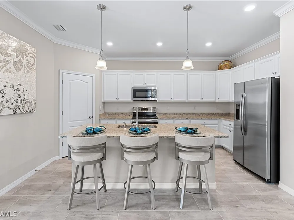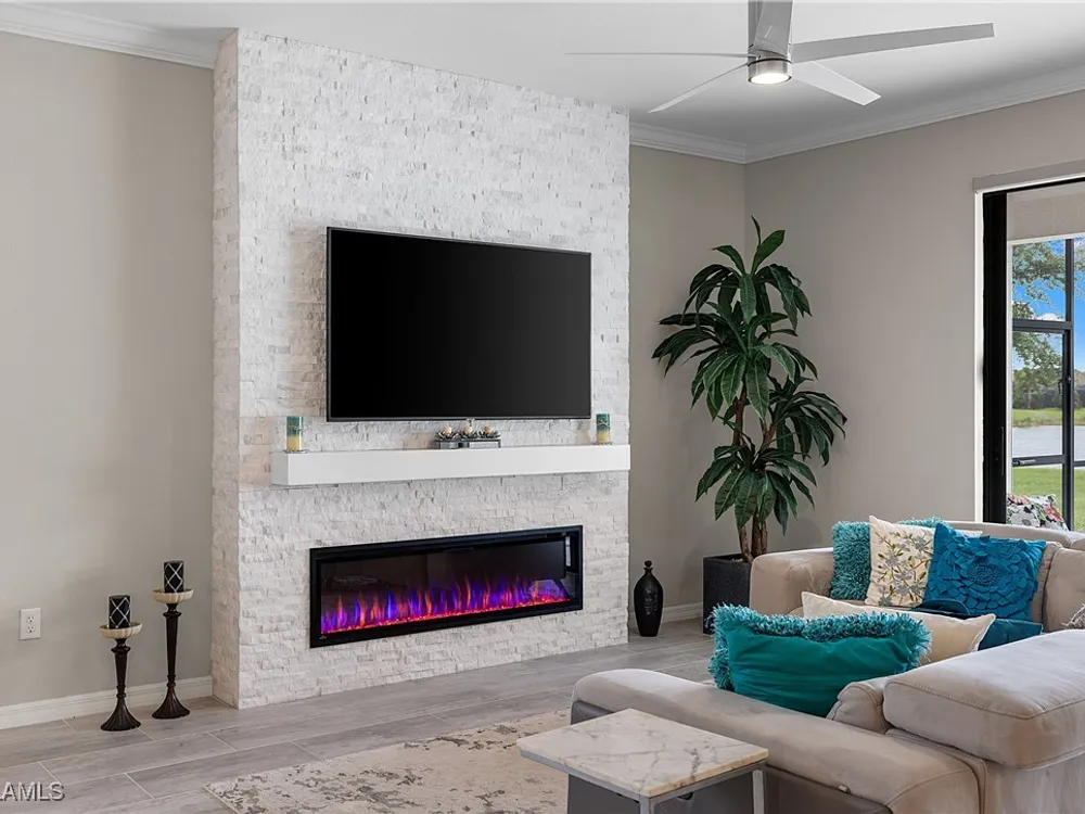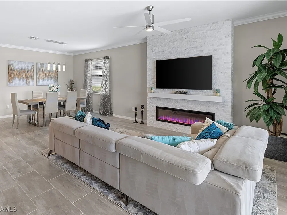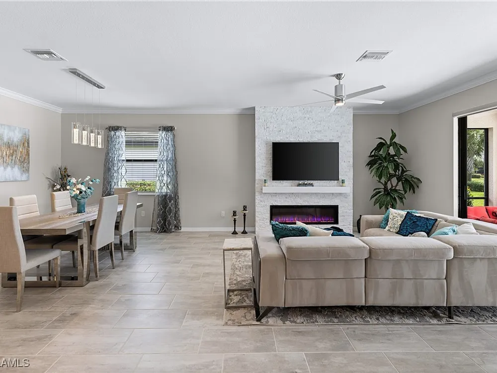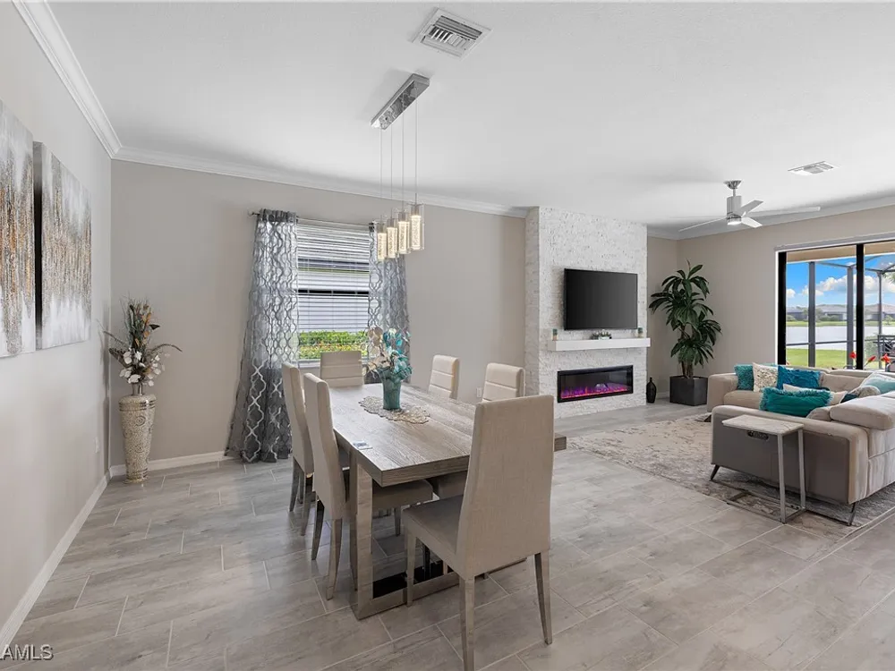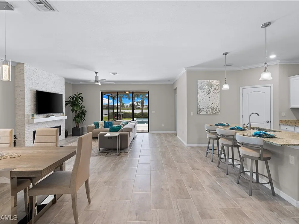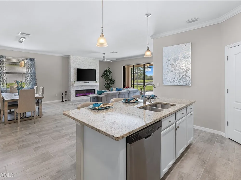 DESIRABLE LAKEFRONT HOME WITH CUSTOM SALTWATER POOL & SPA AND SPARKLING WATER VIEWS IS AVAILABLE NOW IN THE PLACE AT CORKSCREW! ENJOY SPECTACULAR SUNSETS OVER THE LAKE ALL YEAR LONG WITH THE WESTERN REAR EXPOSURE. This 2019 “Trevi” residence offers 3 Bedrooms + Den w/Glass Doors, 3 Full Baths, 2 Car Garage, 2,032sf living area. The outdoor space starts with the TRAVERTINE POOL DECK extending out 24 feet from the covered lanai. The CUSTOM POOL WITH CORNER SPA glistens when the water cascades over the modern teal glass mosaic tile onto the large SUNSHELF. The RAISED WALL adds an additional “POP” as a focal point with a sheer decent water feature. This deep homesite still provides plenty of room to add a fence beyond the screened pool enclosure for your kids and pets to play. The OPEN CONCEPT floorplan features 12” x 24” PLANK TILE, upgraded light fixtures and ceiling fans, REMOTE BLINDS ON SLIDERS, window treatments, CROWN MOLDING throughout the main areas and a DESIGNER GLASS DOOR INSERT. The Greatroom boasts a striking STONE FEATURE WALL equipped with an LED FIREPLACE that is perfect to create a relaxing atmosphere. The Kitchen showcases White cabinetry, STAINLESS STEEL APPLIANCES, Granite Countertops, a WALK-IN PANTRY and a kitchen island for casual dining. The Dining area joins the Greatroom creating an inviting space for entertaining in the heart of the home while opening onto the covered lanai space. The Primary Suite is appointed with a CUSTOM WOOD TRIM ACCENT WALL, dual closets and SPARKLING WATER VISTAS from your bedside. The Primary Bath boasts of double sinks, SOAKING TUB, SEPARATE SHOWER and a private water closet. Guests will enjoy accommodations in the split bedroom layout. One guest suite has it's own EN-SUITE FULL BATH for added privacy. WASHER AND DRYER included. PROPERTY IS HIGH AND DRY AND LOCATED IN FLOOD ZONE X... NO FLOOD INSURANCE REQUIRED! Amenities at The Place include: Resort Pool w/100' Waterslide, Indoor Restaurant, Bourbon Bar, Cafe, Outdoor Bar, Fitness Center, Movement Studio, Tennis, Pickleball, Bocce, Basketball, Playground, Dog Park, Childwatch, Spa Services. For GOLF ENTHUSIASTS, the highly rated Jack Nicklaus designed OLD CORKSCREW GOLF CLUB is open to the public and located directly across the street from the community entrance! NEW PUBLIX GROCERY STORE... JUST 1.4 MILES AWAY... IS NOW OPEN!!! TENANTS INCLUDE DUNKIN DONUTS, UPS STORE, LEGNO ITALIAN RESTAURANT, NAIL AND HAIR SALON, HEARTLAND DENTAL, AND MORE!