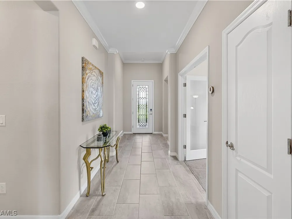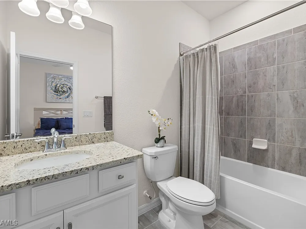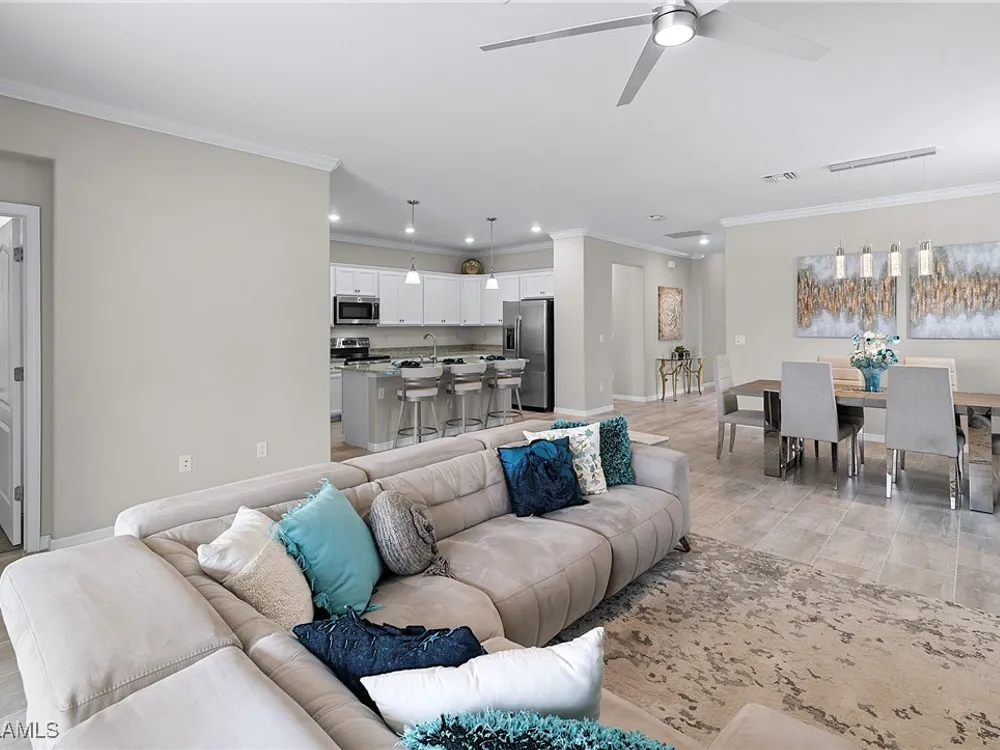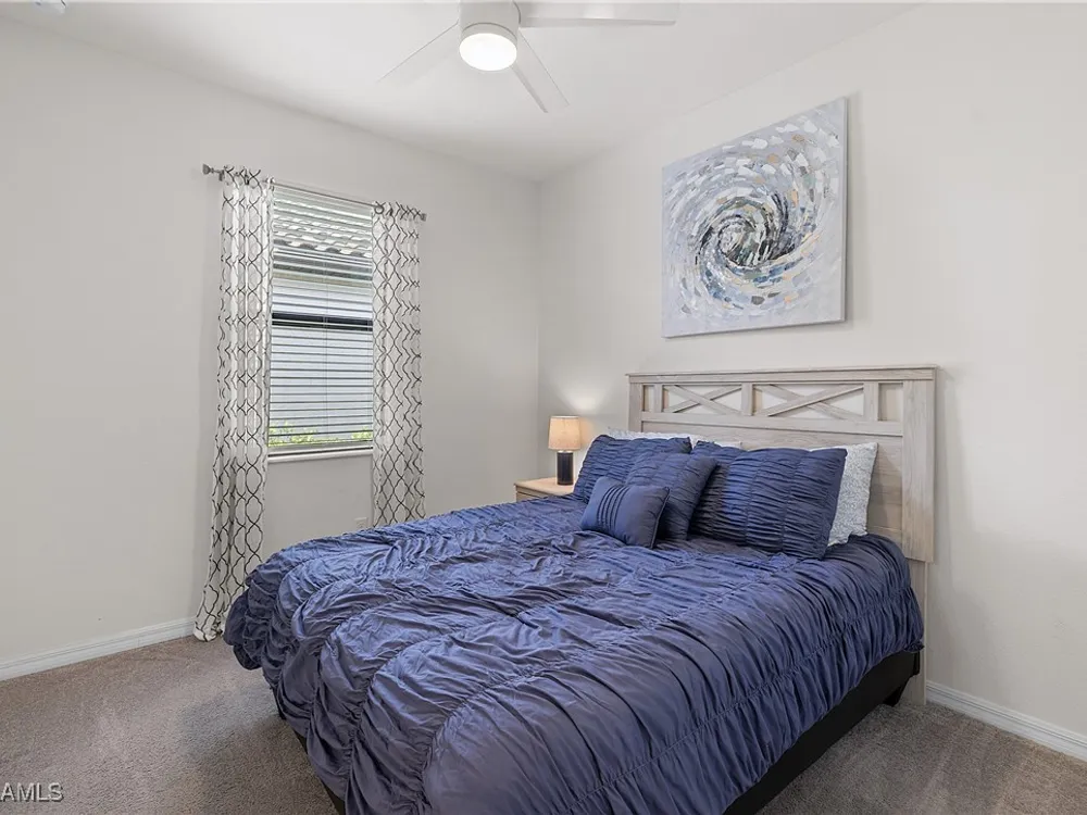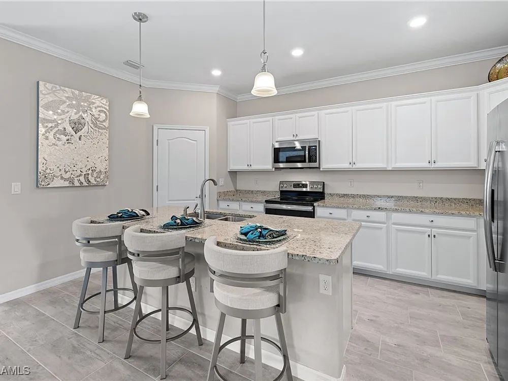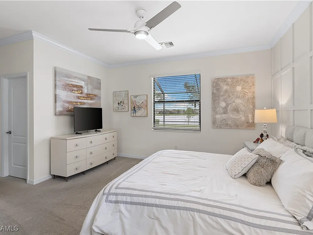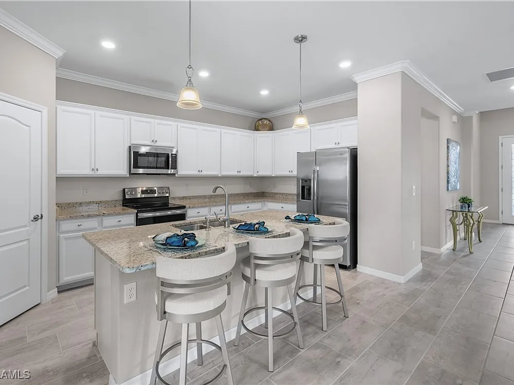 DESIRABLE LAKEFRONT HOME WITH CUSTOM SALTWATER POOL & SPA AND SPARKLING WATER VIEWS IS AVAILABLE NOW IN THE PLACE AT CORKSCREW! ENJOY SPECTACULAR SUNSETS OVER THE LAKE ALL YEAR LONG WITH THE WESTERN REAR EXPOSURE. This 2019 “Trevi” residence offers 3 Bedrooms + Den w/Glass Doors, 3 Full Baths, 2 Car Garage, 2,032sf living area. The outdoor space starts with the TRAVERTINE POOL DECK extending out 24 feet from the covered lanai. The CUSTOM POOL WITH CORNER SPA glistens when the water cascades over the modern teal glass mosaic tile onto the large SUNSHELF. The RAISED WALL adds an additional “POP” as a focal point with a sheer decent water feature. This deep homesite still provides plenty of room to add a fence beyond the screened pool enclosure for your kids and pets to play. The OPEN CONCEPT floorplan features 12” x 24” PLANK TILE, upgraded light fixtures and ceiling fans, REMOTE BLINDS ON SLIDERS, window treatments, CROWN MOLDING throughout the main areas and a DESIGNER GLASS DOOR INSERT. The Greatroom boasts a striking STONE FEATURE WALL equipped with an LED FIREPLACE that is perfect to create a relaxing atmosphere. The Kitchen showcases White cabinetry, STAINLESS STEEL APPLIANCES, Granite Countertops, a WALK-IN PANTRY and a kitchen island for casual dining. The Dining area joins the Greatroom creating an inviting space for entertaining in the heart of the home while opening onto the covered lanai space. The Primary Suite is appointed with a CUSTOM WOOD TRIM ACCENT WALL, dual closets and SPARKLING WATER VISTAS from your bedside. The Primary Bath boasts of double sinks, SOAKING TUB, SEPARATE SHOWER and a private water closet. Guests will enjoy accommodations in the split bedroom layout. One guest suite has it's own EN-SUITE FULL BATH for added privacy. WASHER AND DRYER included. PROPERTY IS HIGH AND DRY AND LOCATED IN FLOOD ZONE X... NO FLOOD INSURANCE REQUIRED! Amenities at The Place include: Resort Pool w/100' Waterslide, Indoor Restaurant, Bourbon Bar, Cafe, Outdoor Bar, Fitness Center, Movement Studio, Tennis, Pickleball, Bocce, Basketball, Playground, Dog Park, Childwatch, Spa Services. For GOLF ENTHUSIASTS, the highly rated Jack Nicklaus designed OLD CORKSCREW GOLF CLUB is open to the public and located directly across the street from the community entrance! NEW PUBLIX GROCERY STORE... JUST 1.4 MILES AWAY... IS NOW OPEN!!! TENANTS INCLUDE DUNKIN DONUTS, UPS STORE, LEGNO ITALIAN RESTAURANT, NAIL AND HAIR SALON, HEARTLAND DENTAL, AND MORE!