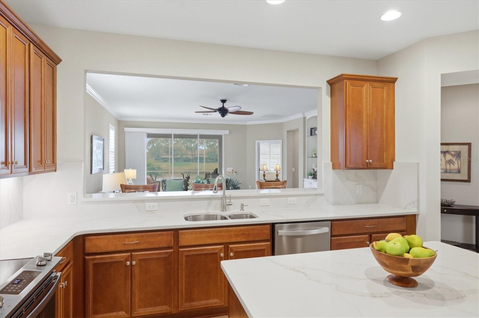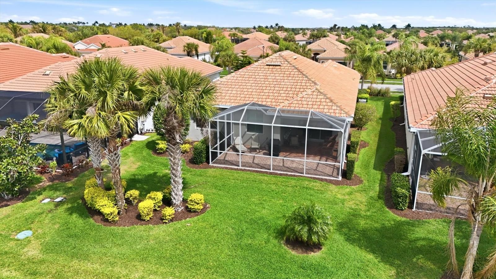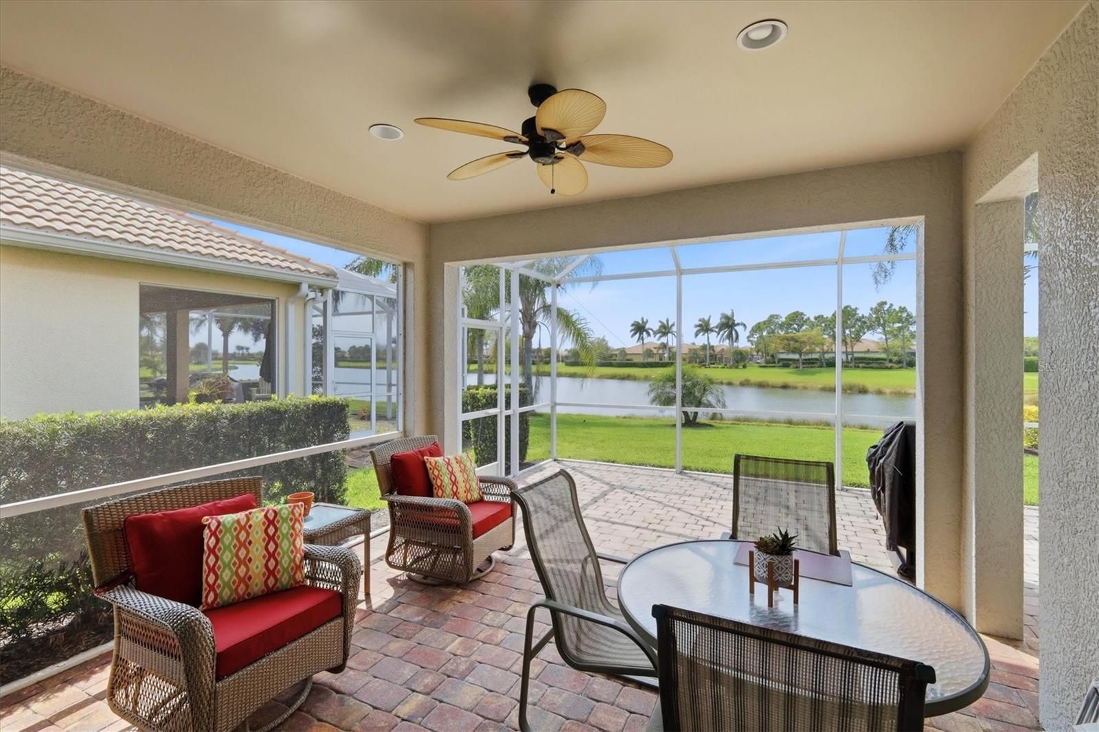 DON'T WAIT TO SEE THIS ONE! GORGEOUS LAKE VIEWS AND SPECTACULAR SUNSETS! This 2BD/2BA/DEN/2CG will not disappoint. Extremely spacious living area with crown molding accents, plantation shutters on windows, built ins for TV and shelves, and sliding doors to lanai. Windows on the South side make this a bright and cheery room. Step out onto the pavered and EXTENDED lanai. Sit, relax, and watch the beautiful SUNSETS and admire the TROPICAL LANDSCAPING. Entertain to the fullest with the huge lanai, lake views, and sunny exposure. Back inside- tile flooring throughout main areas with carpet in the 2 bedrooms. Large pass through window to kitchen. Kitchen has been updated with BEAUTIFUL QUARTZ counters and STAINLESS STEEL appliances. EXTRA RECESSED LIGHTS. Island in the center great for food prep, casual dining, and a place for friends to sit and chat. Separate nook space for breakfast or more formal affairs. SEPARATE DEN can be closed off with solid door when needed. Master bedroom with en suite bath that offers dual sinks and walk in shower with bench seat and dual head rain shower fixture. Same UNIQUE QUARTZ COUNTERS as kitchen. Walk in closet. Guest bedroom at other end of home for privacy. Guest bath updated with same QUARTZ counters and updated fixtures as master. Laundry room has folding counter space, storage cabinets, and updated washer/dryer. Need a little break from the sun? Sit on the screened in front porch. Home has been lovingly decorated with neutral paint and colorful accents. TURNKEY FURNISHING ARE NEGOTIABLE. Islandwalk is a Premier resort style community offering 2 Clubhouses with swimming pools/spa and fitness centers, 12 lighted pickleball courts,8 Har Tru tennis courts, bocce ball, Dog Park and 2 activities directors coordinating tons of activities/social events. Designed w/ the outdoors in mind- walking paths and bridges flow throughout the community amidst the tropical landscape. Located minutes to Manasota Beach, Venice Beach, shopping, and Venice Downtown with its quaint shops, restaurants, and theatres. Plus just around the corner from the Atlanta Braves stadium and spring training camp, the NEW WELLEN PARK designed community with tons of restaurants, shops, and activities, The 80 acre Grand Lake with numerous outdoor water activities and walking trails. Back gate is now open for easy access to enjoy all the activity choices outside of Islandwalk. RUN, RUN, RUN, DON'T WALK. Don't miss out- this is the new upcoming PLACE TO BE!!! Start living your Florida Lifestyle Today!!