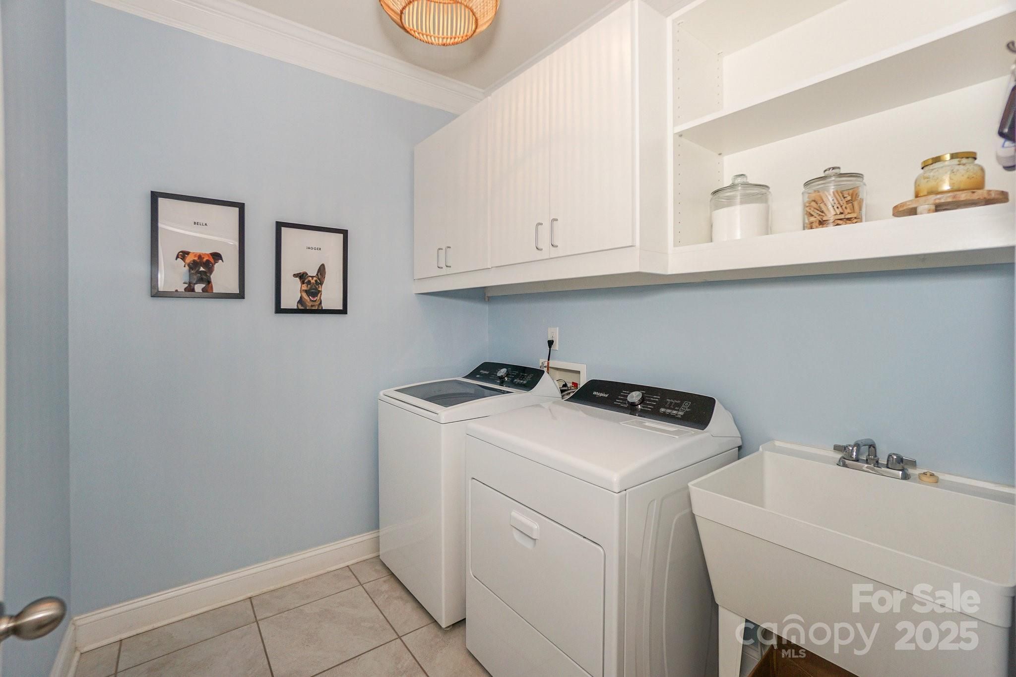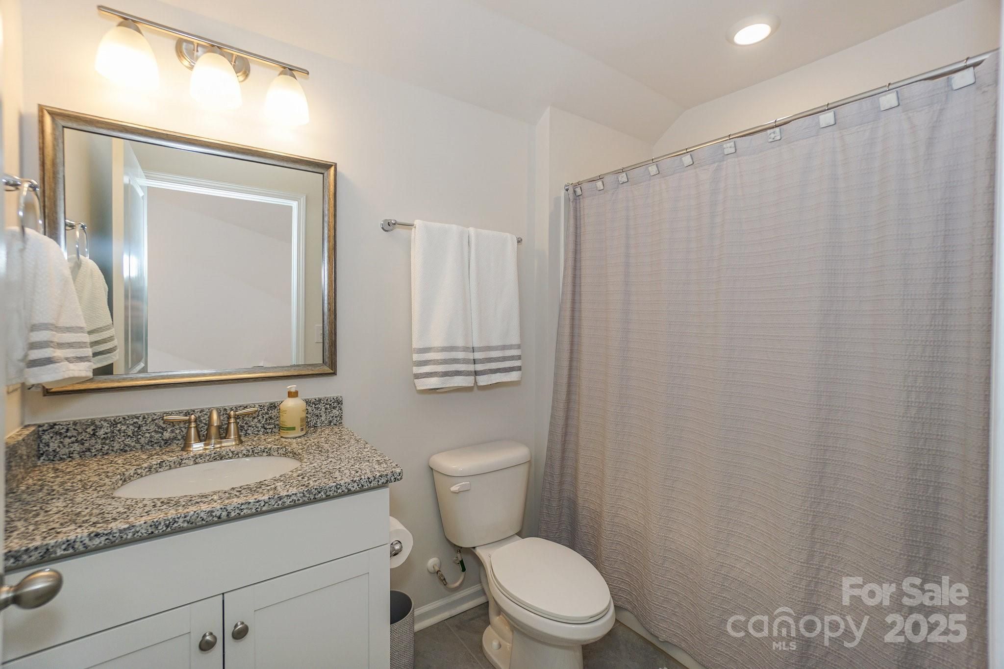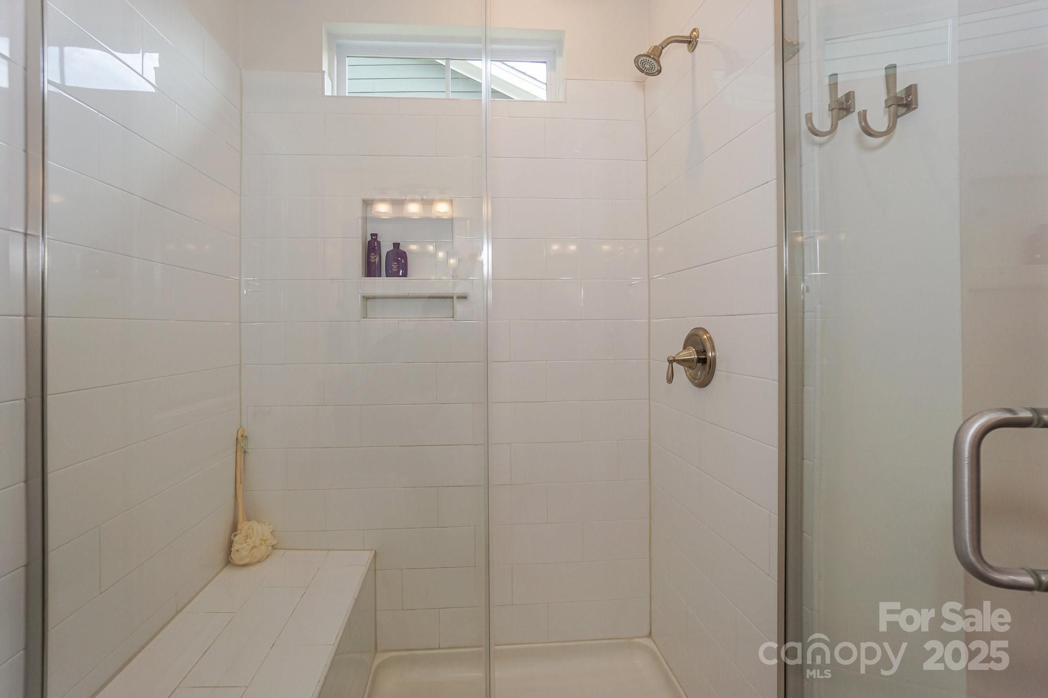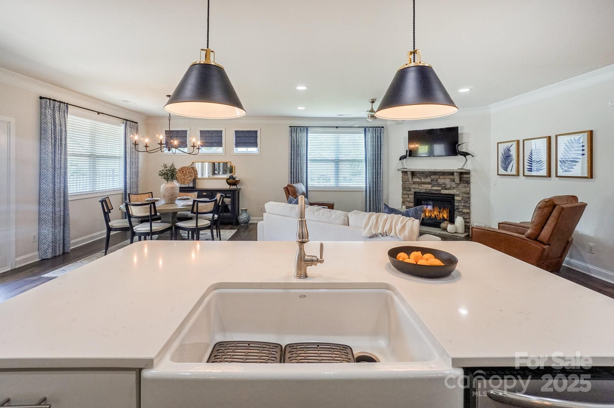 Welcome to Lakewalk living! This 3-bed, 3-bath home, built in 2020, offers 2,529 HLA of refined yet comfortable space plus a bonus loft and walk-in attic storage. Located on a quiet street, the property backs to HOA-maintained green space with benches and a walking trail, offering a sense of openness without the maintenance. Inside, the main level is designed for effortless living and entertaining. A gourmet kitchen anchors the open layout, featuring white shaker cabinetry, quartz counters, a black shiplap island with seating, bronze pendants and stainless steel appliances and gas range. The kitchen flows into a light-filled dining area and great room with crown molding, hardwood floors and a stone-faced gas fireplace. Nearby, an office/flex room with a beautiful accent wall provides a private workspace or guest space. A spacious walk-in pantry keeps essentials organized with custom shelving. The main-level primary suite is generously sized with hardwood floors and a tray ceiling. Its ensuite bath offers dual vanities, a tiled walk-in shower with bench and glass enclosure, and access to a custom-shelved closet. A second bedroom and full bath are on this level, while upstairs you’ll find another bedroom and bath plus a large loft/bonus room suitable for a gym, media room or playroom. The laundry room includes cabinetry and a sink for convenience, and a huge walk-in attic provides storage. Outdoor living is a highlight. French doors open to a covered veranda with a ceiling fan for year-round use. A custom paver patio features a curved stone bench and built-in fire pit under a cantilevered umbrella, making it perfect for gatherings. The fenced yard is professionally landscaped and borders community green space. The Lakewalk community offers resort-style amenities: pickleball courts, a clubhouse with a large pool and sun deck, playground, dog park and walking trails. Residents enjoy private lake access with a waterfront pavilion, grill and picnic area, stone steps to the water and kayak/canoe launch. Lawn maintenance is included in the HOA dues, freeing you to spend your weekends on the lake or at the pool. Just minutes to shopping, dining and I-77, this home combines luxury finishes, thoughtful design and an unparalleled lakeside lifestyle.