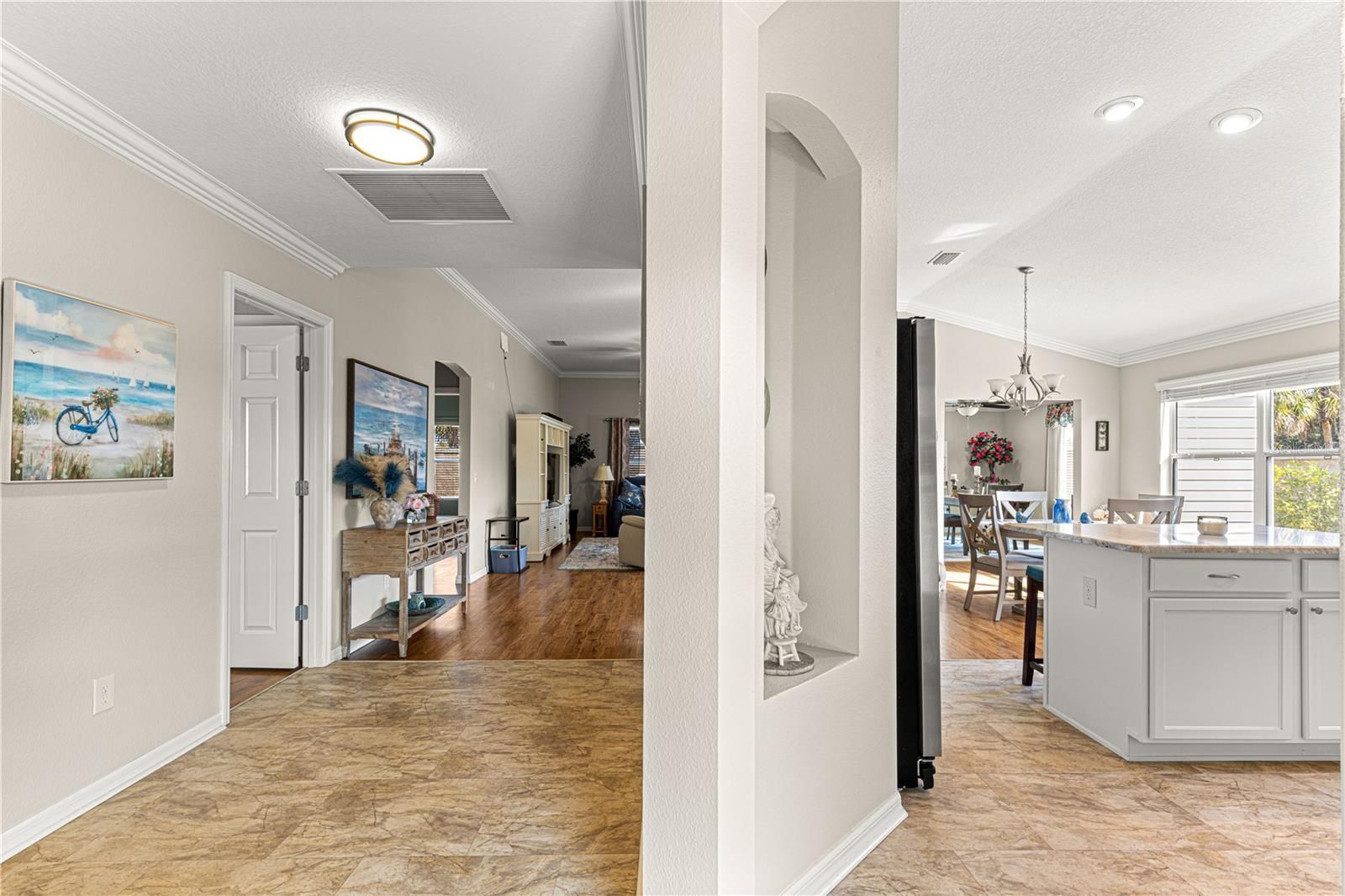 - Ceiling Fan(s), Crown Molding, Eat-in Kitchen, High Ceilings, Living/Dining Room, Open Floorplan, Main Level Primary, Thermostat, Tray Ceiling(s), Walk-In Closet(s), Window Treatments