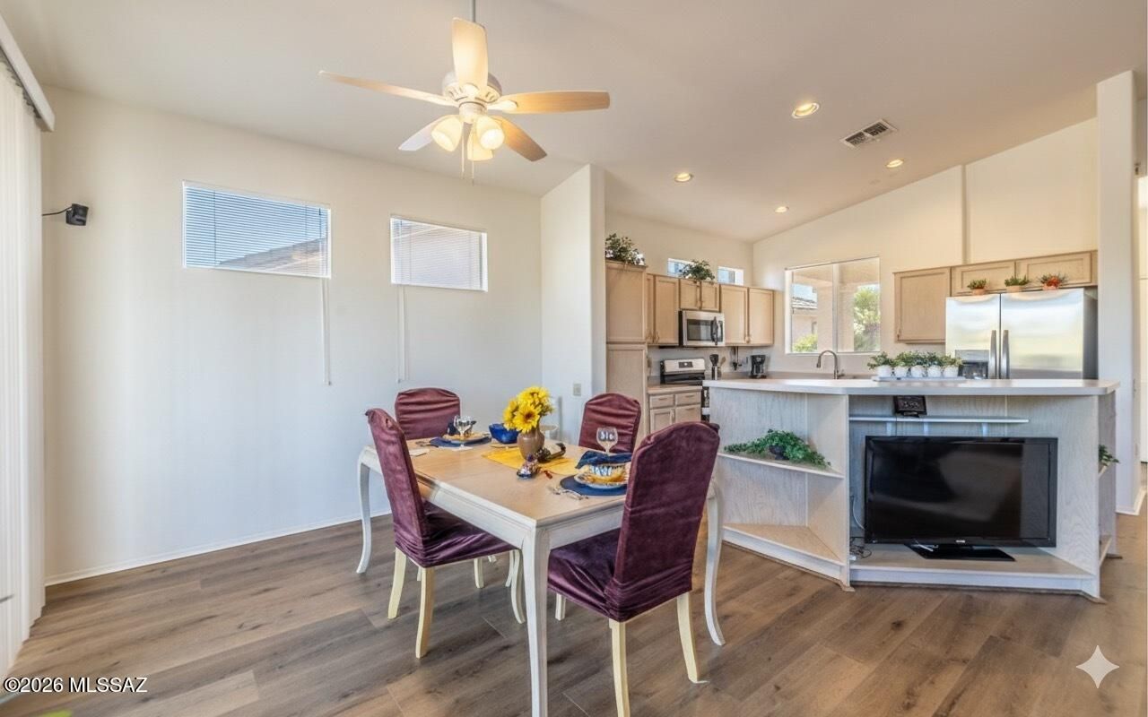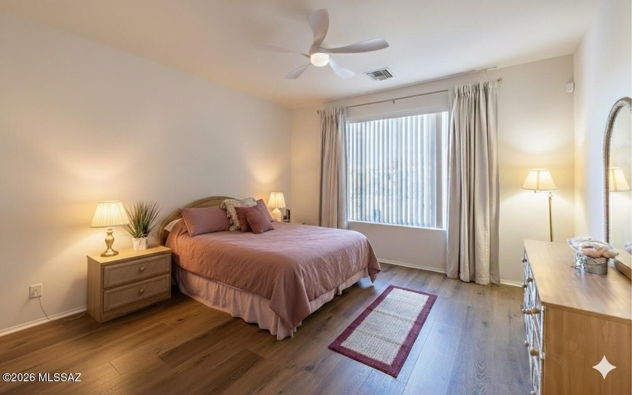 Turn-key 2BR/2BA home in the desirable San Ignacia Vista 55+ community, featuring mountain views and a freshly painted exterior. Enjoy single-level, open-concept living with NEW luxury vinyl plank flooring throughout, NEW stainless steel appliances, updated ceiling fans, NEW lighting fixtures, and NEW door hardware and ALL NEW window treatments and blinds. The split-bedroom design offers a private guest suite with pocket door, ideal for visitors or a home office. Relax in the low-maintenance backyard with covered patio and view fencing, perfect for enjoying peaceful desert scenery and local wildlife.