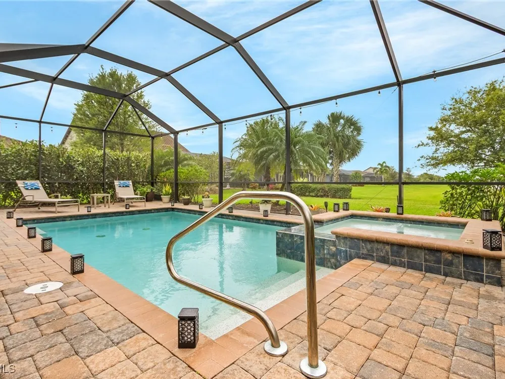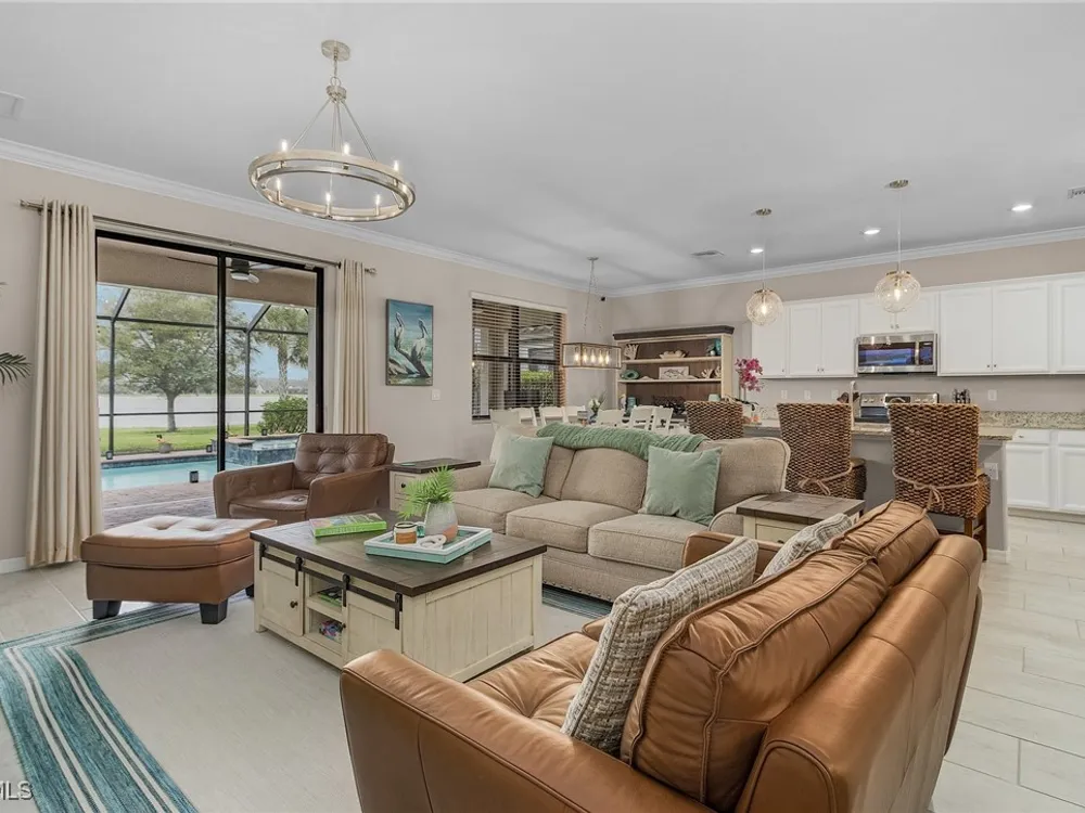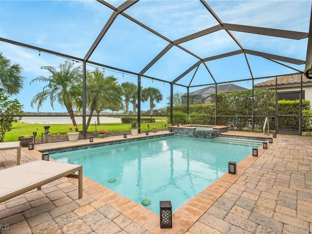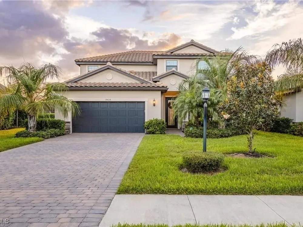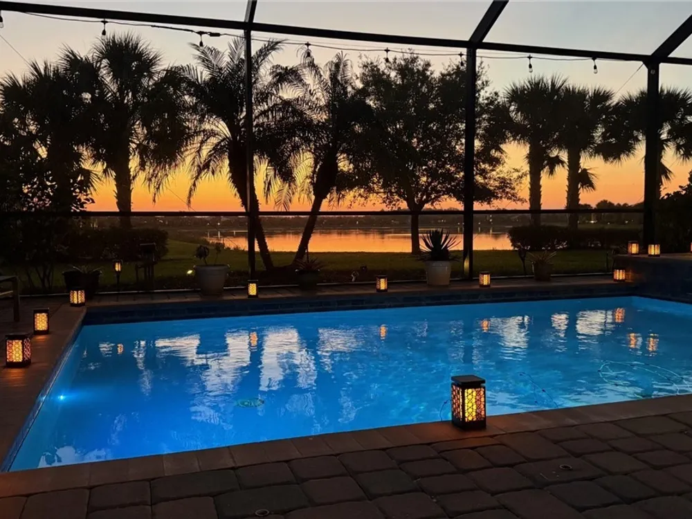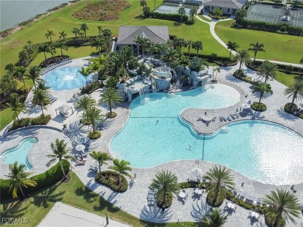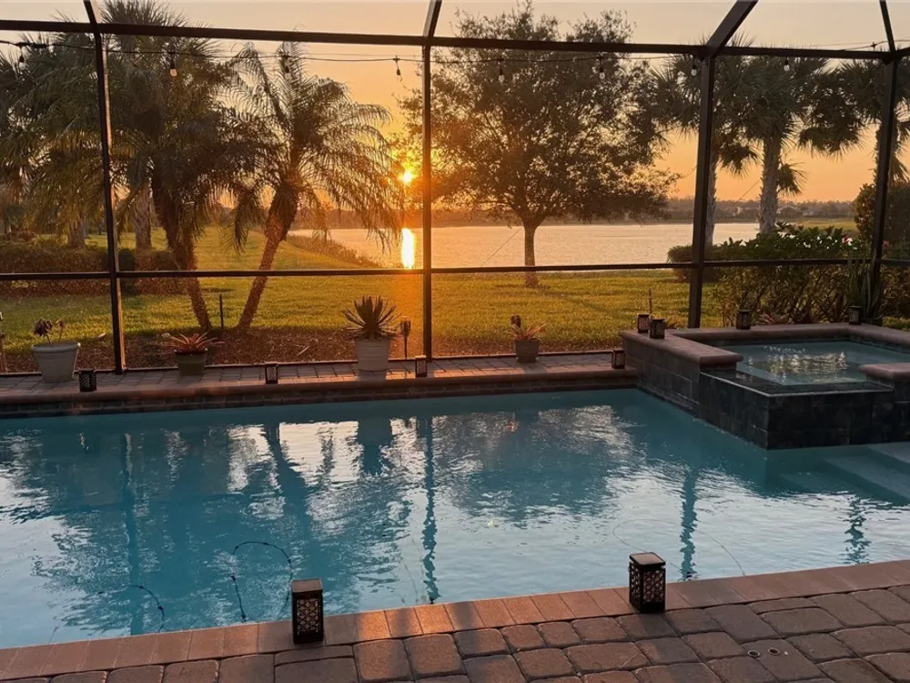 Your Florida oasis is ready! This TURNKEY fully-furnished home comes ready with everything you need to move in and enjoy- SELLER TO CREDIT FOR FIRST YEAR OF INSURANCE PREMIUM. This coastal style Amalfi model is a rare 2-story floor plan with over 2,600 sq ft of well planned living space. 5 bedrooms plus a spacious loft, 3 full baths, 2-car garage, screened lanai with pool and million-dollar direct Western sunset view over the water. Stainless appliances, custom window treatments, granite countertops, real wood cabinetry, oversized island, pantry, upgraded tile in main living areas, luxury vinyl plank (LVP) on stairs and entire upper level, crown molding, tiled showers, walk in closets. Owner's suite bathroom offers double sink vanities, a large soaking tub, and upgraded tempered glass walk-in shower. Relax on your private lanai with sun deck, seating area, dining area, and saltwater pool with hot tub, all controlled via mobile app including multi-color LED lights in the pool and around the screened lanai; new pool pump in January of 2025. Short few minute walk to The Place at Corkscrew (TPAC) amenities including resort pool with slide, splash pad, 24-hour 2-story fitness center, restaurant with bourbon bar, a coffee/sandwich/ice cream cafe, volleyball court, covered playground, bocce courts, tennis courts, pickleball courts, and basketball courts.
