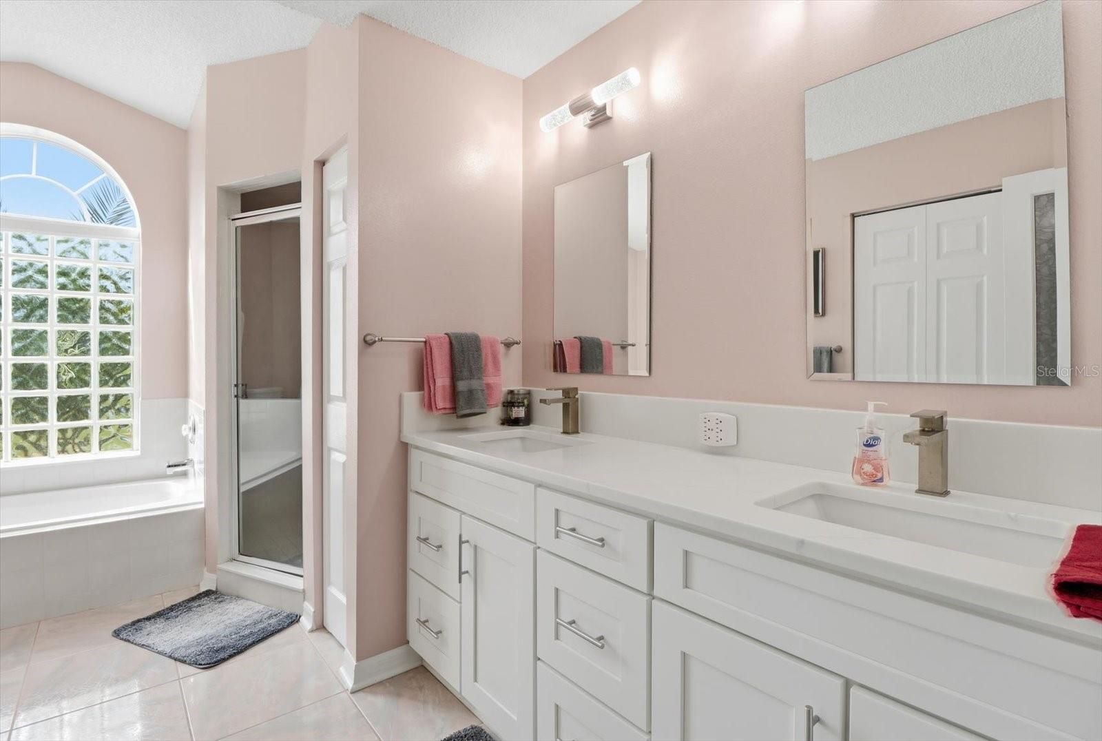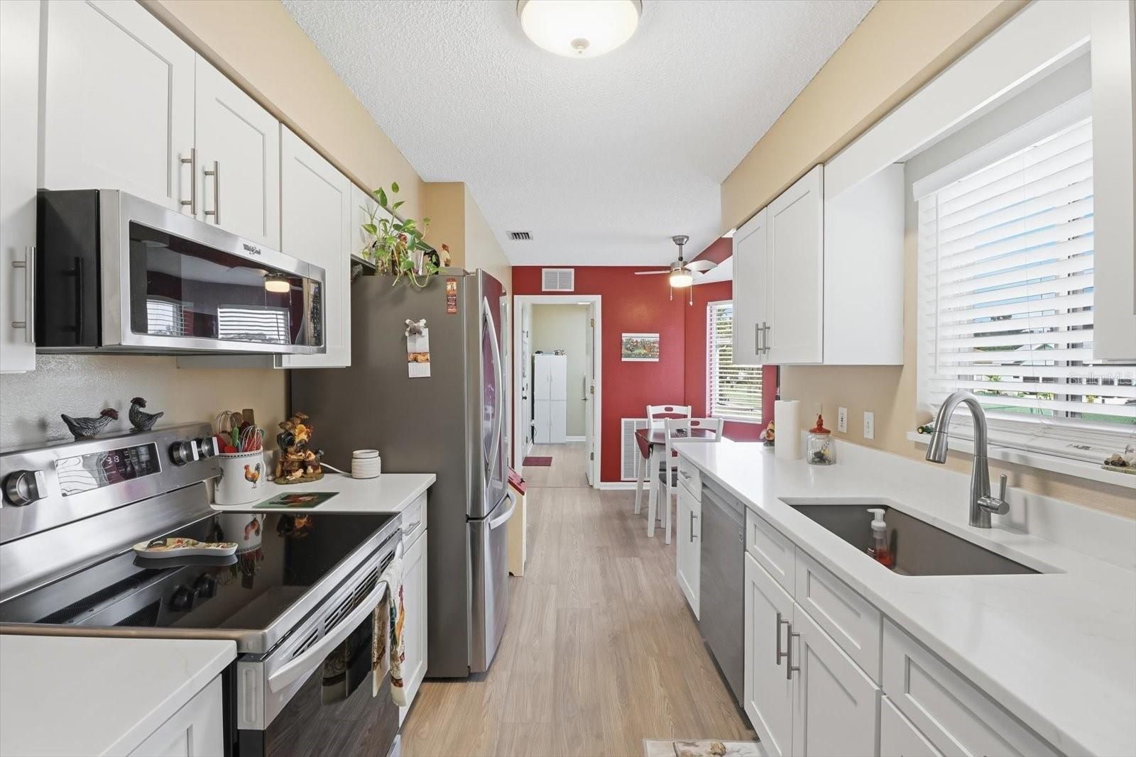 Beautifully updated 2-bedroom, 2-bath, 2 car garage Pindo model home is located in the 55+ golf community of Ocala Palm. Vaulted ceilings give this home a spacious feel while the new laminate floors throughout give a stylish look. The newly updated kitchen has white shaker cabinets with soft-close features- white quartz countertops, and stainless-steel appliances complete the sleek look. The split-bedroom floor plan offers privacy for guests, while both bathrooms feature updated vanities and comfort height commodes. The primary suite offers a walk-in closet as well as an ensuite bathroom with dual vanity sinks, a walk-in shower and soaker tub. Enjoy Florida living year-round on the screened porch with vinyl windows or relax outdoors on the paver patio overlooking the large, fenced in yard which has 2 fig trees. Additional highlights include a large interior laundry room, recently painted interior and exterior, and a newer (2020) 2.5 ton heat pump.