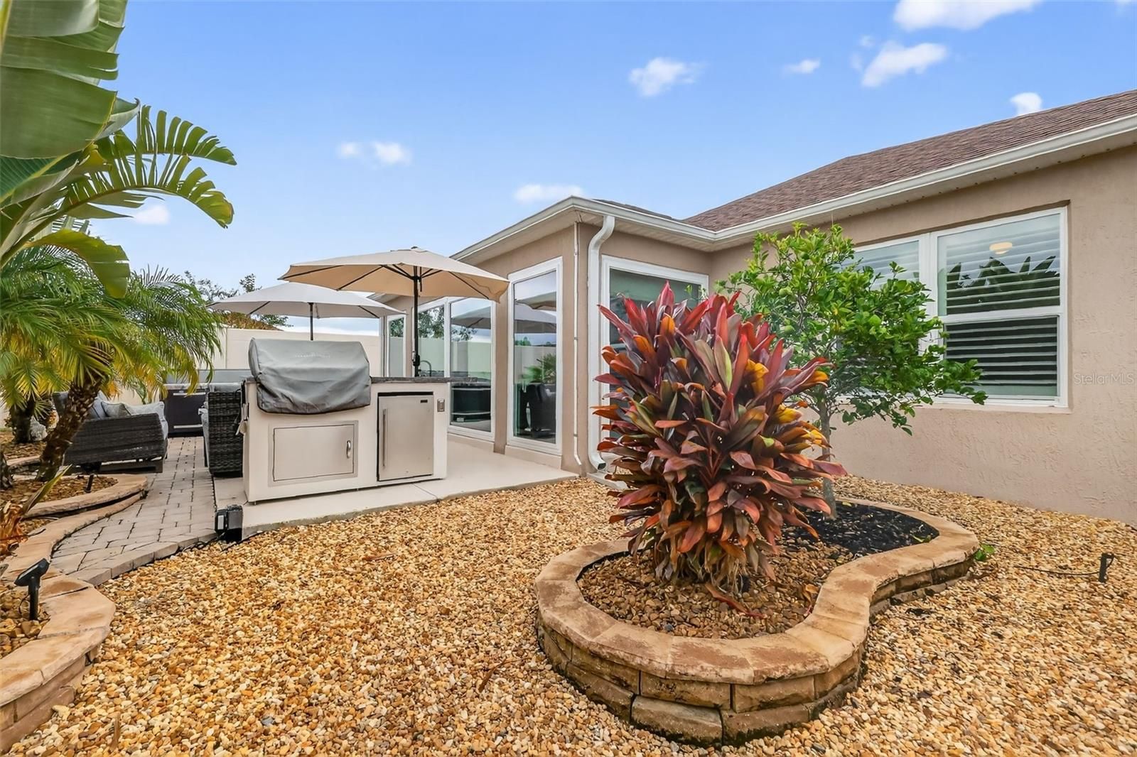 EXQUISITE 3/2 Winslow Courtyard Villa with UNDER-AIR, ENCLOSED LANAI; PRIVATE, FENCED REAR YARD; and OVERSIZED 2-CAR + GOLF CART GARAGE on a LARGE, CORNER LOT in the VIBRANT Village of Linden in the sought after Linden Isle! LUSH, TROPICAL landscaping with LOW-MAINTENANCE STONED beds and TIERED WALLS; a QUAINT FRONT PORCH; and a LEADED GLASS entry door and side-light welcome you in to the GENEROUS foyer, complete with front closet. VAULTED ceilings and an OPEN CONCEPT floor plan of the living, dining and kitchen create a SPACIOUS, VOLUMINOUS main living area showcasing TILE flooring. Elegant PLANTATION SHUTTERS grace every window, adding a touch of sophistication. The AMAZING kitchen is a CULINARY HAVEN boasting SAGE, SOFT CLOSE SHAKER cabinetry; PULL-OUTS; GRANITE tops and backsplash; an EXPANSIVE, COUNTER-HEIGHT, CENTER ISLAND with EAT-IN breakfast bar; STAINLESS appliances; GAS cooking; and WALK-IN PANTRY. The dining area offers two sets of DOUBLE windows for an ABUNDANCE of NATURAL LIGHT. From the living room, stacking sliding glass doors, invite you into the FABULOUS, UNDER-AIR, ENCLOSED lanai. This WONDERFUL room offers 230sf of additional living space and features TILE PLANK flooring, two ceiling fans, a PLETHORA of windows with solar shades, and French door leading to the rear and side COURTYARDS. This OUTDOOR RETREAT boasts PRIVACY GALORE with a FULLY ENCLOSED BACKYARD! Ideal for PETS; ENTERTAINING friends and family; or simply RELAXING in the BEAUTIFUL FLORIDA weather! Enjoy year-round comfort and seclusion in this thoughtfully finished outdoor space featuring an above-ground HOT TUB and a GRILLING KITCHEN (both available separately). Back inside, the LUXURIOUS primary bedroom features CARRARA TILE flooring, TRAY ceiling, DOUBLE windows, STAINED-GLASS rectangular window, an SPACIOUS CUSTOM WALK-IN closet. Its en-suite bathroom boasts SAGE, SHAKER cabinetry; GRANITE countertops, DOUBLE sinks; built-in LINEN closet; TILED, WALK-IN, ROMAN-STYLE shower; and a SEPARATE water closet. Bedroom two offers CARRARA TILE flooring, VAULTED ceiling, DOUBLE windows, and a built-in closet. The second bathroom features a SAGE SHAKER vanity with GRANITE top, and a tub and shower combination. The third bedroom - perfect for a home office - boasts CARRARA TILE flooring; BUILT-IN desk; RICH, COCOA cabinetry; and a built-in closet. A CENTRALLY LOCATED, INTERIOR laundry room offers a built-in UTILITY SINK, additional SAGE, SHAKER cabinetry, hanging rod, and drying rack. Completing the package is an OVERSIZED 29’ x 23’ TWO-CAR + GOLF CART GARAGE with EPOXIED floors, attic access with stairs, electric screens, side opening windows and WHOLE HOUSE NOVA WATER FILTRATION SYSTEM! DON’T MISS YOUR OPPORTUNITY to make this MAGNIFICENT HOME YOUR OWN! The Village of Linden is IDEALLY LOCATED close to Sawgrass Grove, Brownwood Paddock Square, and the upcoming Eastport Town Center; Everglades, Riverbend, and Willow Tree Recreation Centers; Numerous executive golf courses including Longleaf and Loblolly; Several neighborhood pools; Fenney Grill; Marsh View Pitch and Putt; Rupert Canine Park; Magnolia Plaza and SR44 for an abundance of shopping, dining, medical, banking, and more! Only 5 miles from the Turnpike; 45 min to Orlando Int’l Airport; and a short drive to multiple beaches, theme parks, and nature escapes! PLEASE WATCH OUR WALKTHROUGH VIDEO of this EXCEPTIONAL HOME in a PRIME LOCATION and call today to schedule your Private Showing or Virtual Tour!