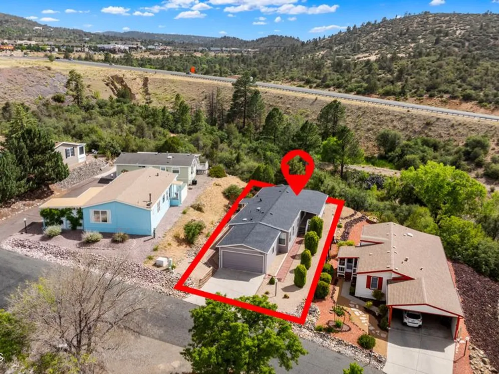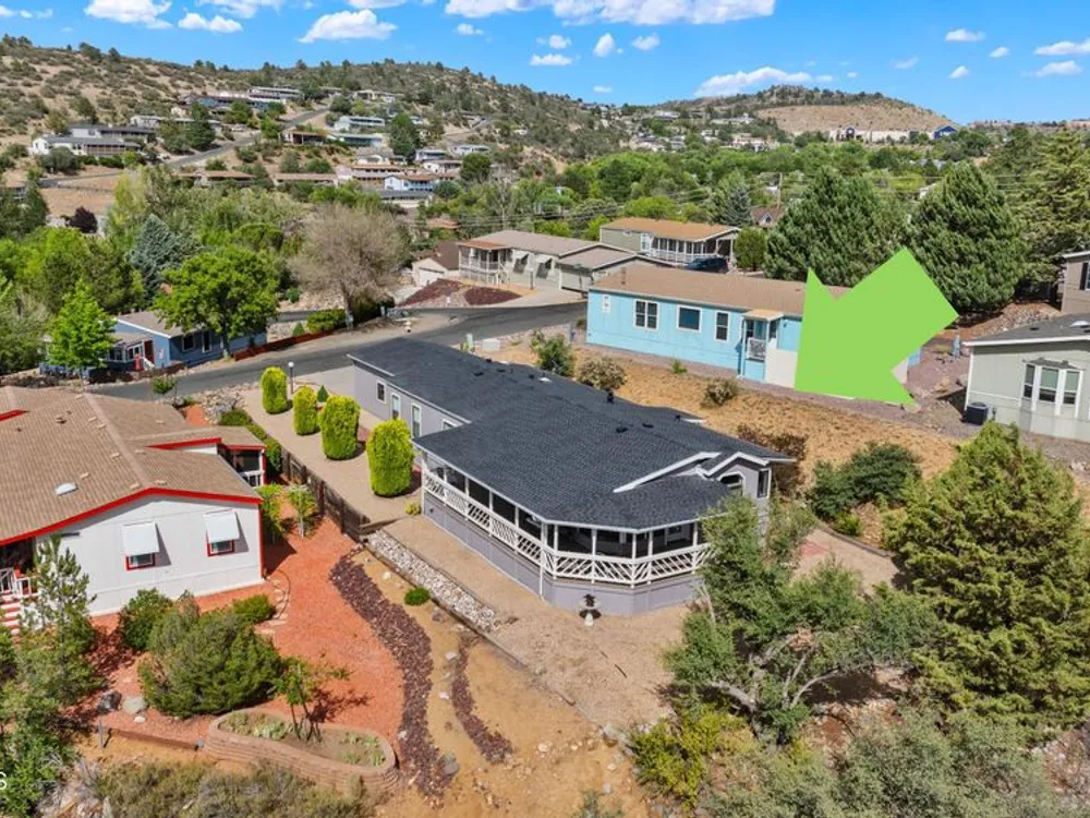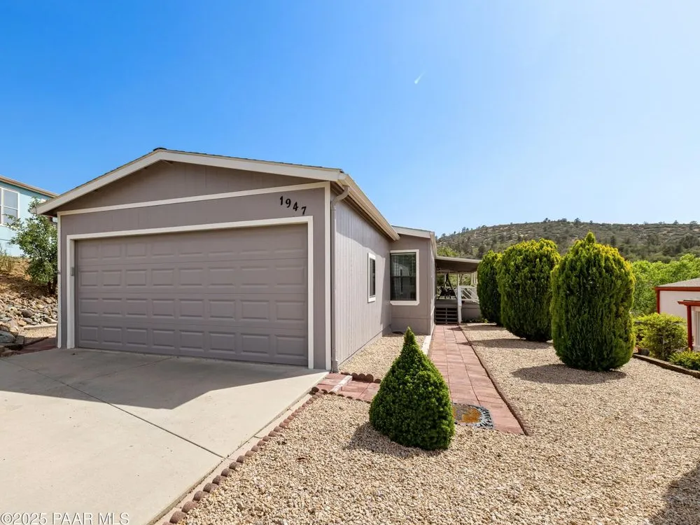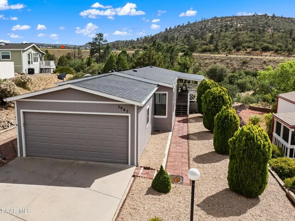 This manufactured home has undergone an extensive transformation since 2022. Now boasting a modern Kitchen while showcasing stunning mountain vistas. Most recently the exterior and deck were painted and a new roof with a transferable warranty was installed. Upgraded main suite bath with double sinks, plush carpeting in the bedrooms and luxury vinyl plank flooring elsewhere. Vaulted Ceilings in all rooms. Large windows allow one to fully appreciate the surrounding scenery. Wrap around covered deck facilitates outdoor living and enjoyment of the views. Large backyard provides additional privacy. Two Car Garage w/storage space and walkway to the side Laundry/Pantry Entry. Furnishings are available for purchase outside of Escrow. This is a quite 55 & Older Community centrally located in Prescott.