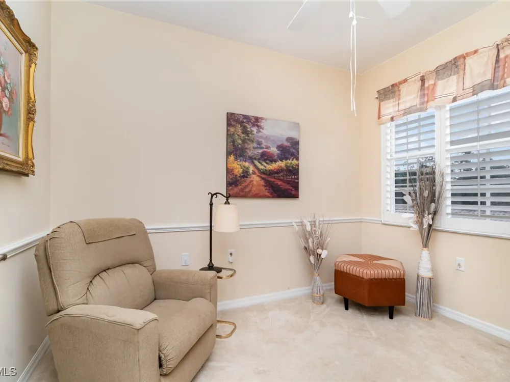 Relax out on the lanai and enjoy the tranquil preserve views from this 2nd floor 2 bedroom + den garden home with a detached 1 car garage located in The Legends Golf & Country Club. This unit comes turn key furnished with a social membership. Additional features are tile on the diagonal in the living areas and baths, carpet in the bedrooms & den, hurricane impact windows & doors, plantation shutters & crown molding. The primary bedroom is spacious with 2 closets & the primary bath has a soaking tub, separate shower and dual sinks. New water heater in 2023 & AC system new in 2021. New tiled roof 2023. The pool at Thornberry is a short walk from this unit. The Legends clubhouse has been renovated and has outdoor dining at The Sunset Grill, an inside Pub, formal dining room & boasts a resort style pool & spa, state-of-art fitness center, library, huge tennis complex, bocce, pickleball, walking paths & much more! Perfect for full time or seasonal residents.