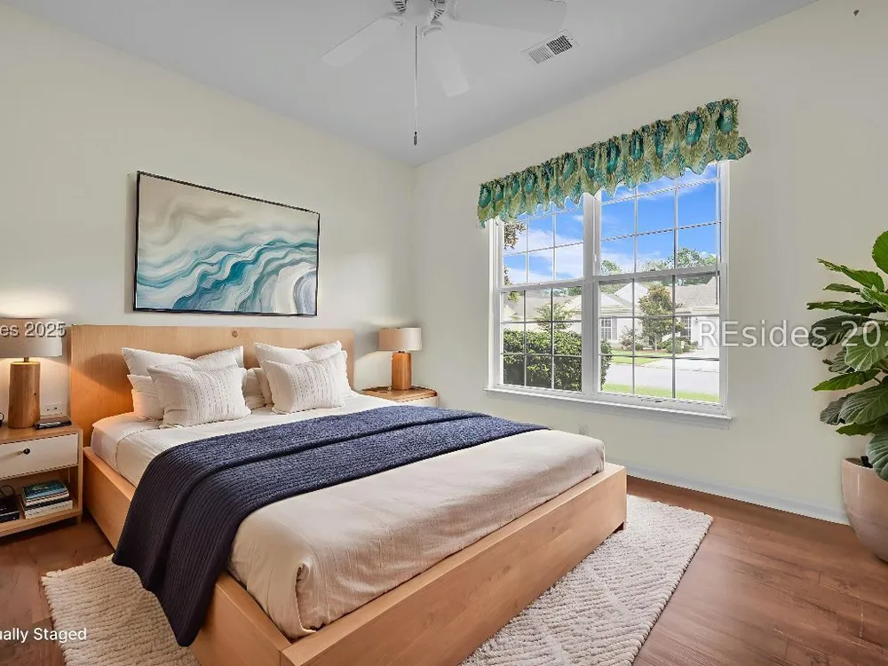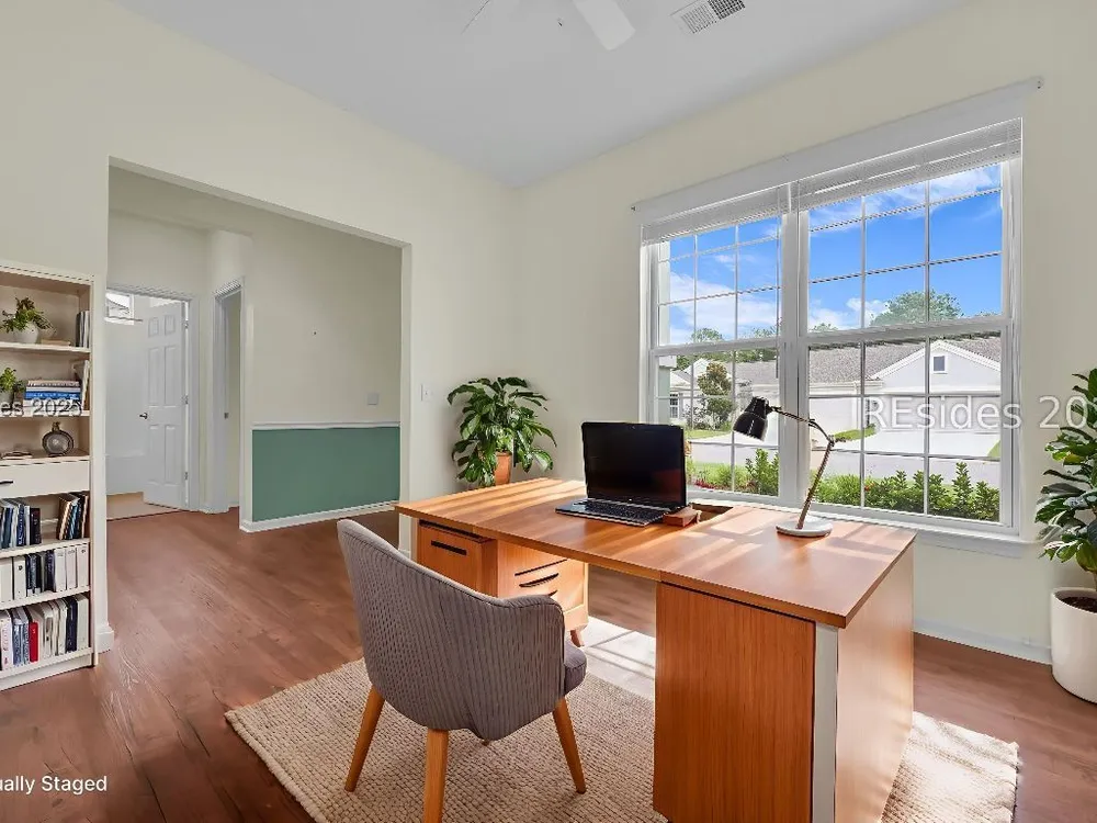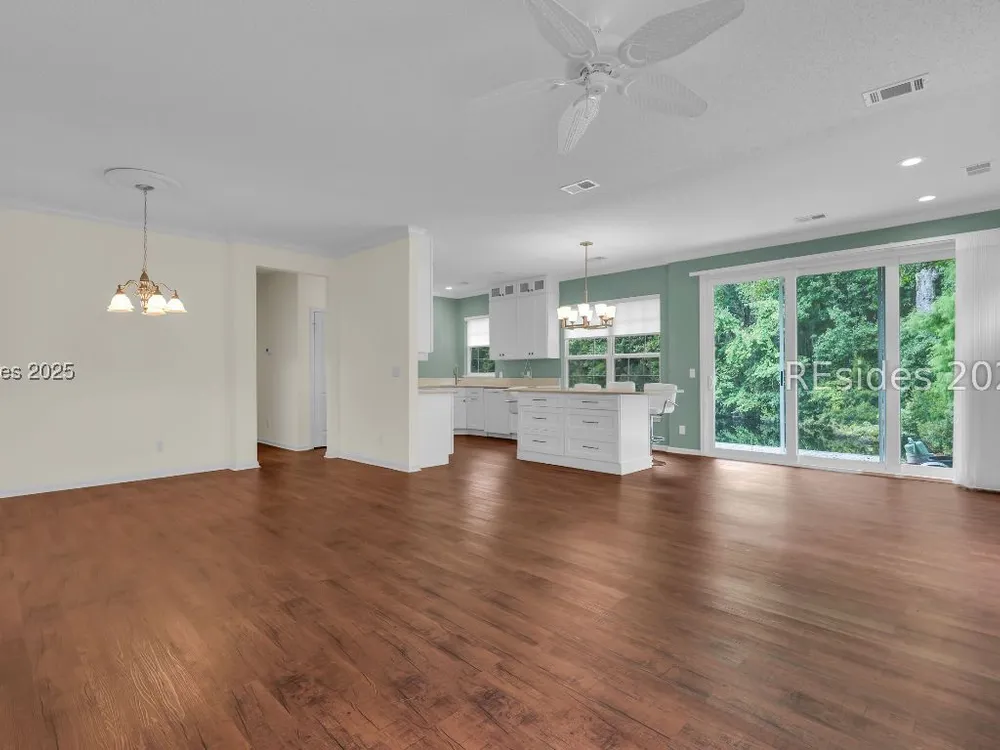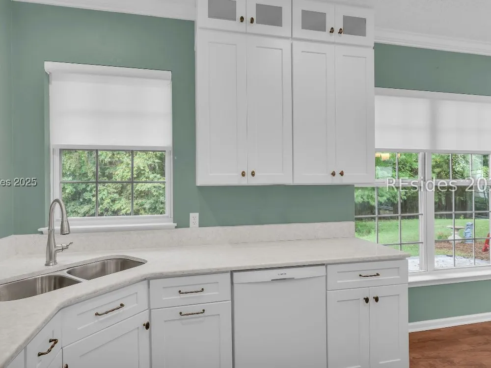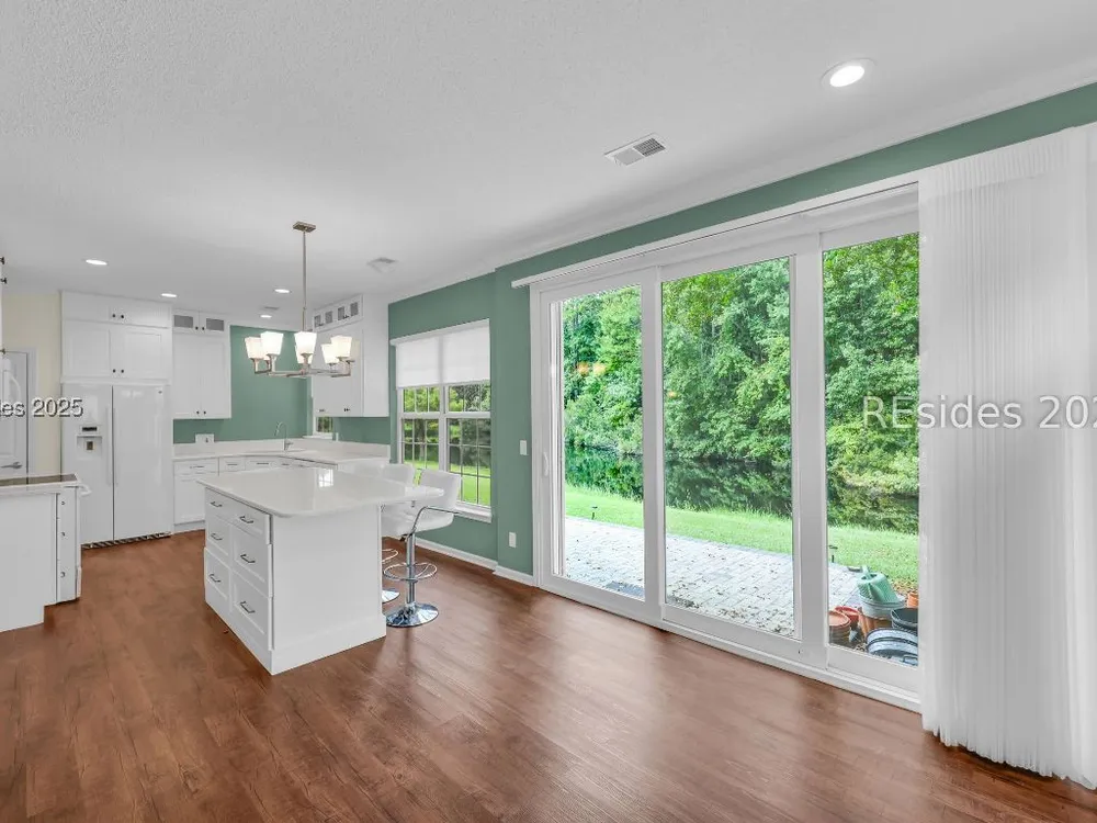 This thoughtfully expanded Wren villa in Sun City is unlike any others, offering modern living with a low-maintenance appeal. The light-filled kitchen has been reimagined with ceiling-height white cabinetry, updated counters, and the rare addition of a large center island providing additional living and entertaining space not typically seen in this floorplan. Durable LVP flooring runs seamlessly throughout, while remote-controlled custom blinds add convenience and style. Other notable upgrades include crown molding in the main living area and entry way. Step outside to a paver patio and take in tranquil lagoon-to-wooded views, the perfect backdrop for entertaining or relaxing. Beyond your door, Sun City's world-class amenities await three golf courses, six pools, pickleball and tennis courts, walking trails, and over 100 clubs ensuring every day is as active or relaxed as you choose.
